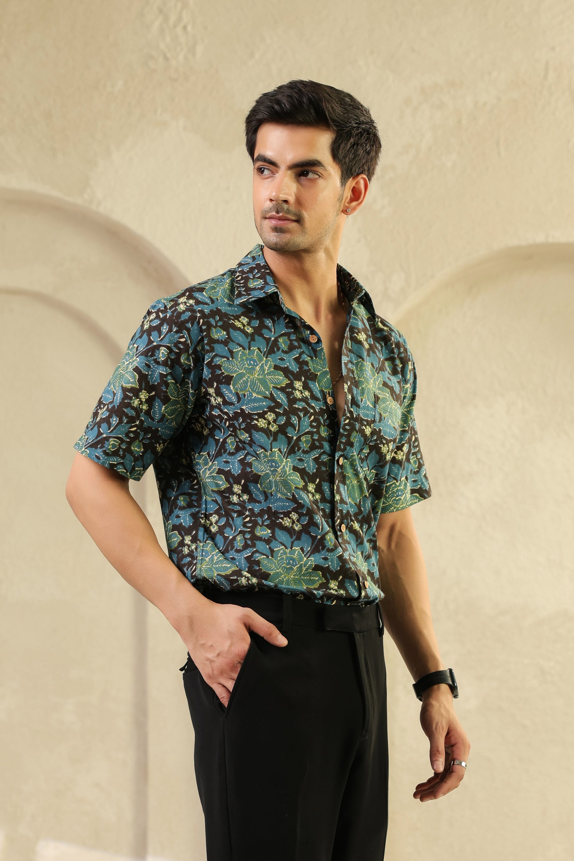 The earthy blend of green and brown in this floral print feels timeless, like nature captured in fabric. Crafted from pure cotton, it’s soft yet full of character, allowing ease and breathability through every wear. The hand stitching adds a quiet strength, while the screen-printed blooms bring an effortless charm, made for men who value detail that speaks softly but leaves a mark.