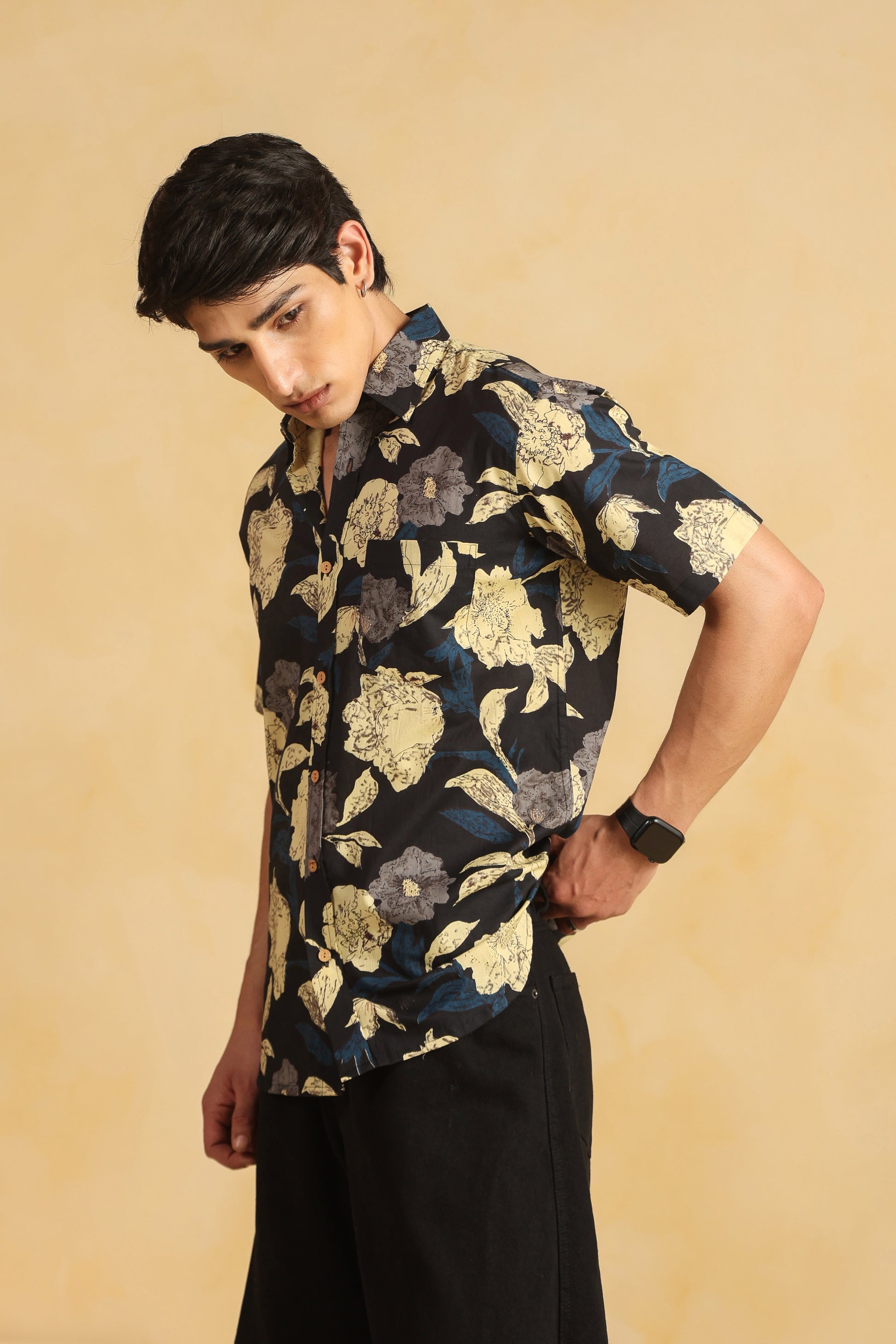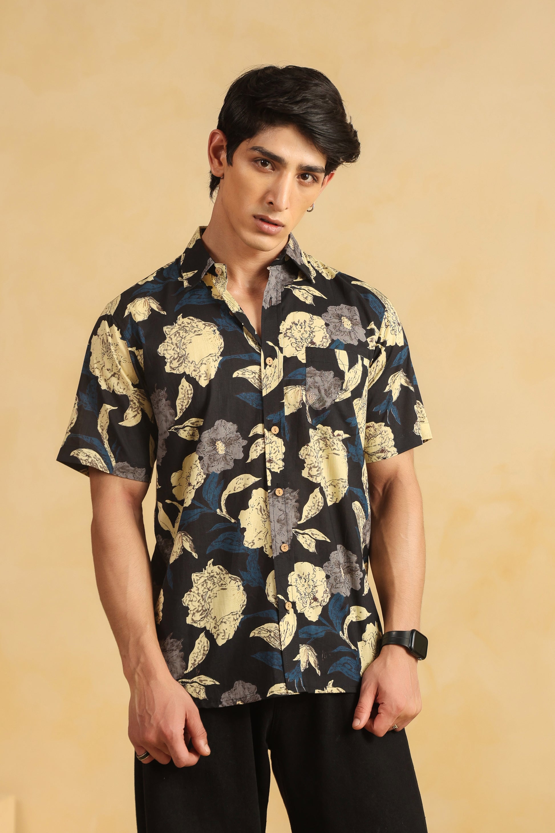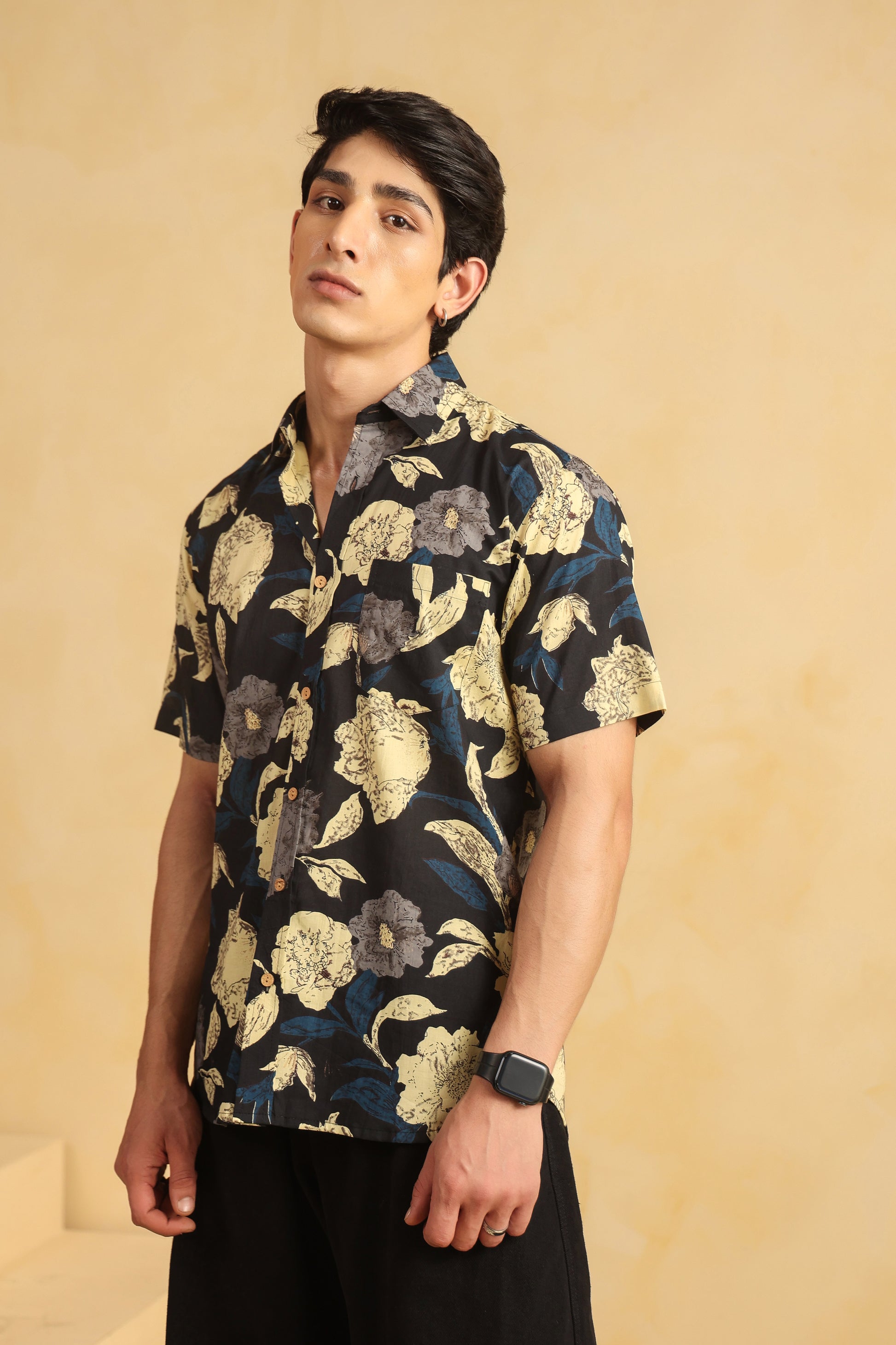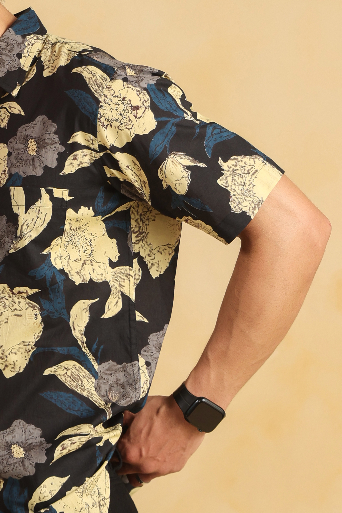 The charcoal base isn’t just a background. It holds the quiet drama of night and the softness of dusk. The florals are drawn from nature’s wild stillness, reimagined for today. There is movement in the print, bold but not loud, expressive yet calm. Just like the man who chooses to wear it.
