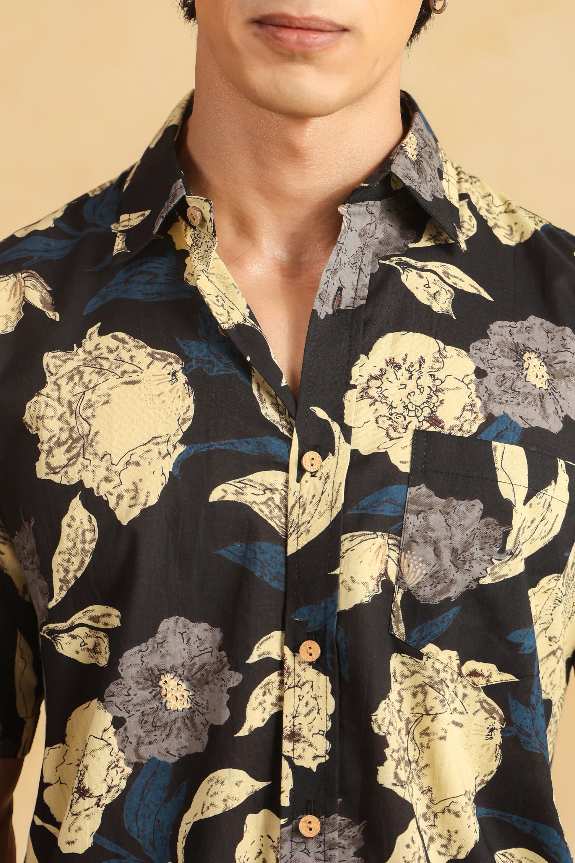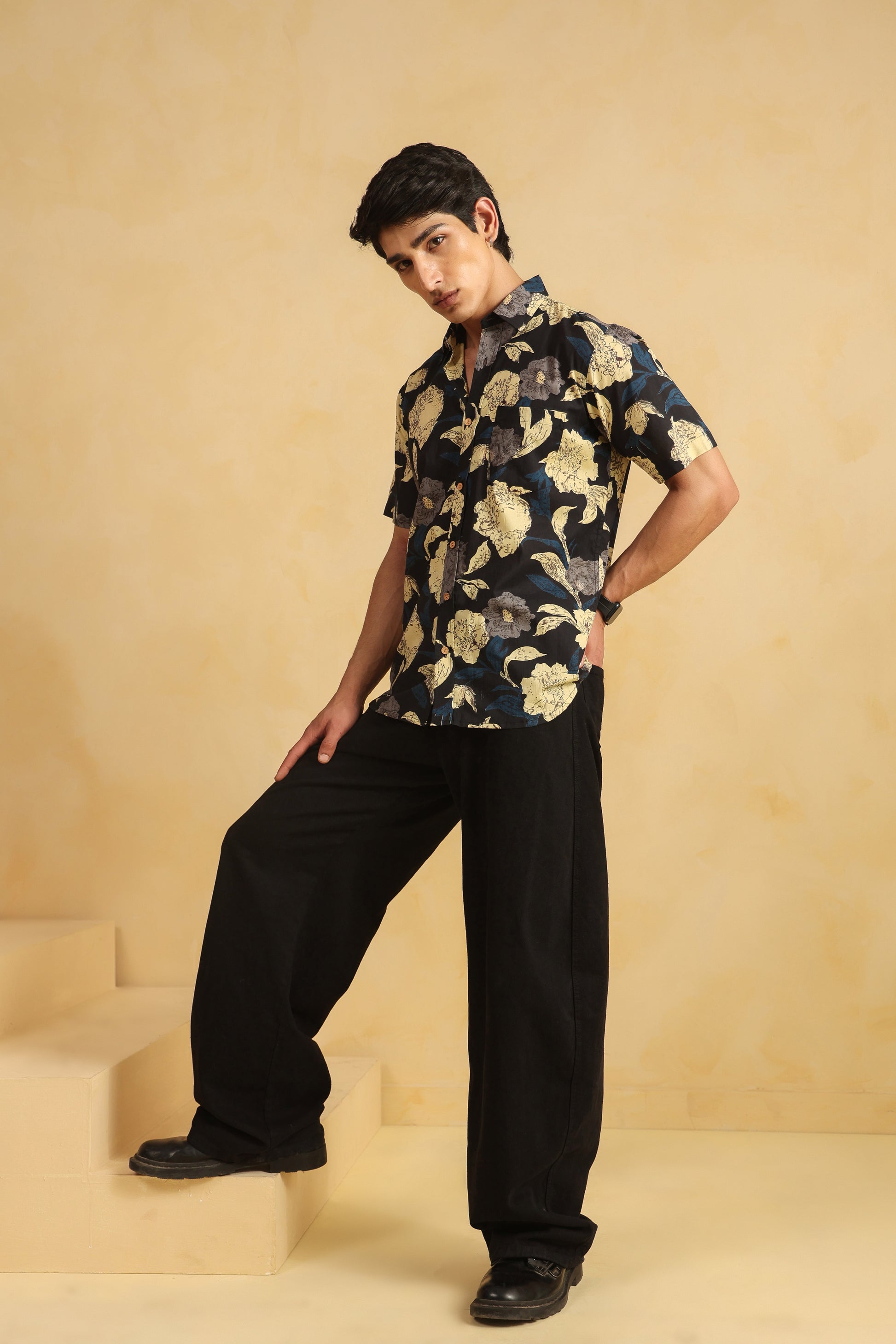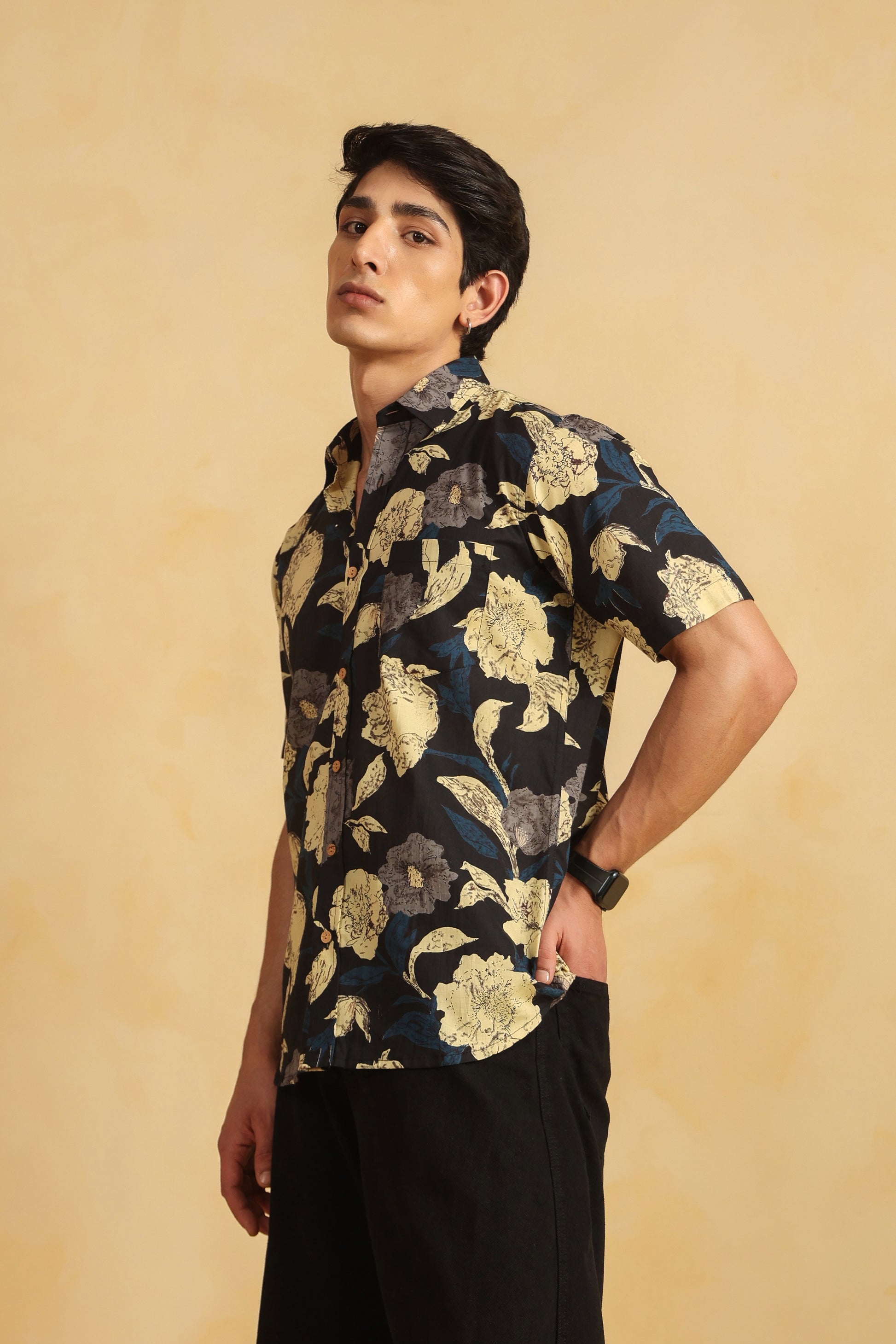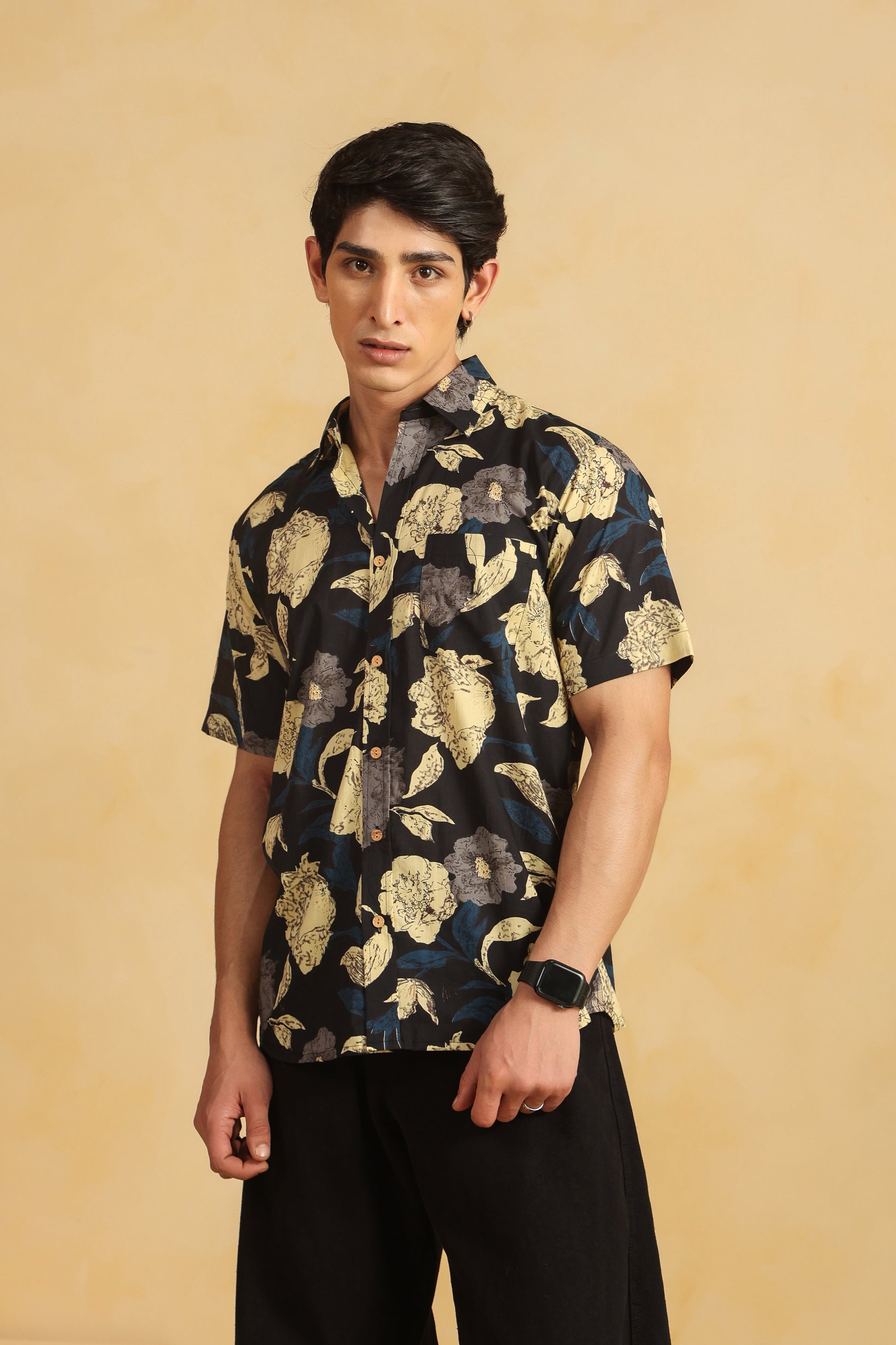 The charcoal base isn’t just a background. It holds the quiet drama of night and the softness of dusk. The florals are drawn from nature’s wild stillness, reimagined for today. There is movement in the print, bold but not loud, expressive yet calm. Just like the man who chooses to wear it.