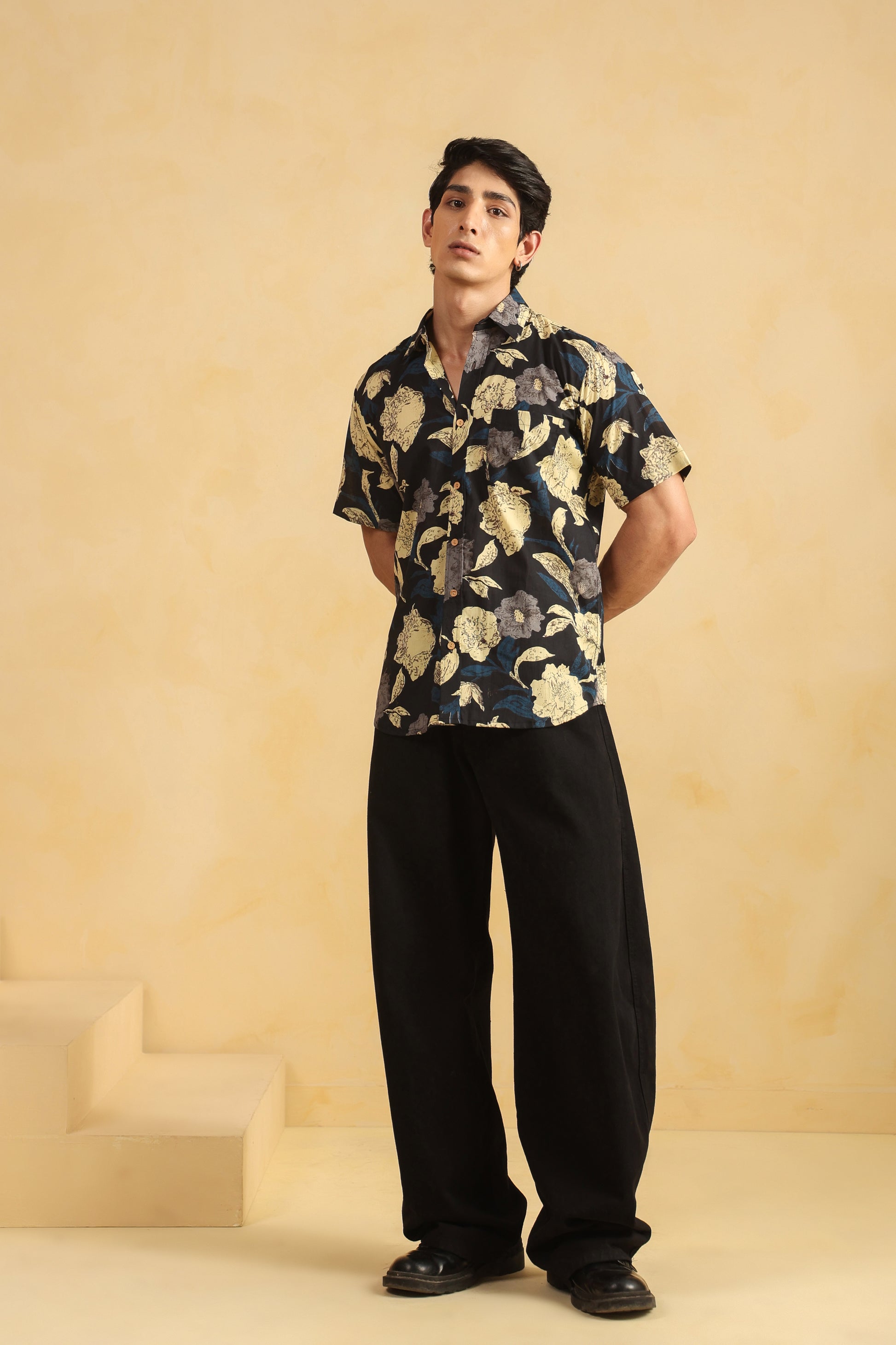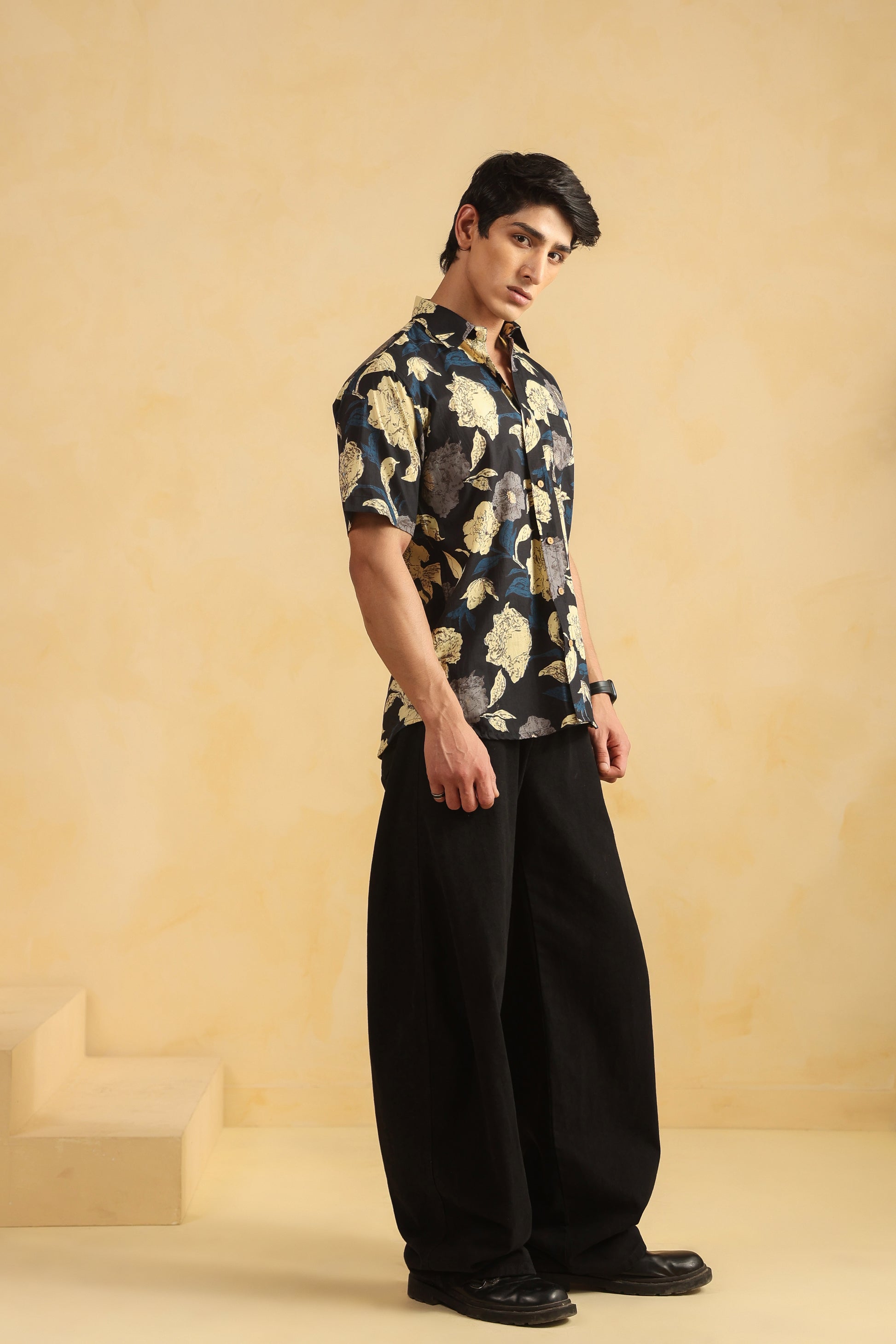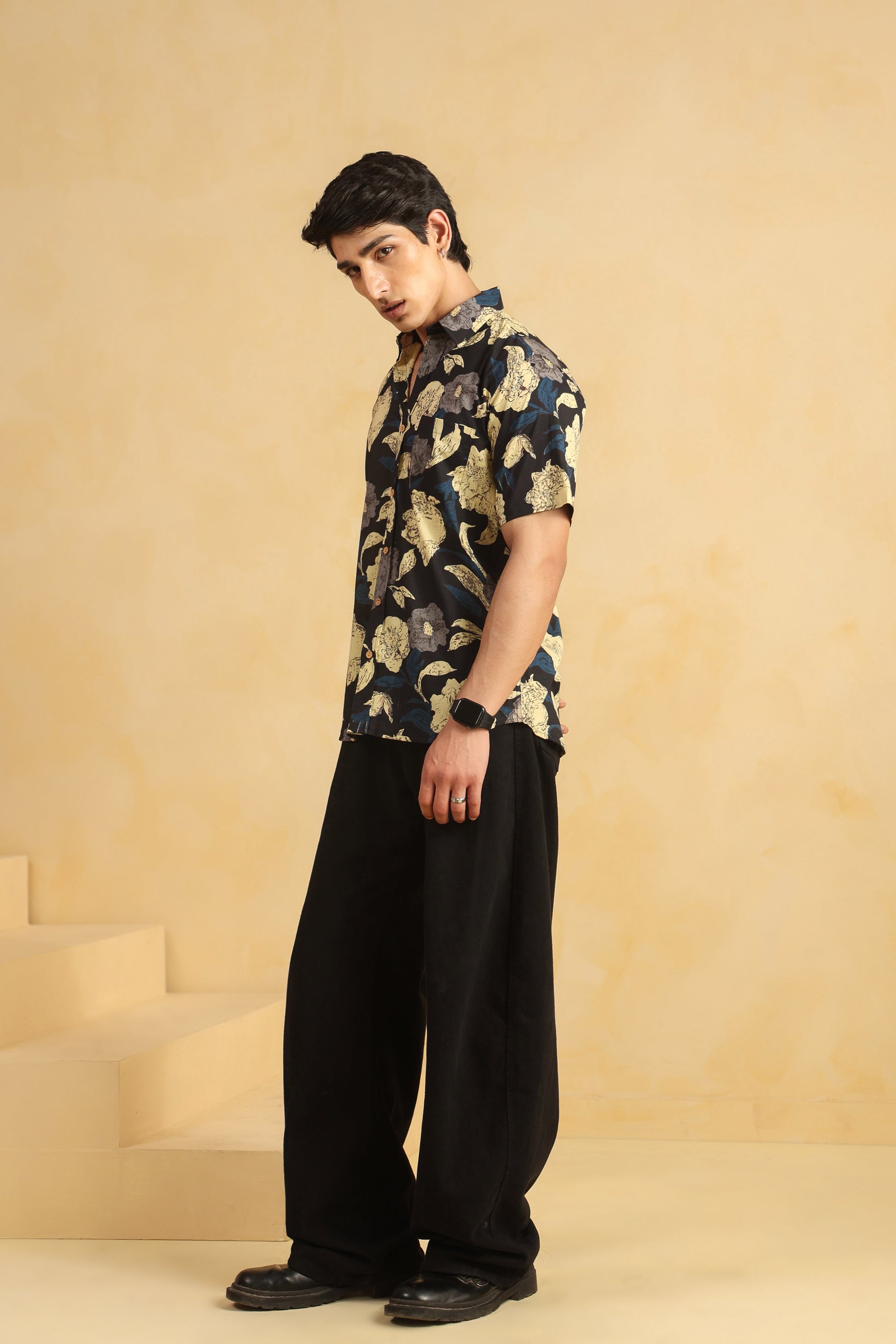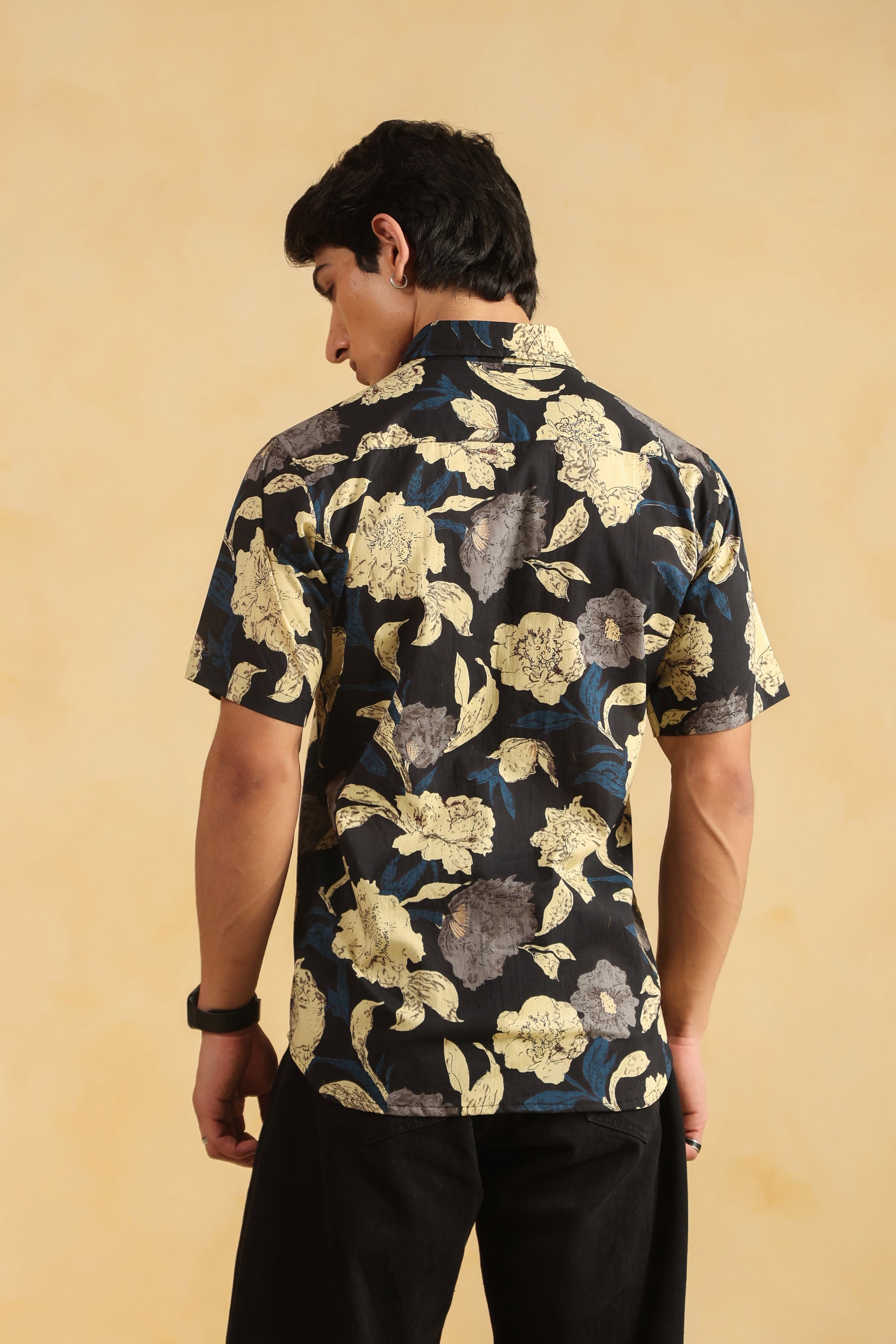 The charcoal base isn’t just a background. It holds the quiet drama of night and the softness of dusk. The florals are drawn from nature’s wild stillness, reimagined for today. There is movement in the print, bold but not loud, expressive yet calm. Just like the man who chooses to wear it.