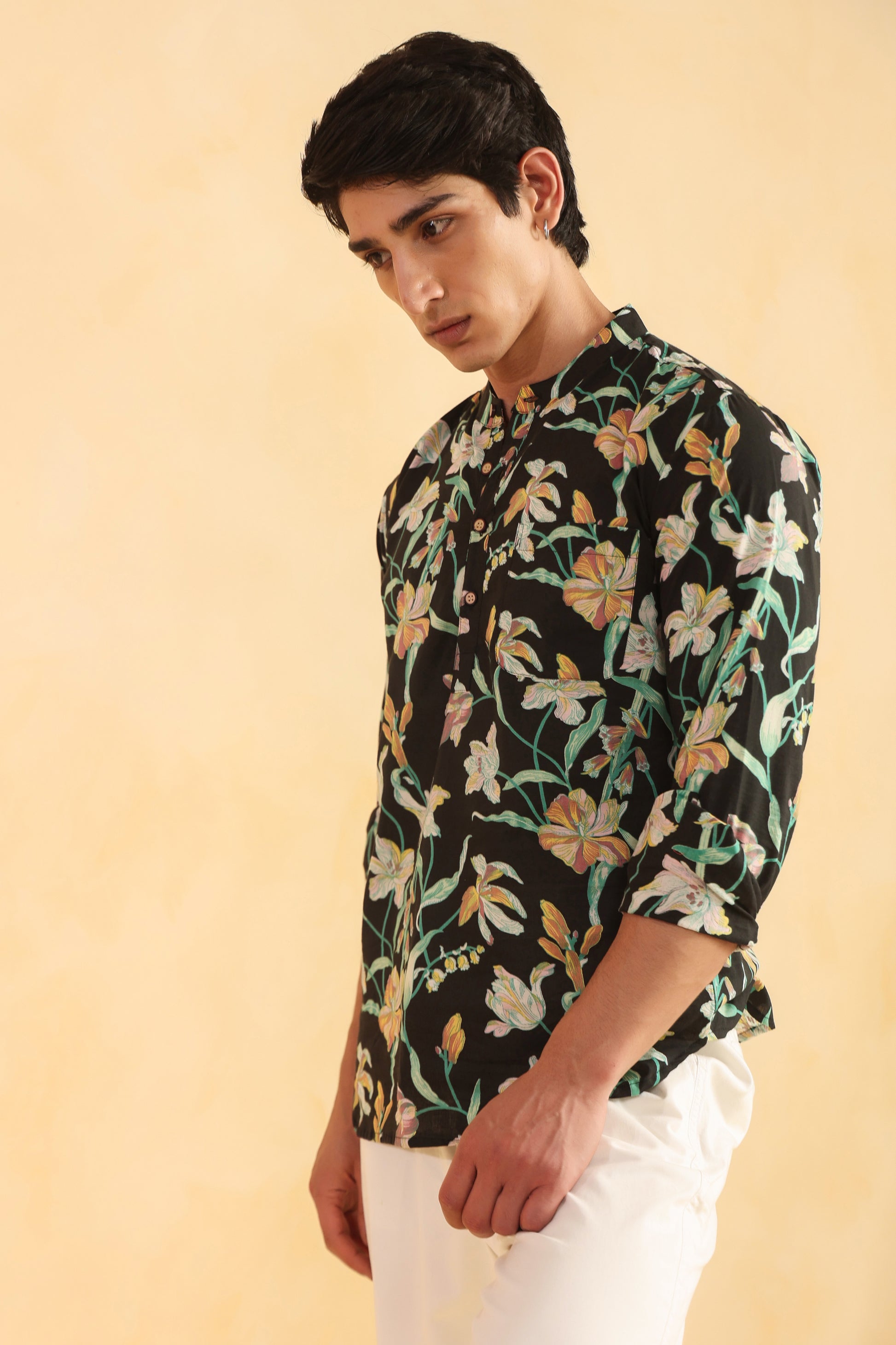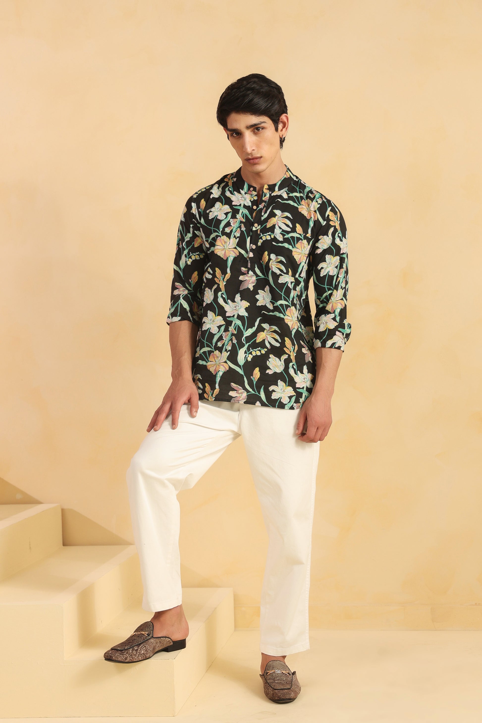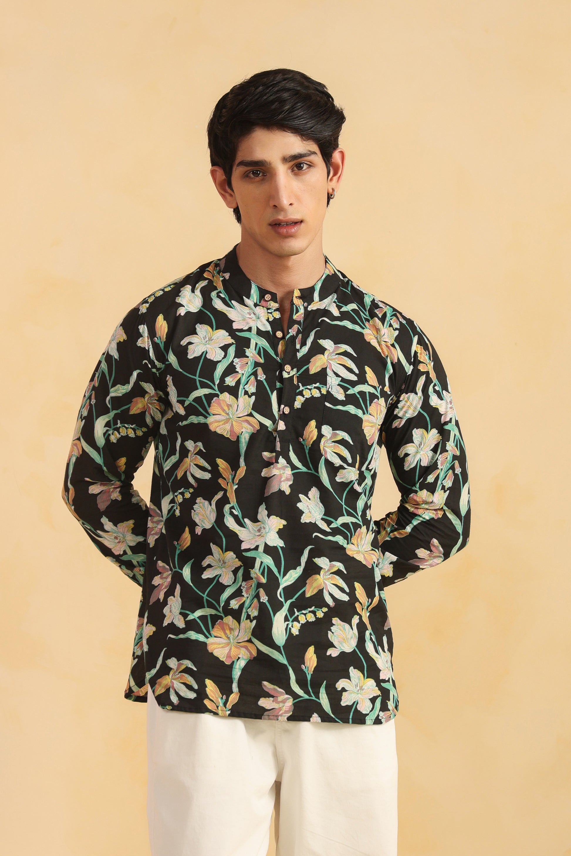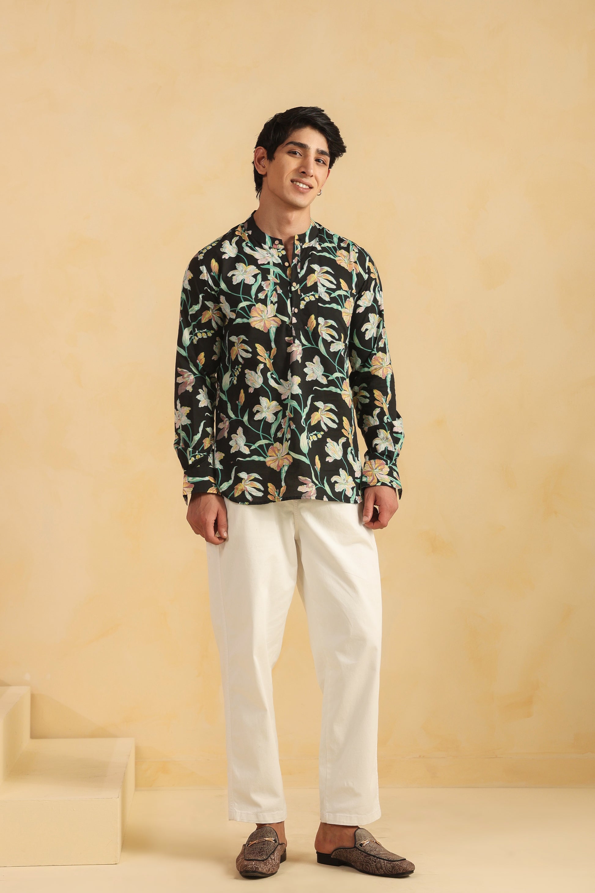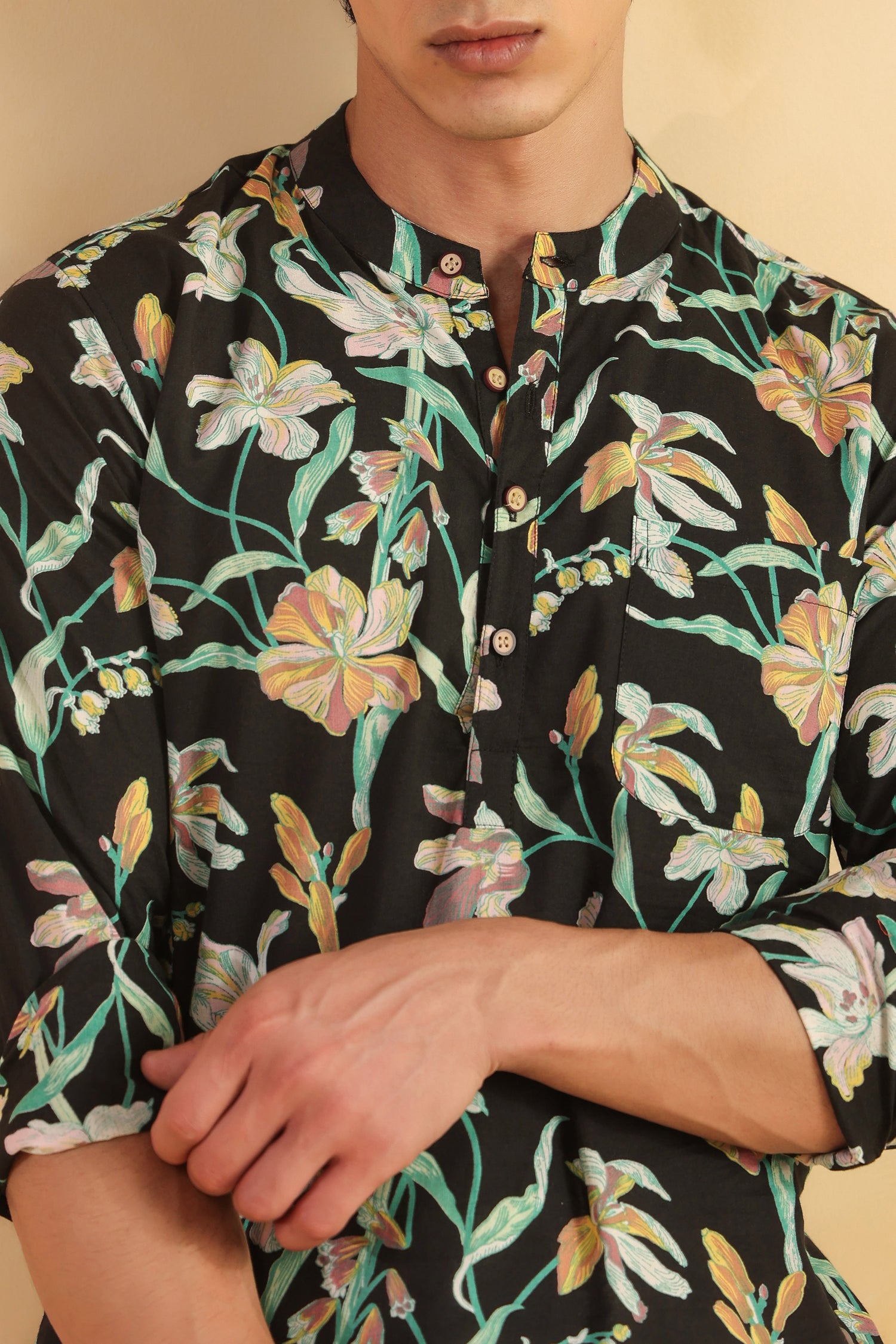 The black canvas of this kurta feels like twilight, calm, deep, and full of quiet beauty. Hand-drawn florals in soft pastels stretch gently across the fabric, each petal like a whisper of spring. It is crafted for the man who sees detail not as decoration, but as depth.