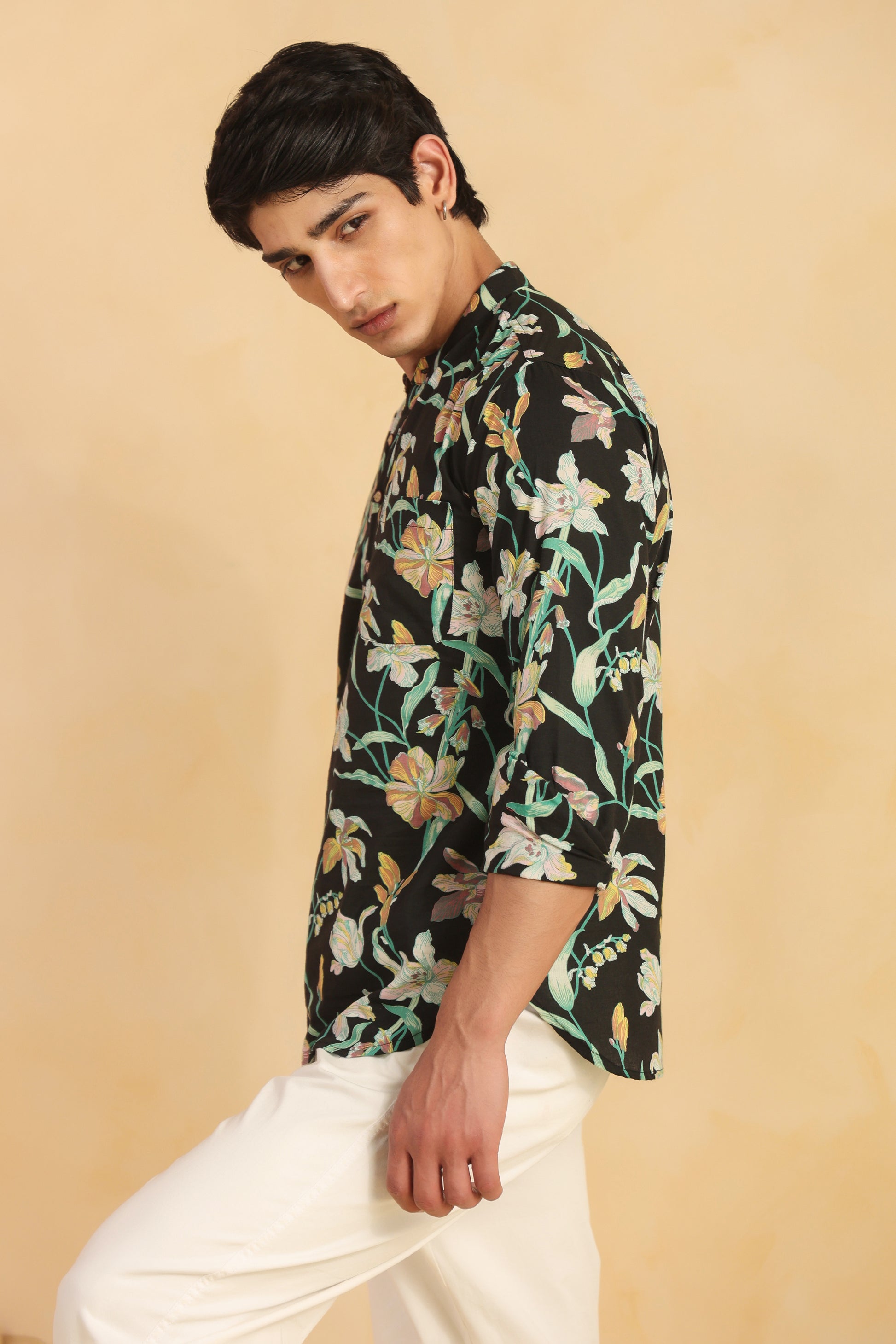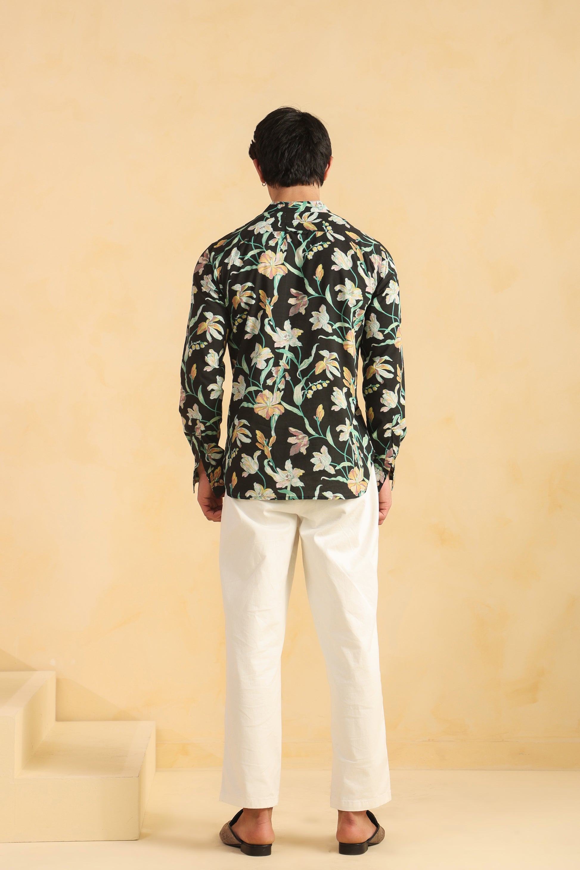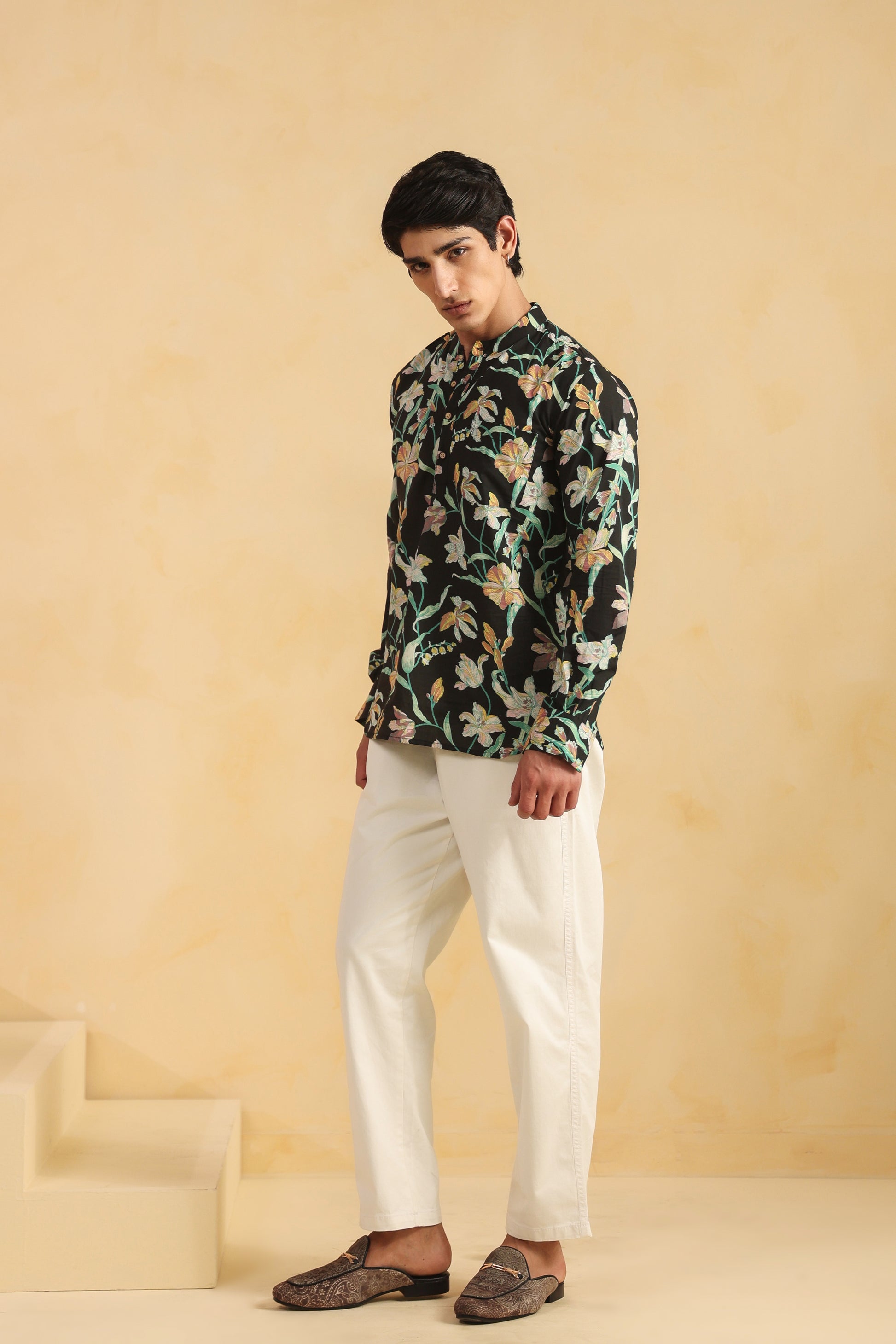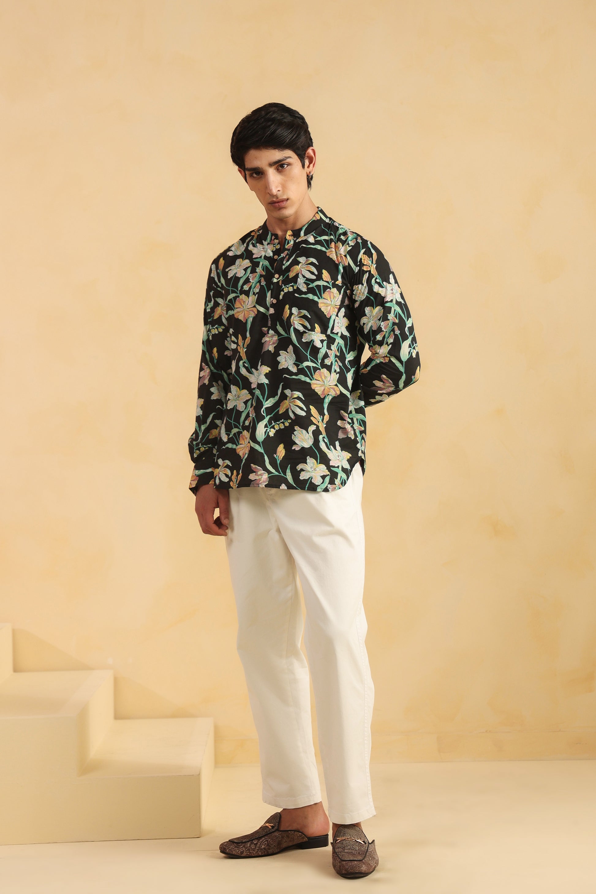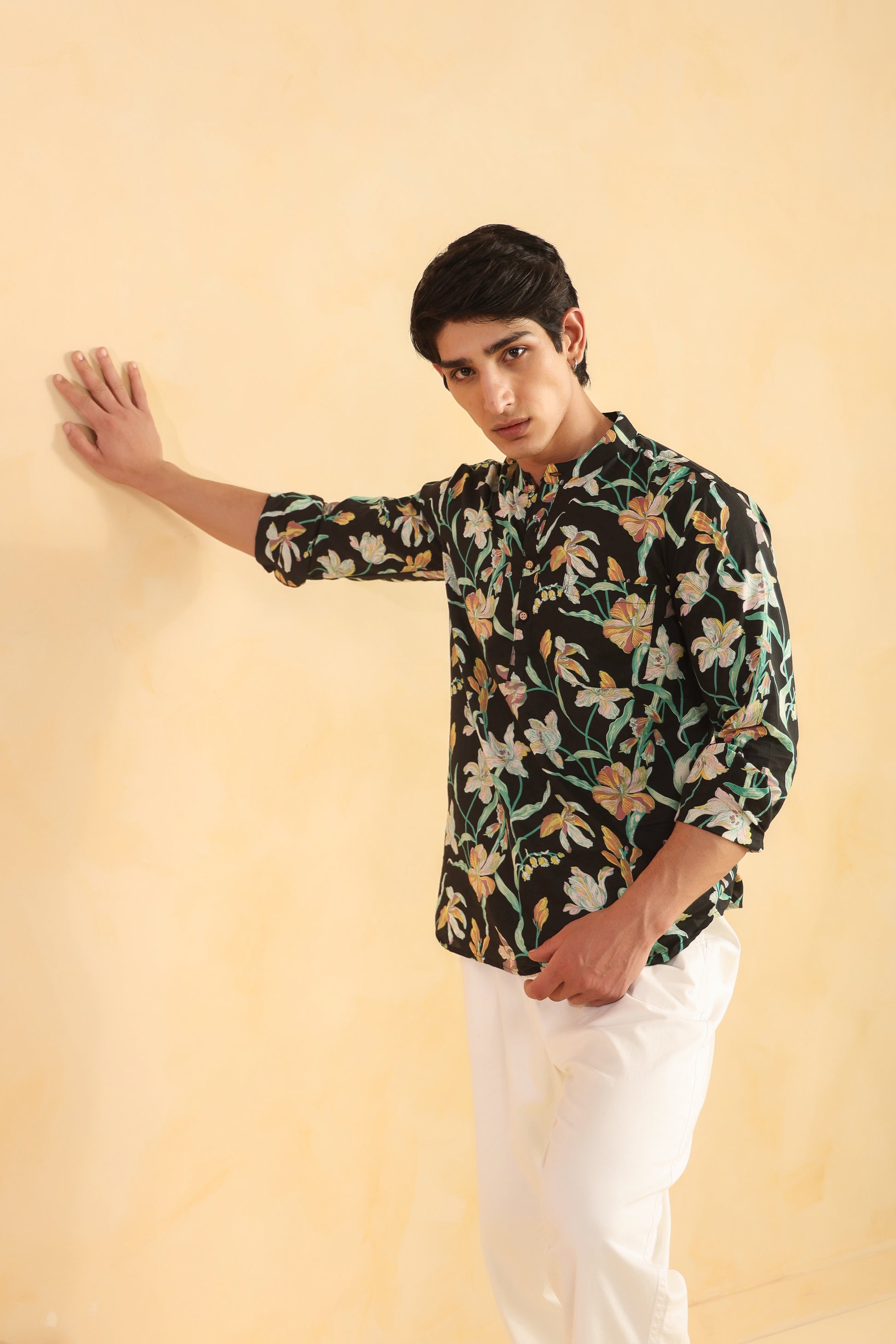 The black canvas of this kurta feels like twilight, calm, deep, and full of quiet beauty. Hand-drawn florals in soft pastels stretch gently across the fabric, each petal like a whisper of spring. It is crafted for the man who sees detail not as decoration, but as depth.
