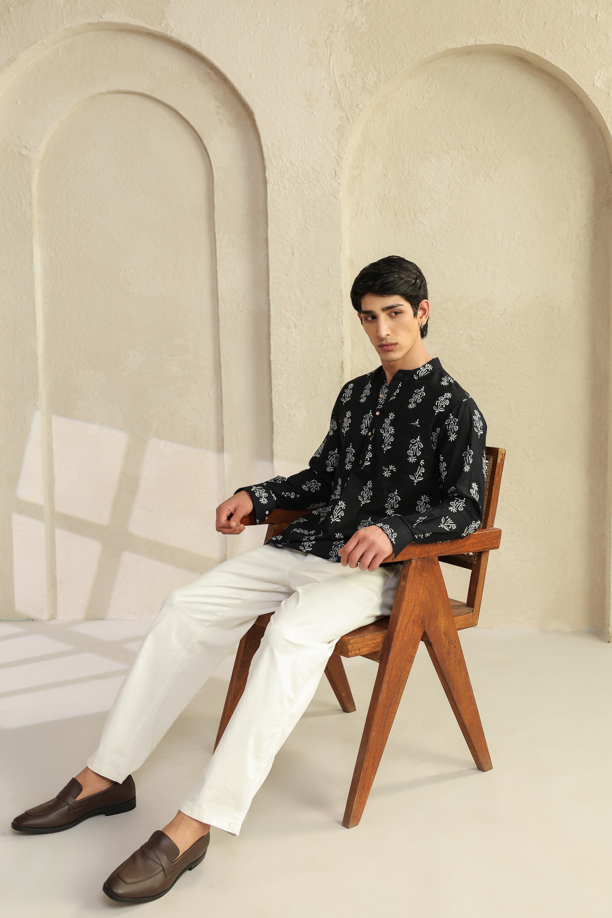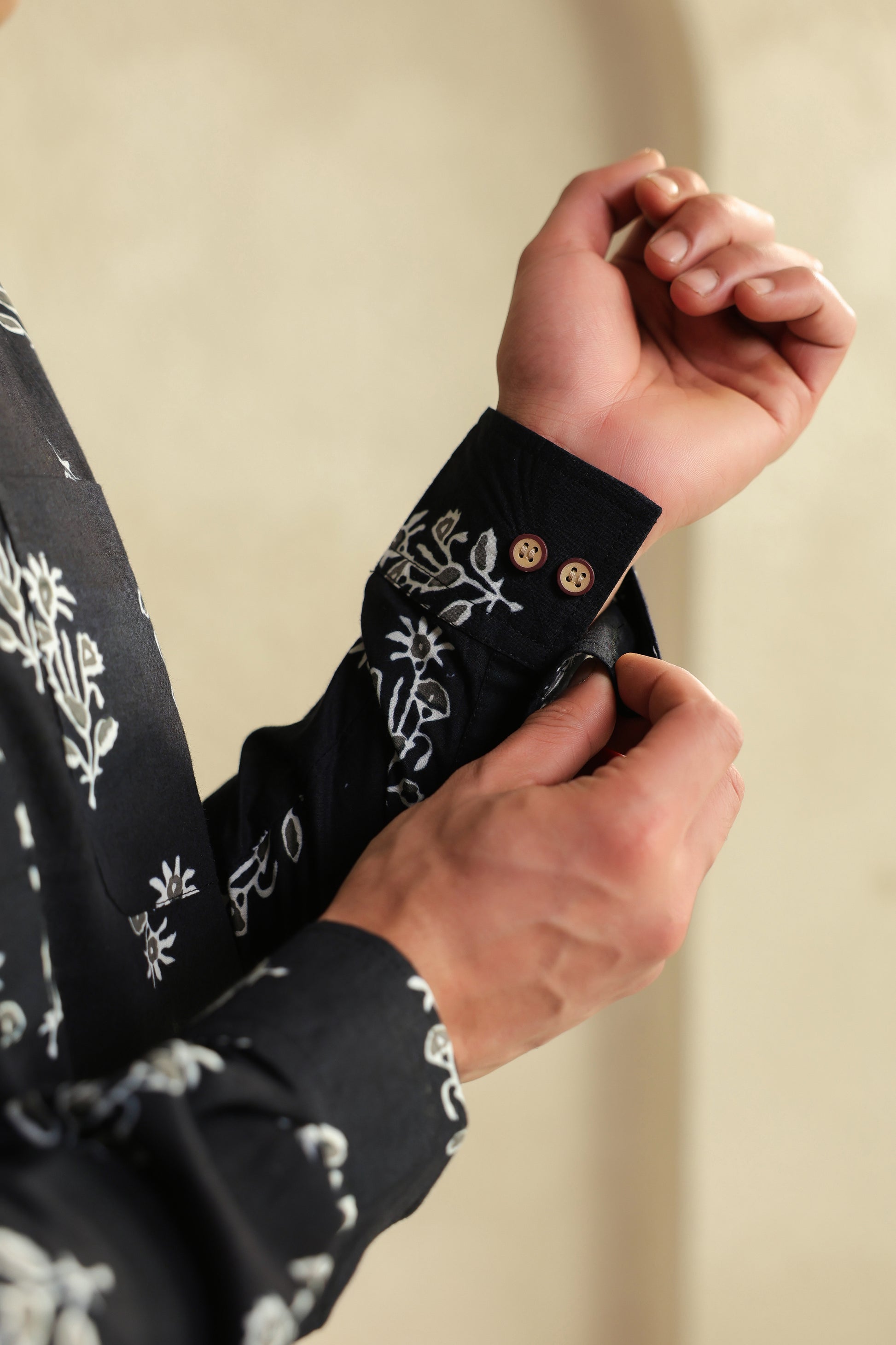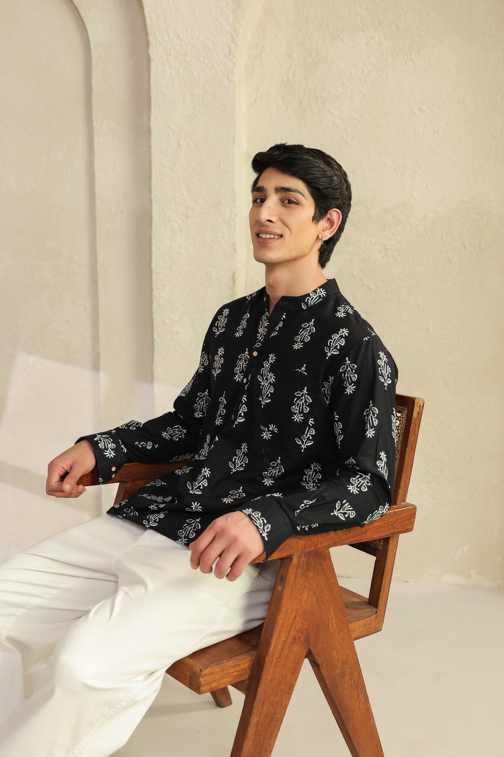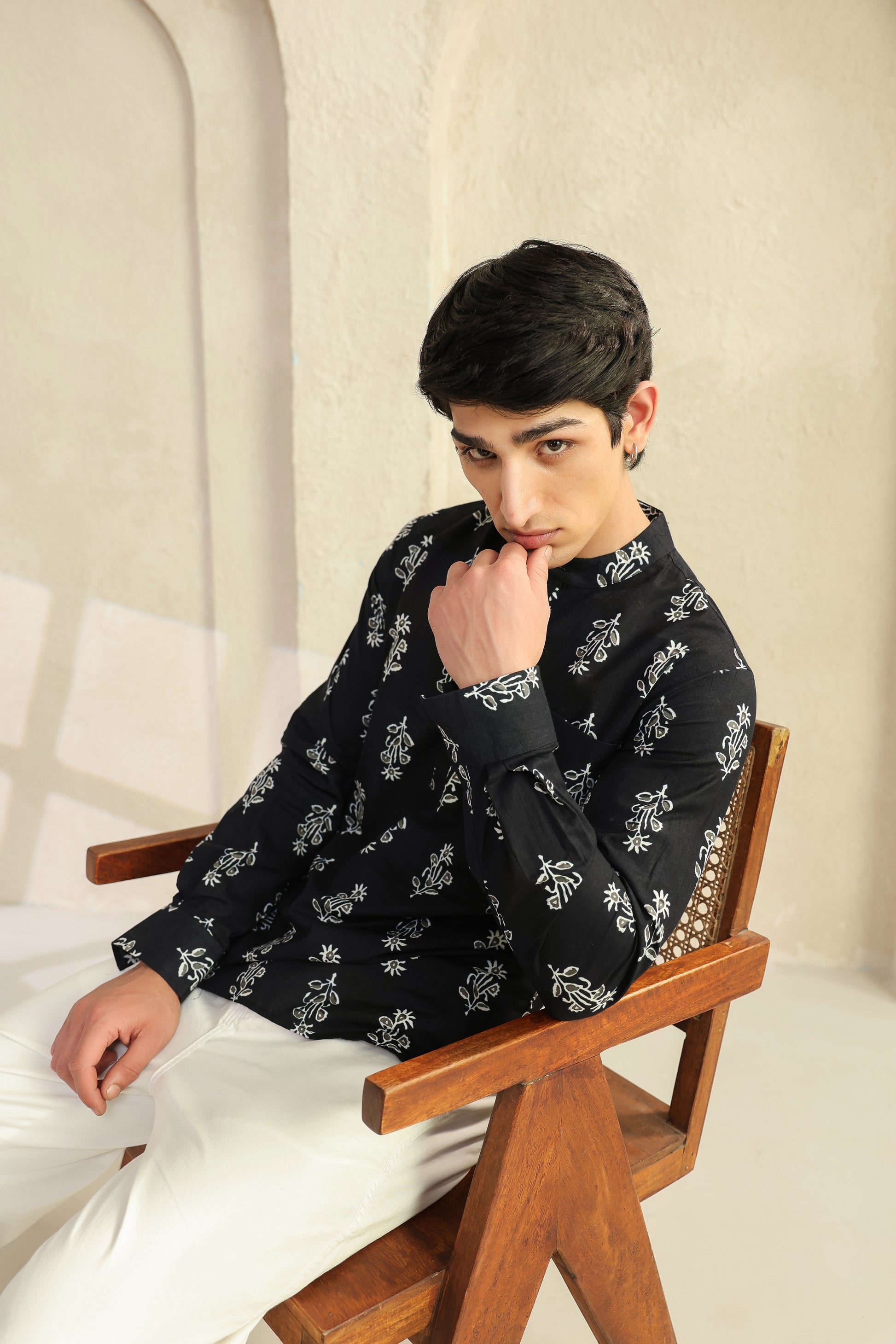 There is something timeless about black and white. This kurta carries that simplicity with quiet confidence. Hand-drawn florals sit gently on pure cotton, stitched with care for men who know that subtlety often speaks the loudest.