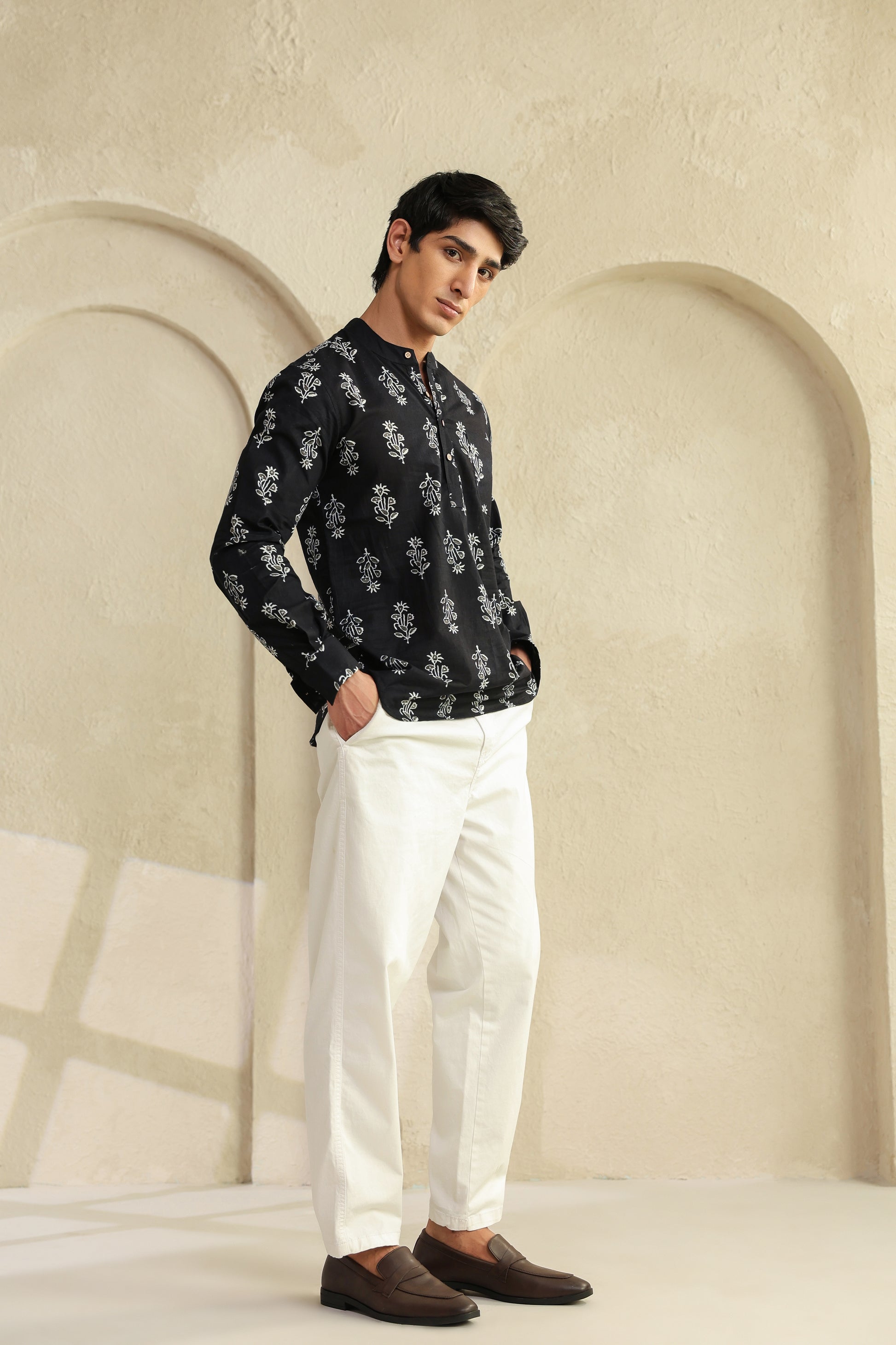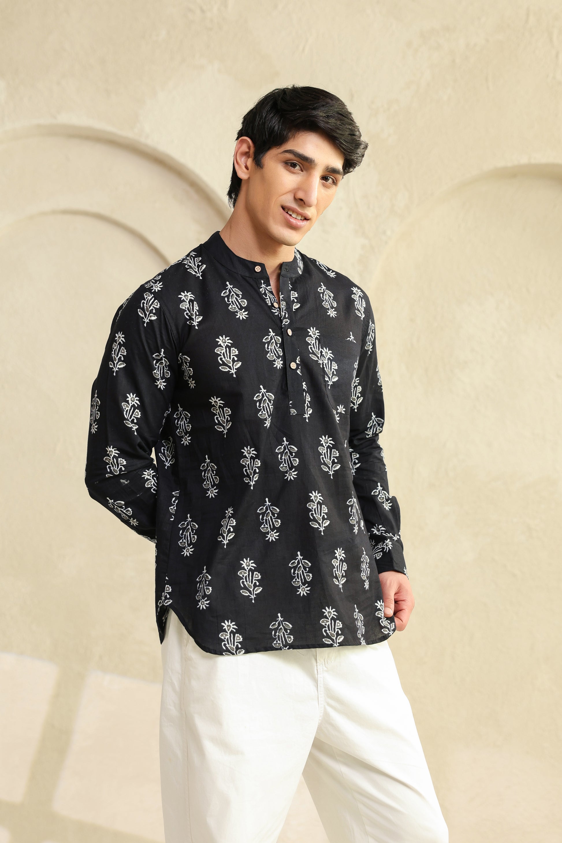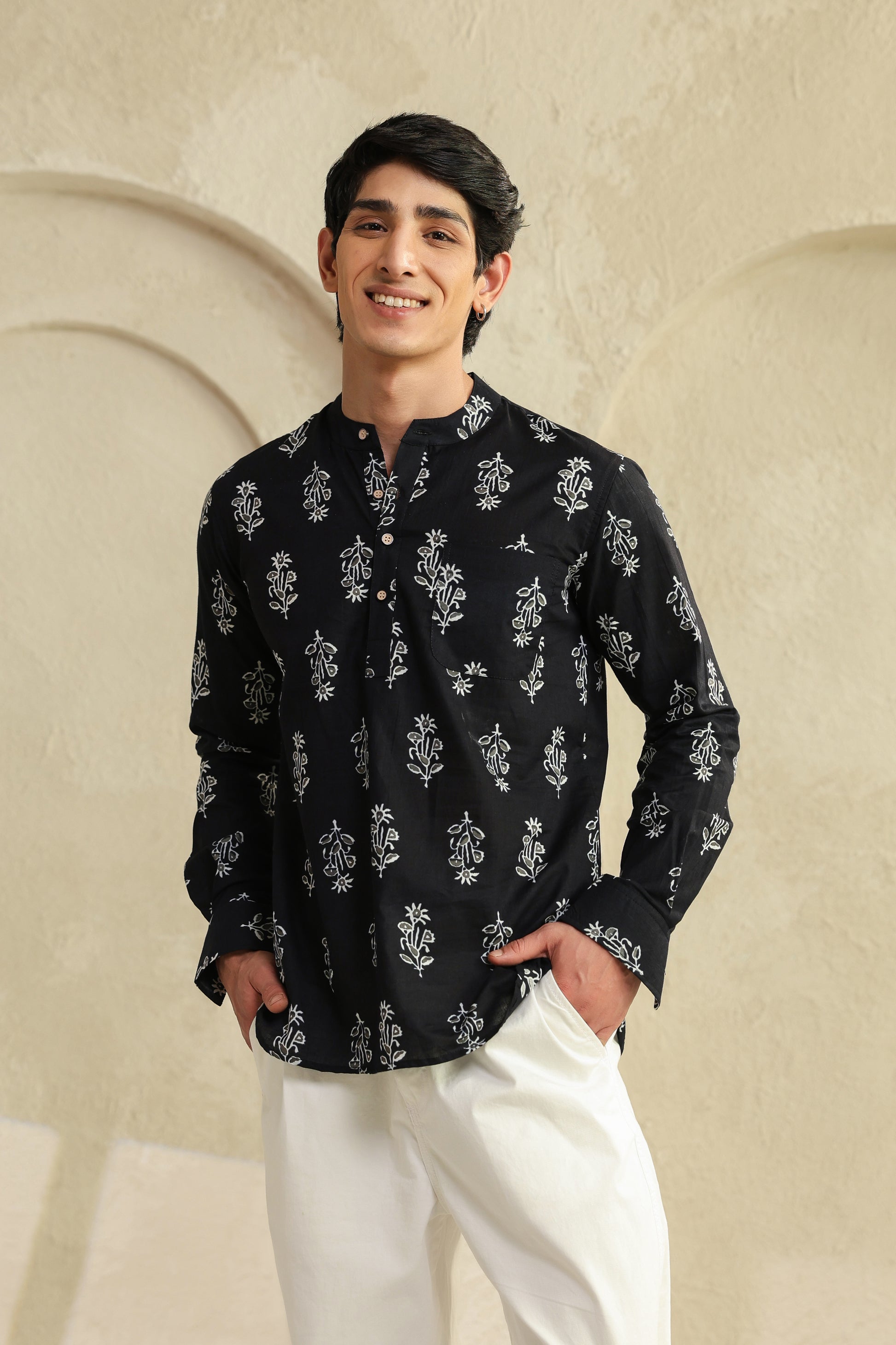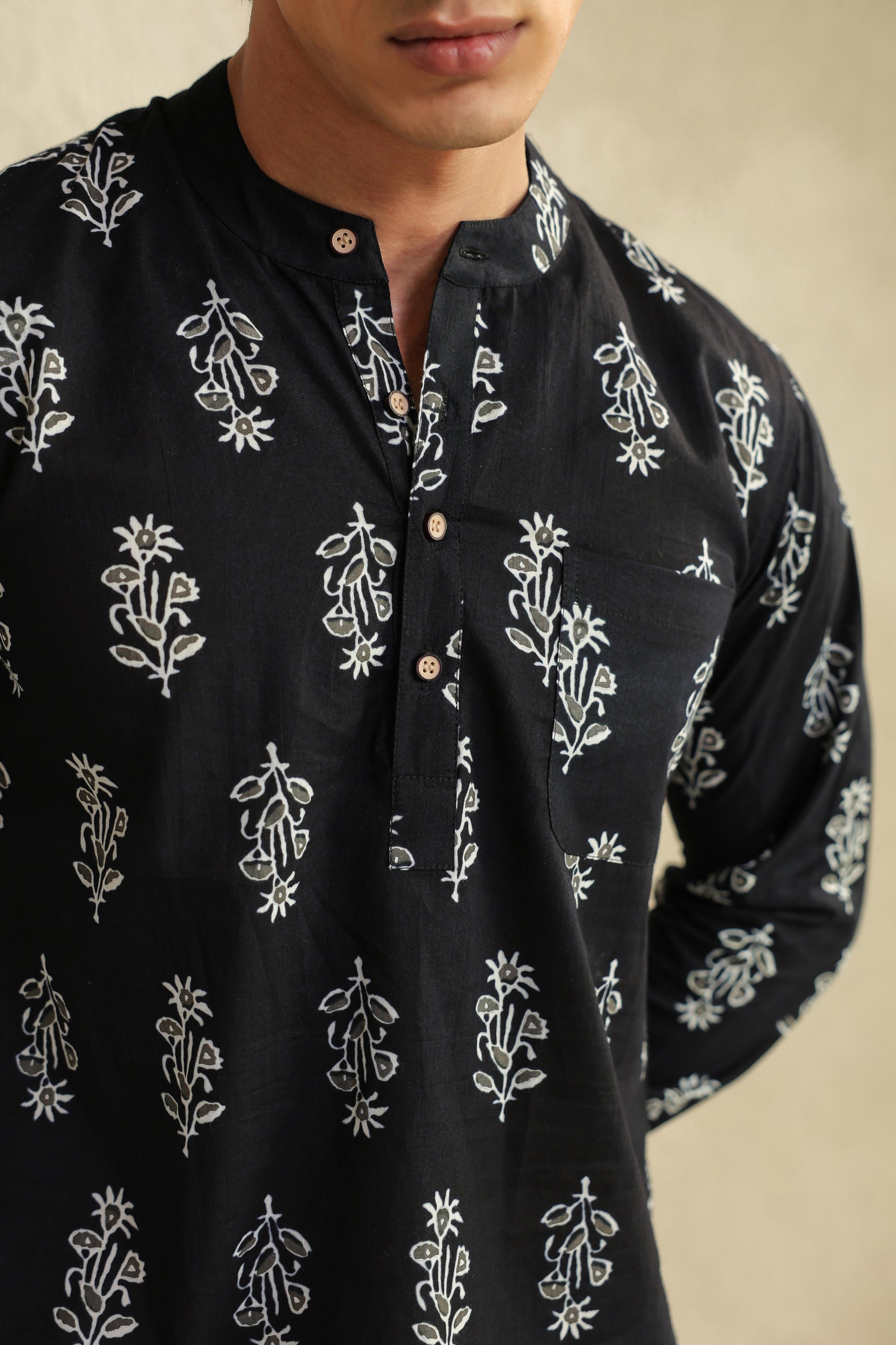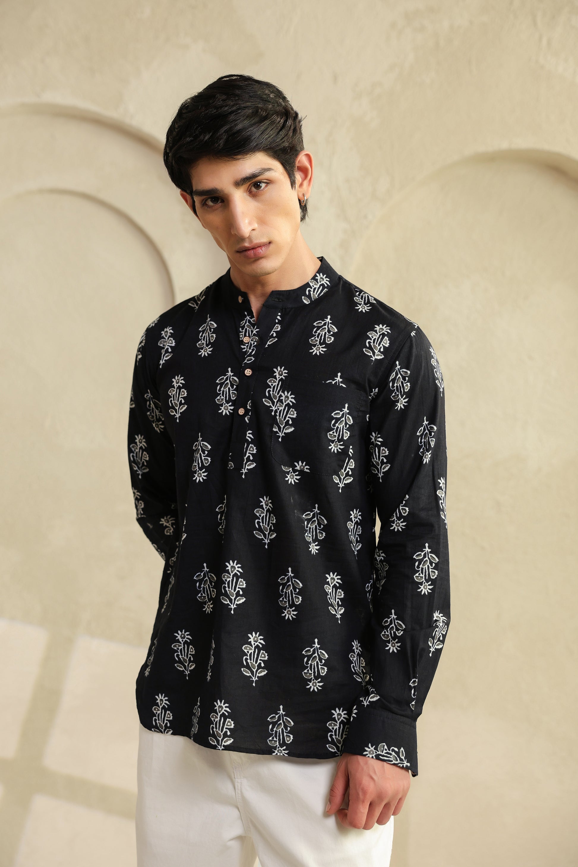 There is something timeless about black and white. This kurta carries that simplicity with quiet confidence. Hand-drawn florals sit gently on pure cotton, stitched with care for men who know that subtlety often speaks the loudest.