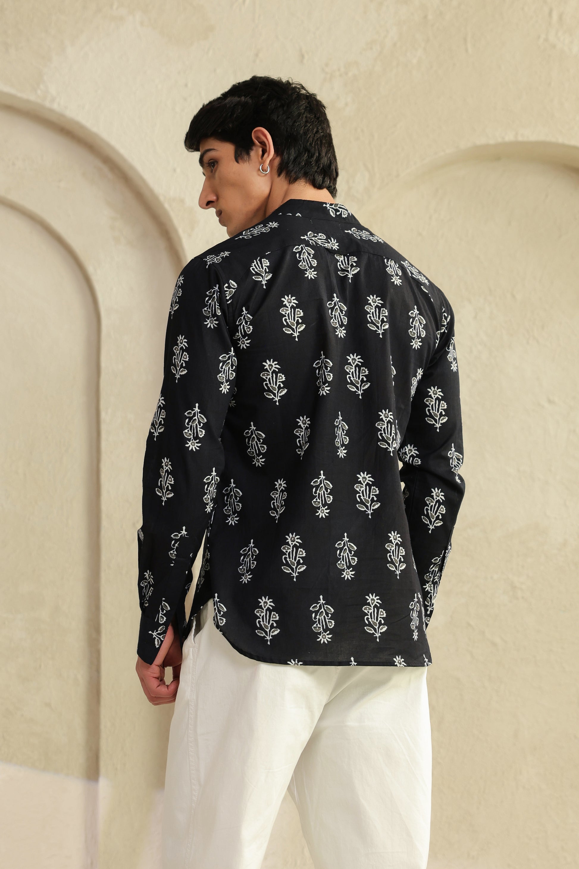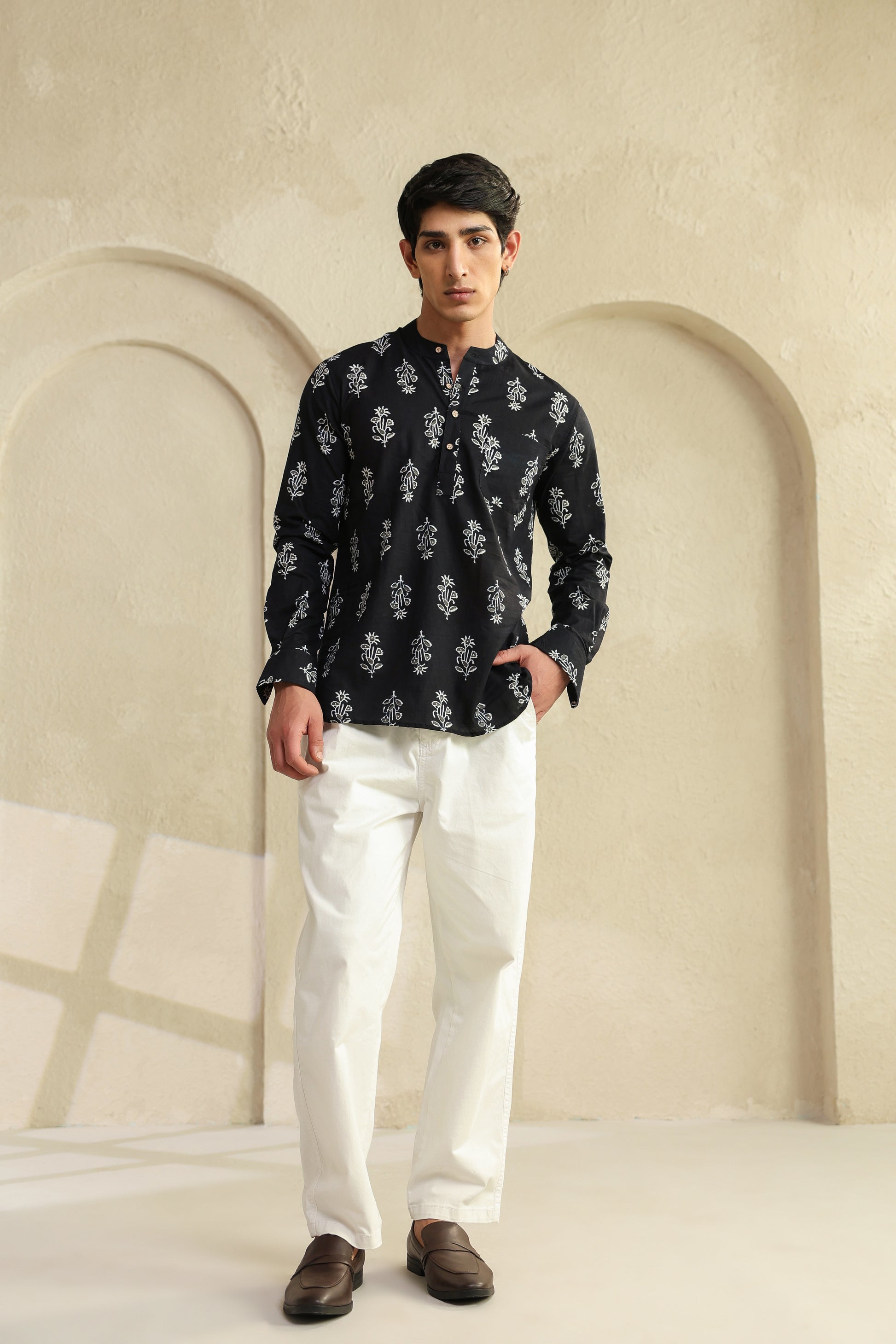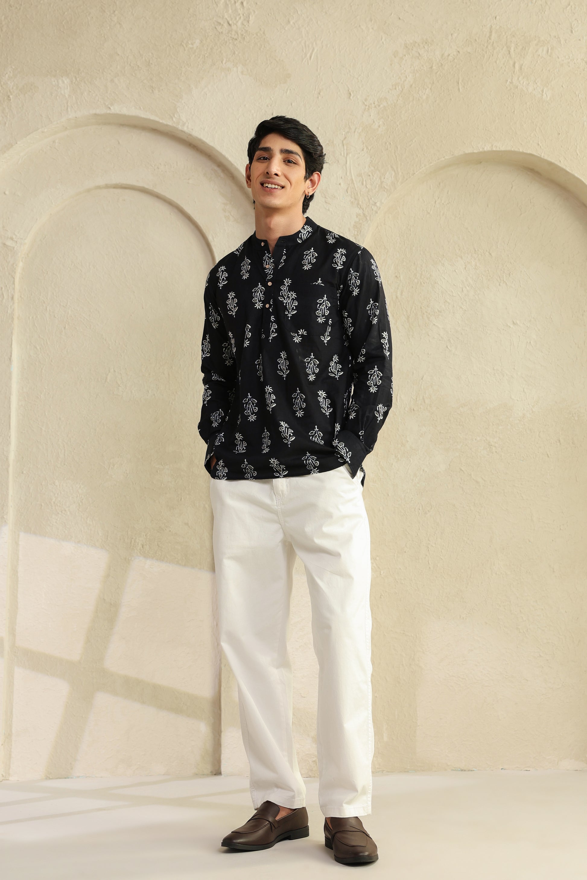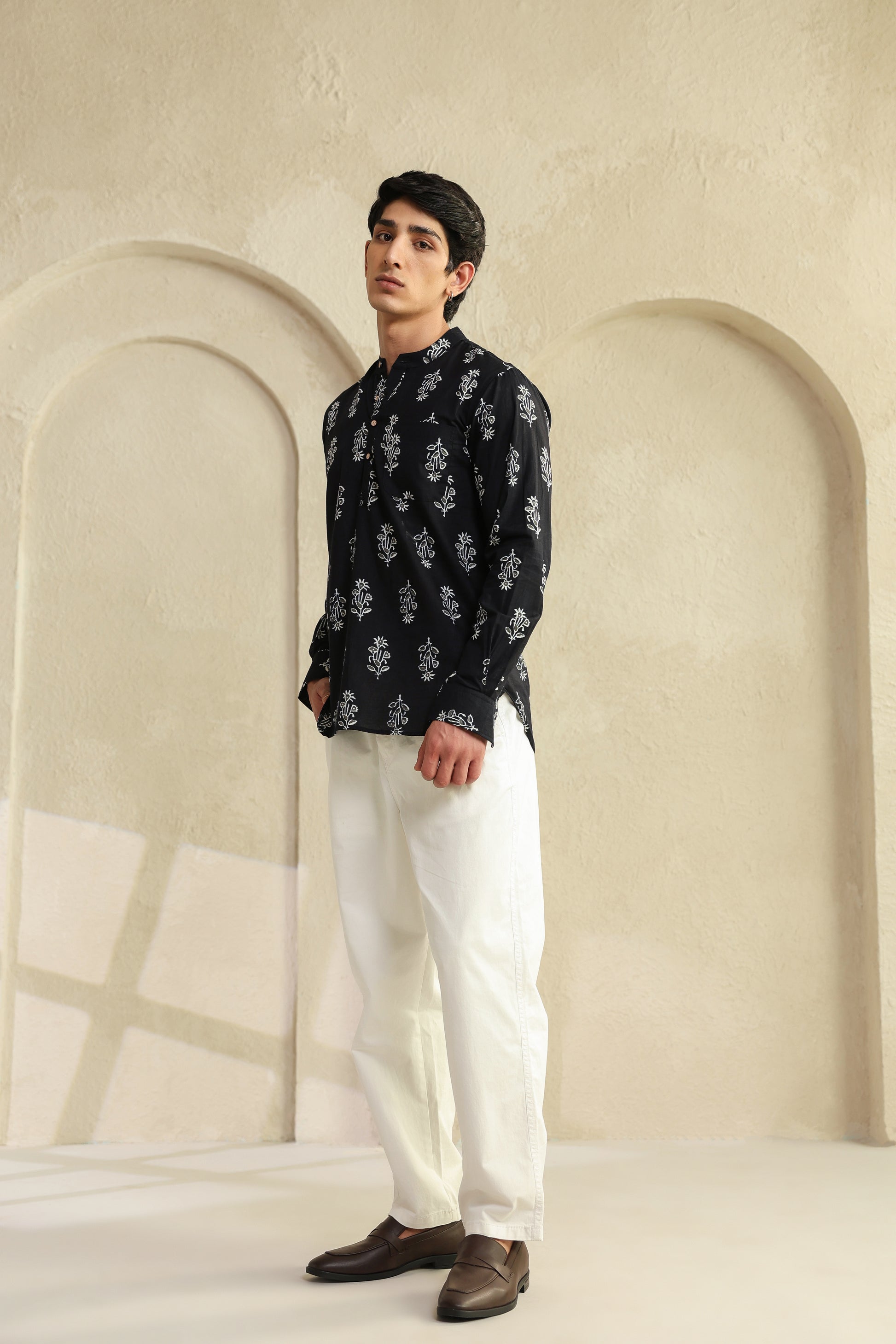 There is something timeless about black and white. This kurta carries that simplicity with quiet confidence. Hand-drawn florals sit gently on pure cotton, stitched with care for men who know that subtlety often speaks the loudest.