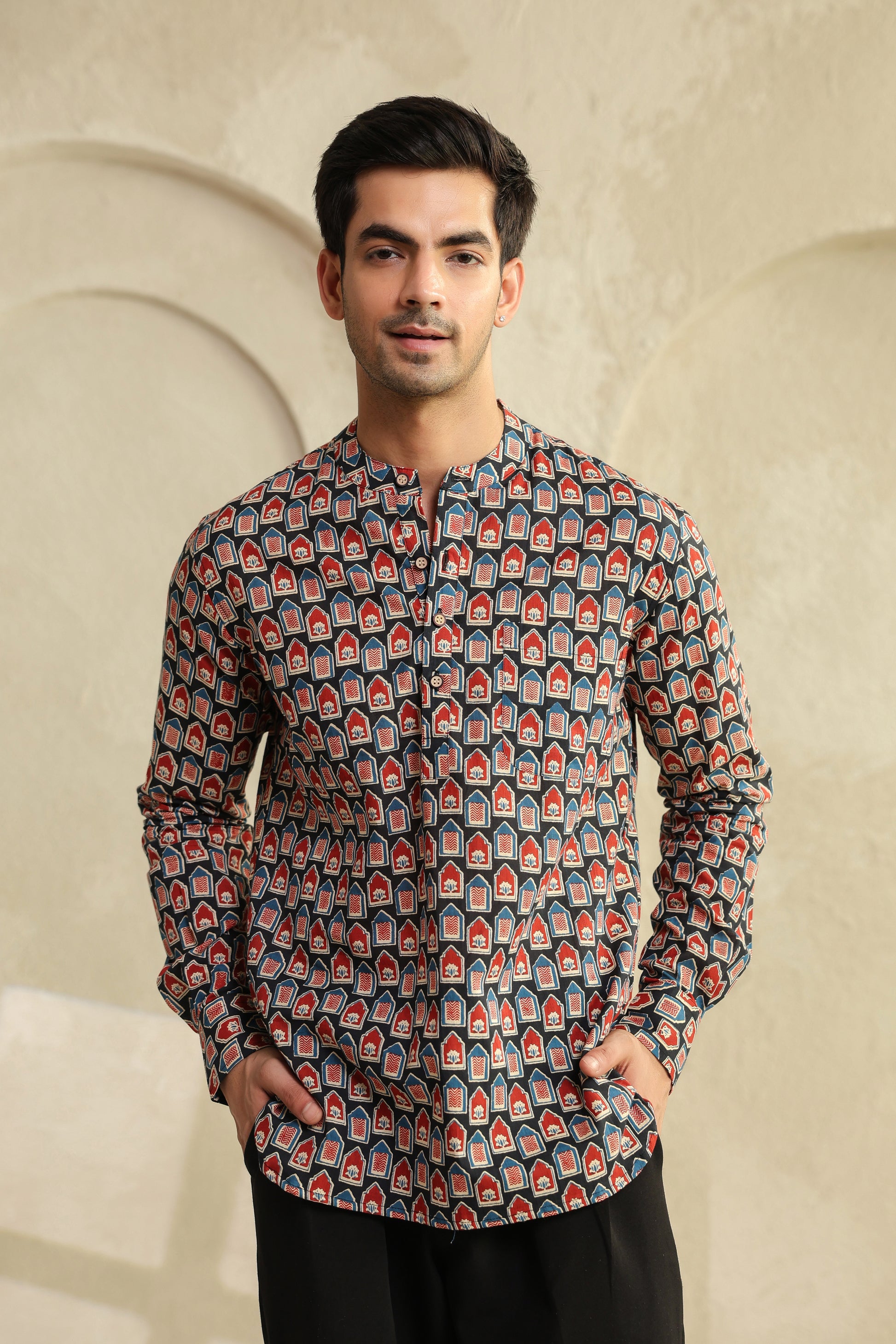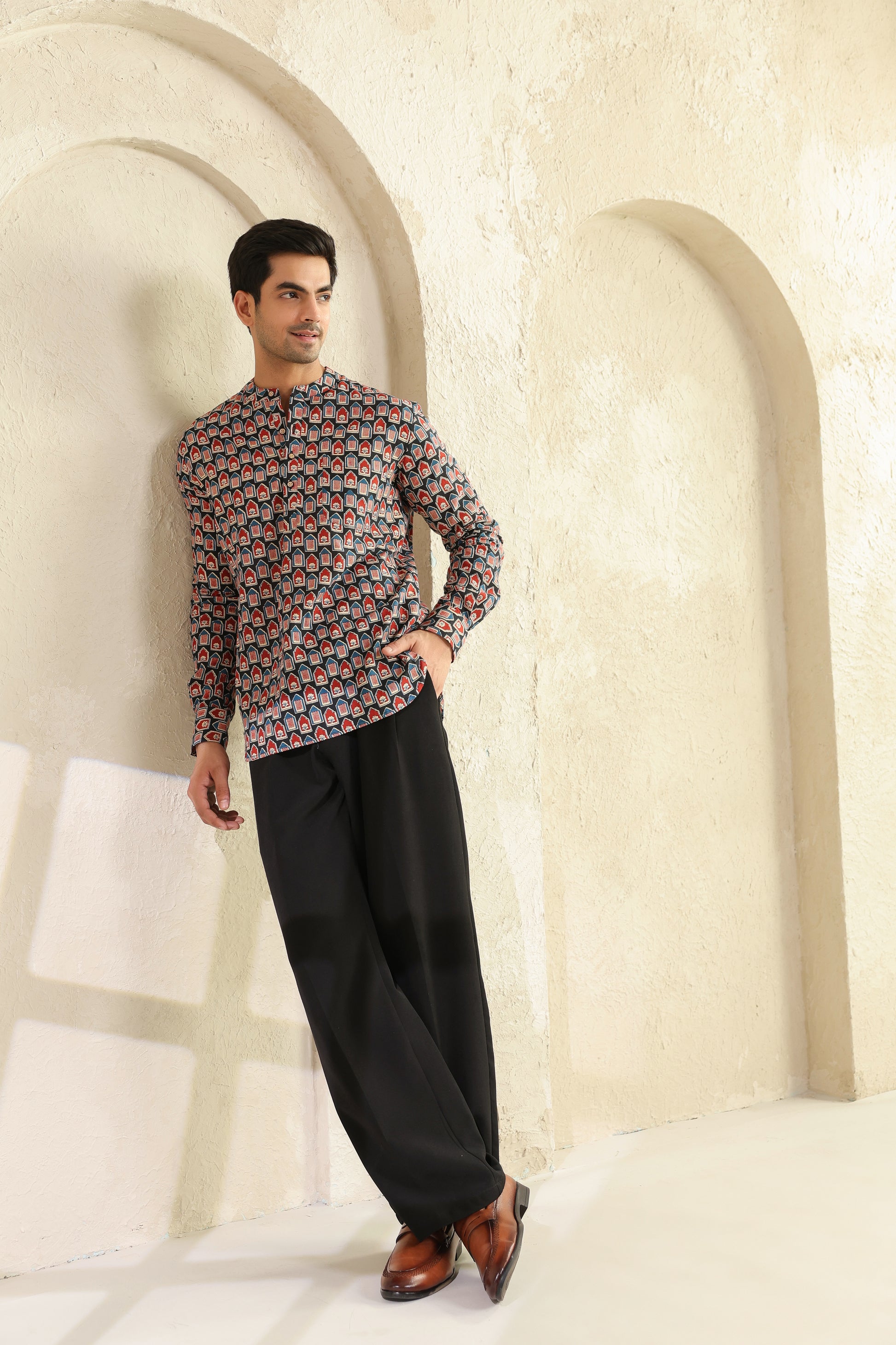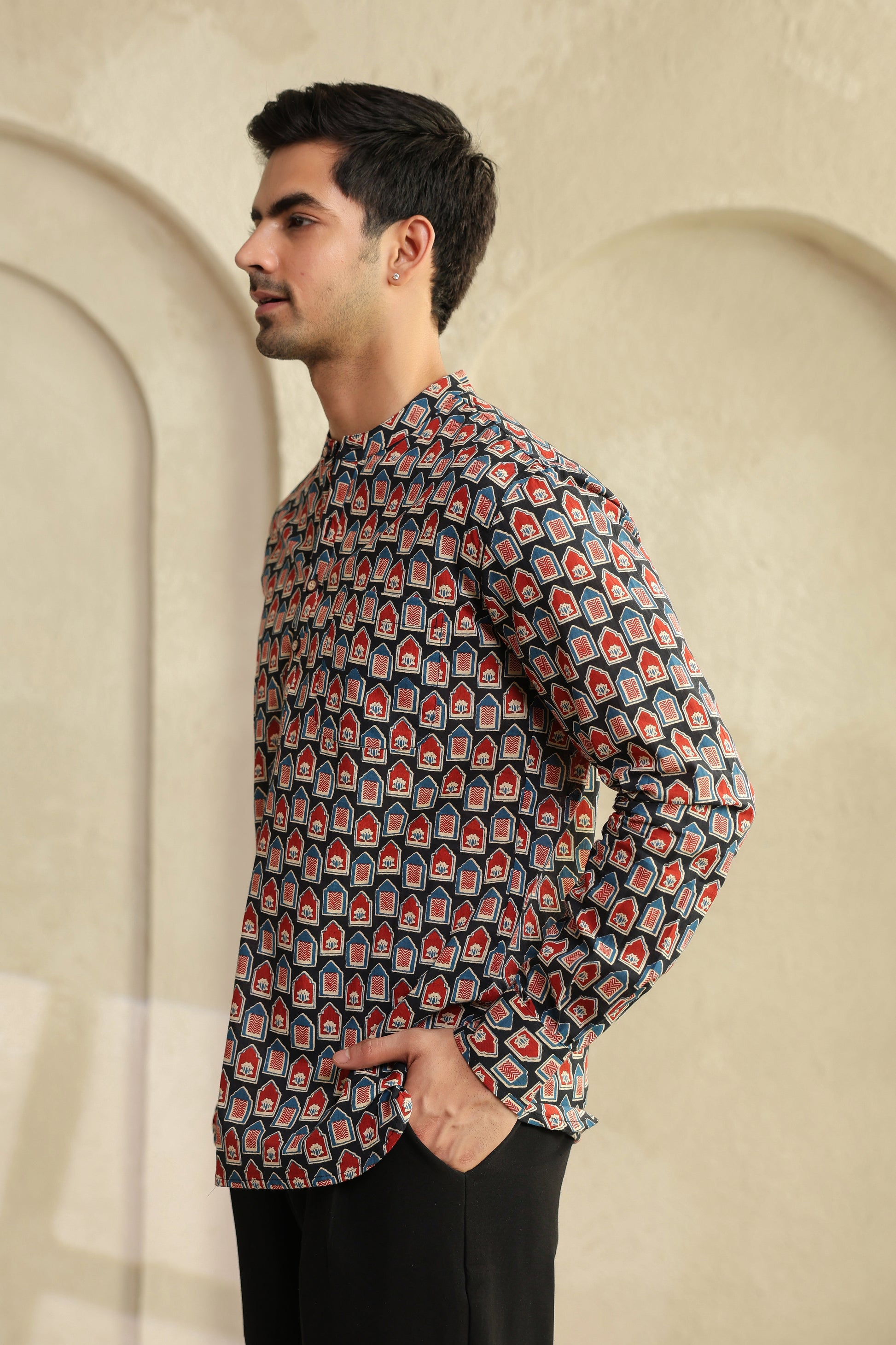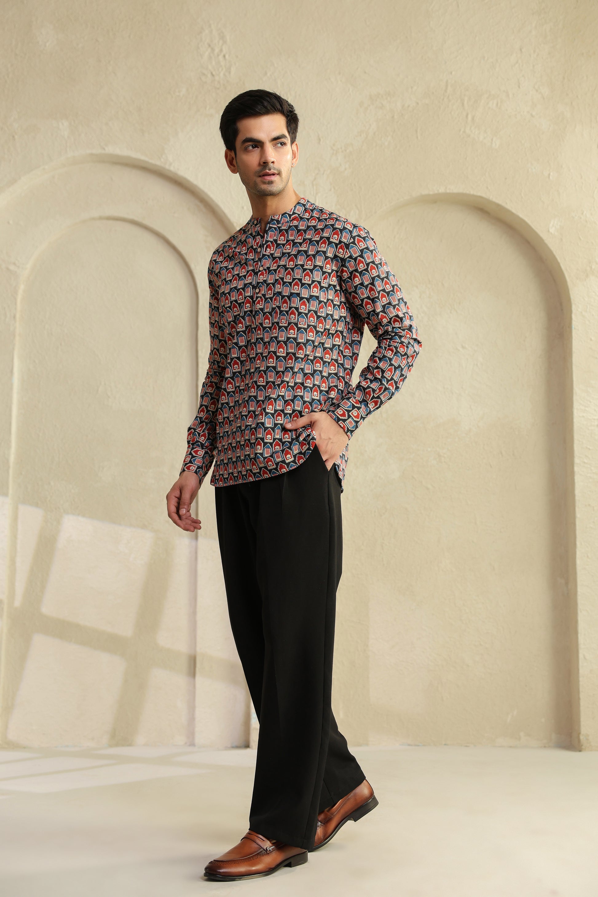 The bold red and black prints aren’t random designs. They’re inspired by age-old block printing, reimagined for today’s world. When you look closely, there’s a quiet balance in it, it feels bold, yet grounded. Just like the man who chooses to wear it.