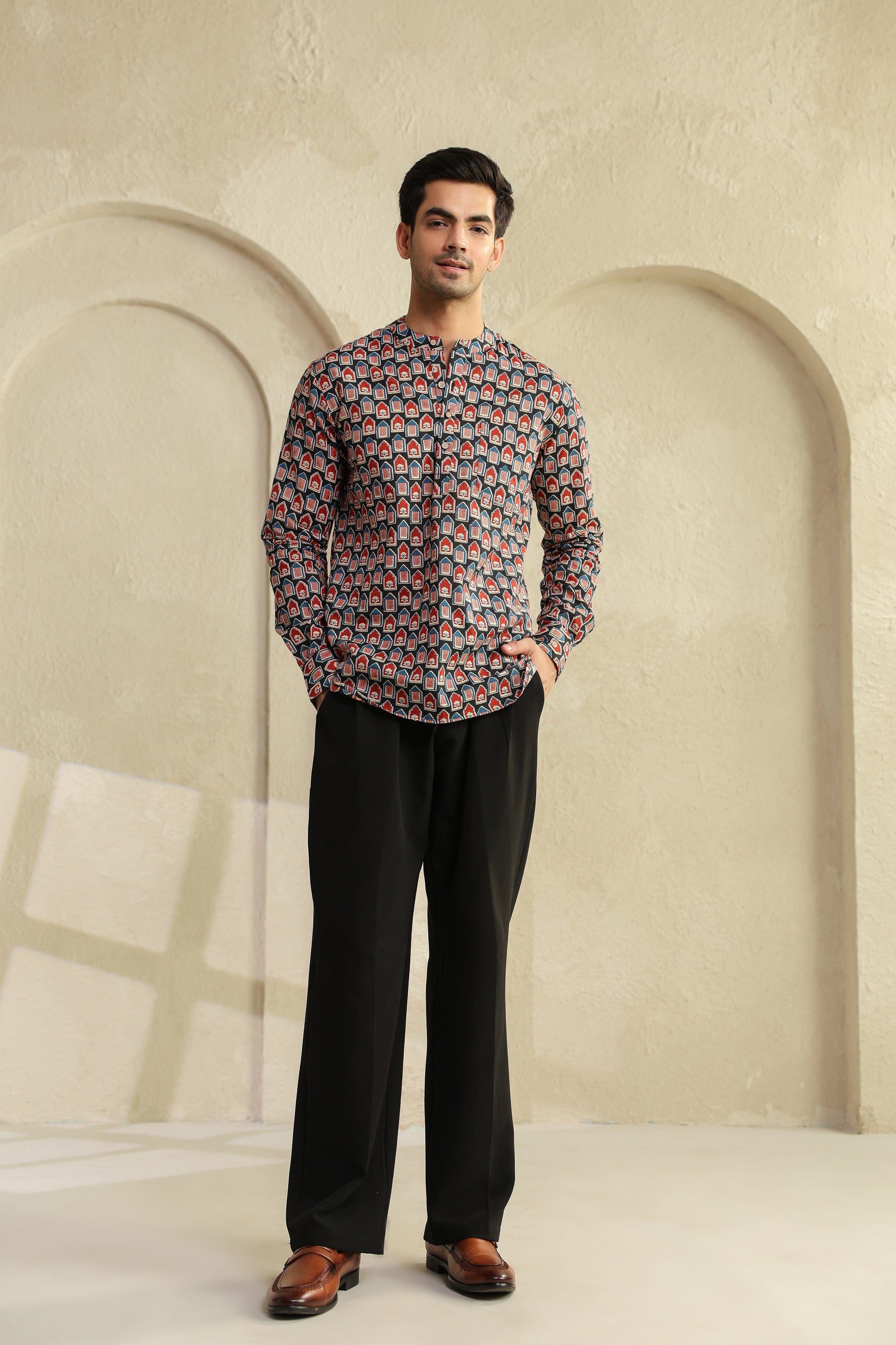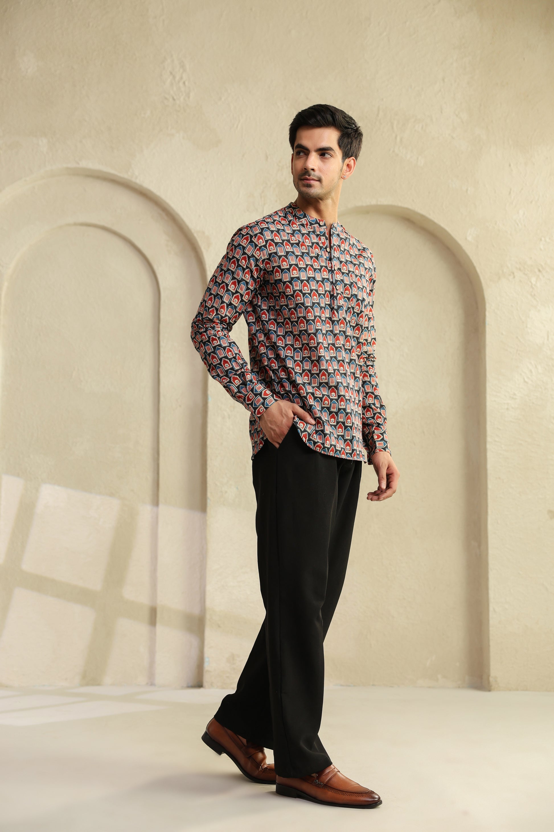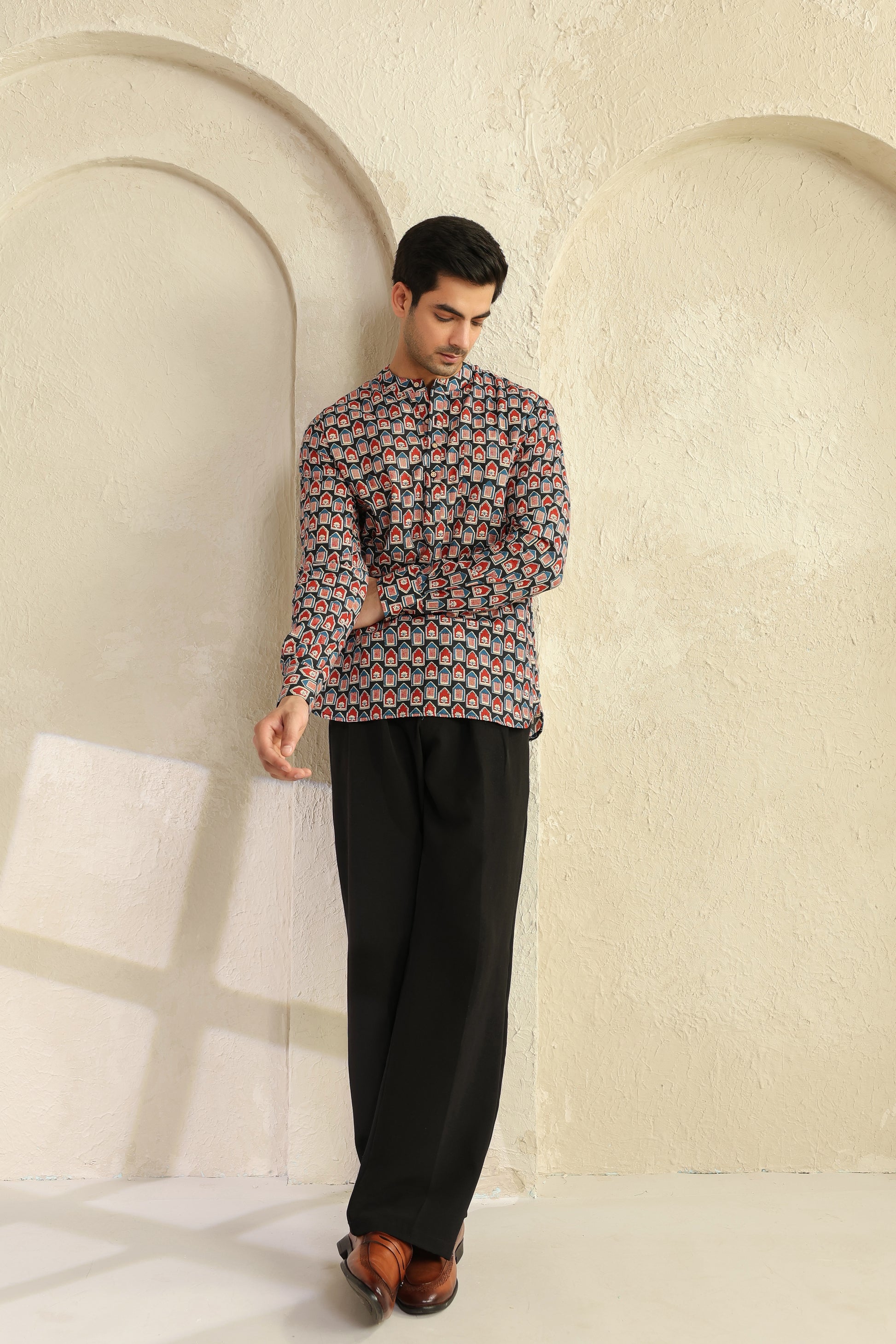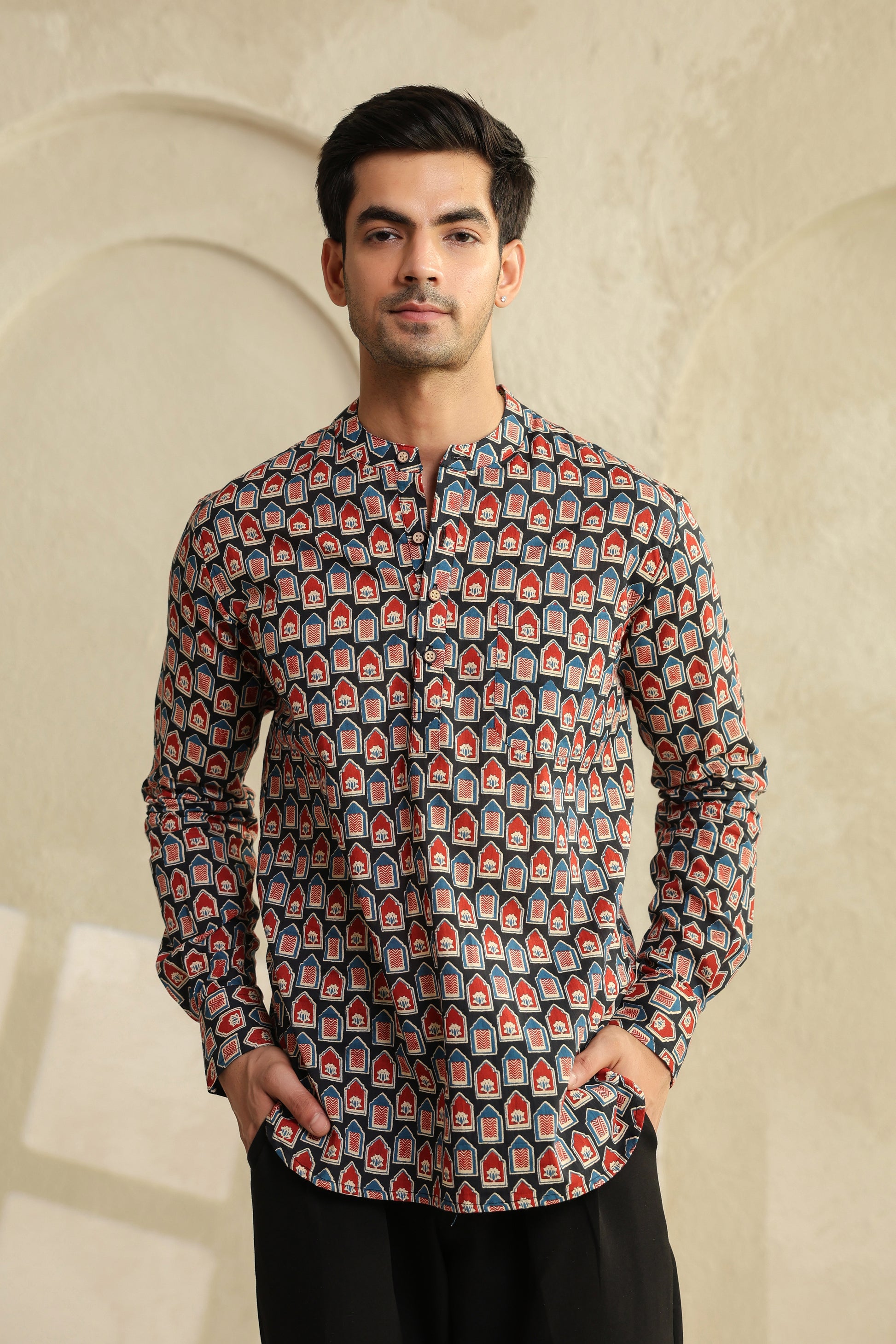 The bold red and black prints aren’t random designs. They’re inspired by age-old block printing, reimagined for today’s world. When you look closely, there’s a quiet balance in it, it feels bold, yet grounded. Just like the man who chooses to wear it.