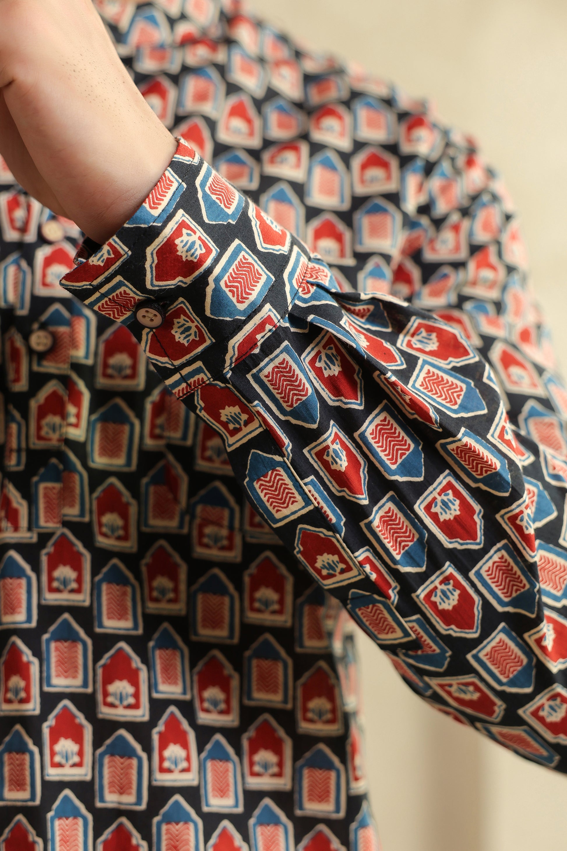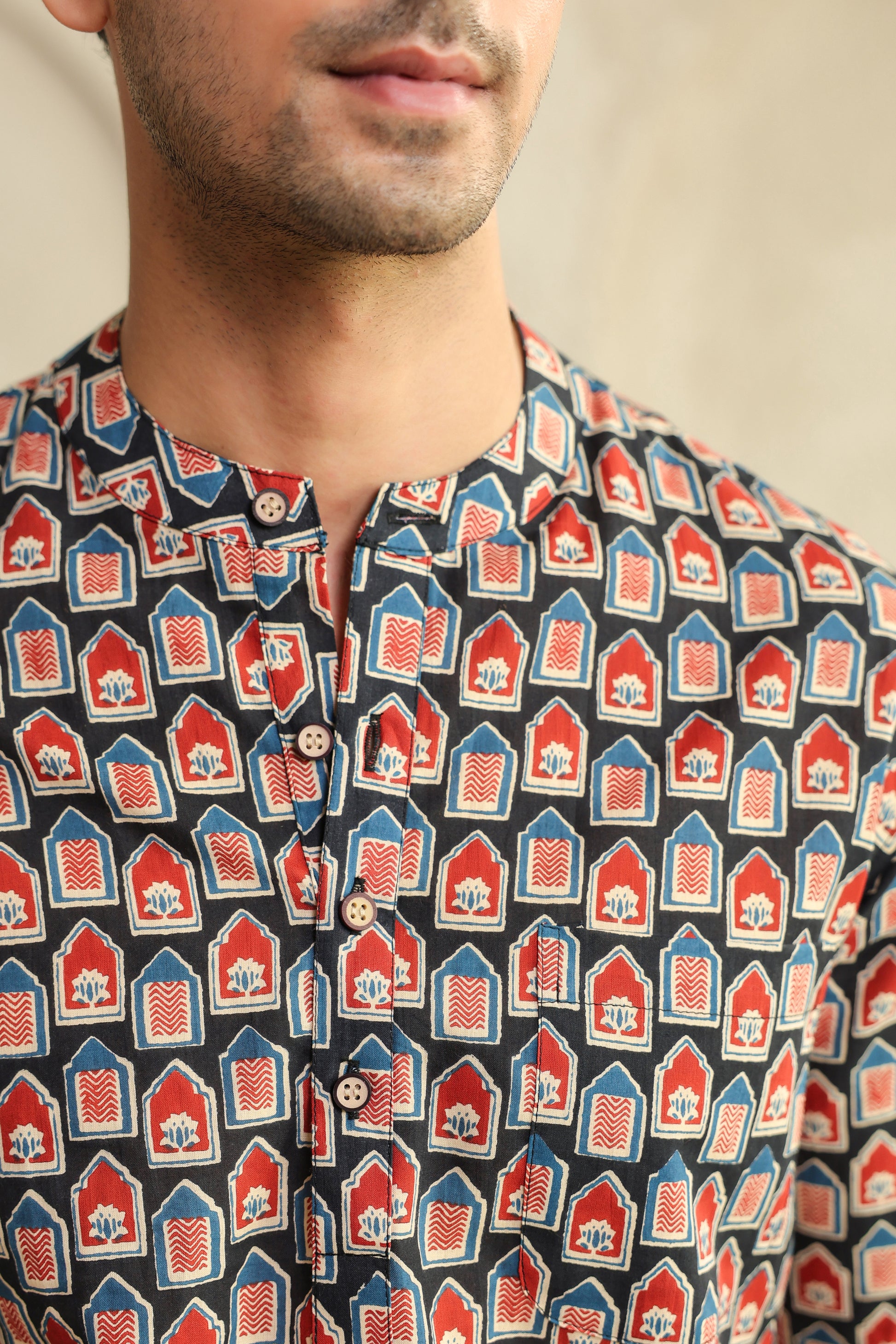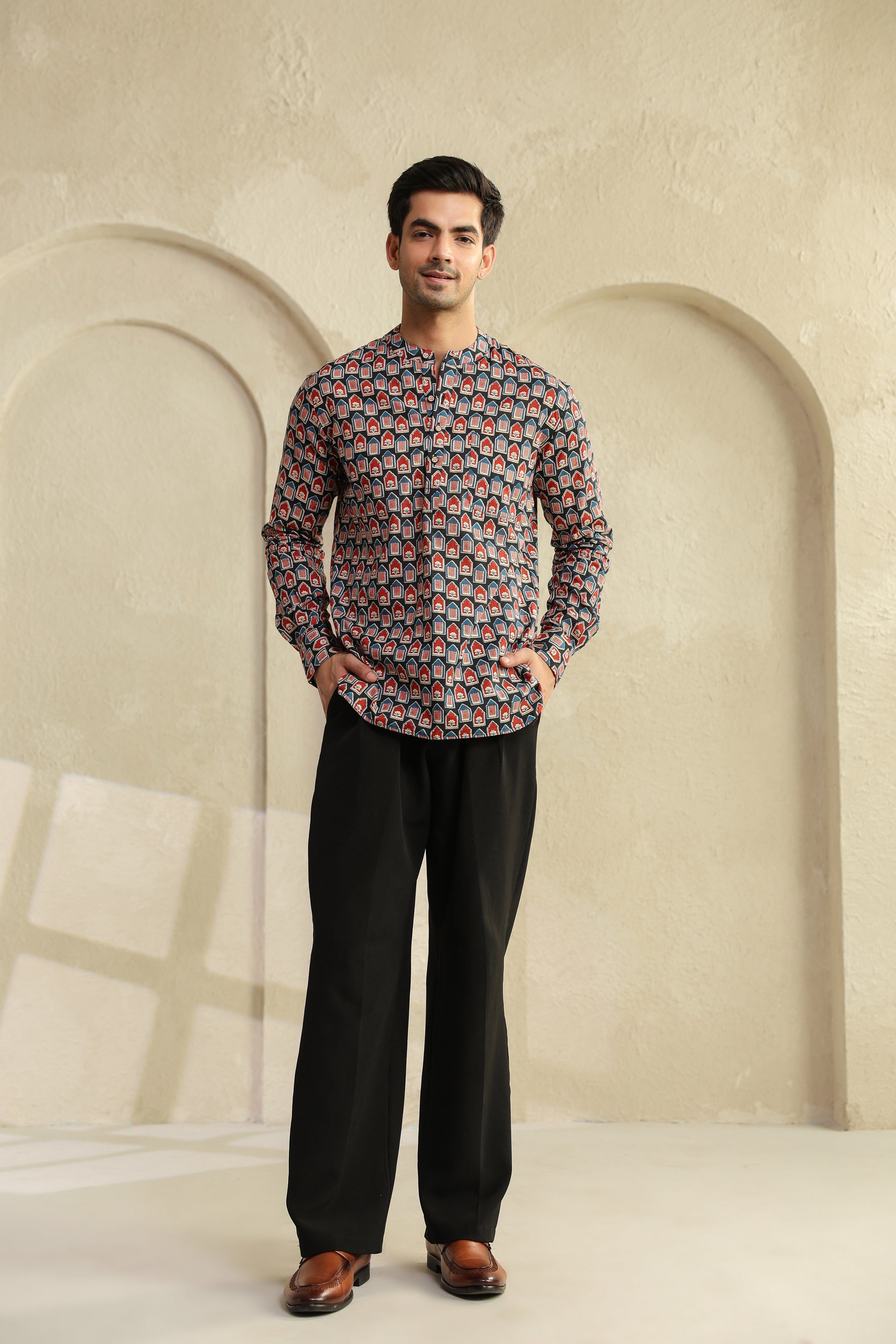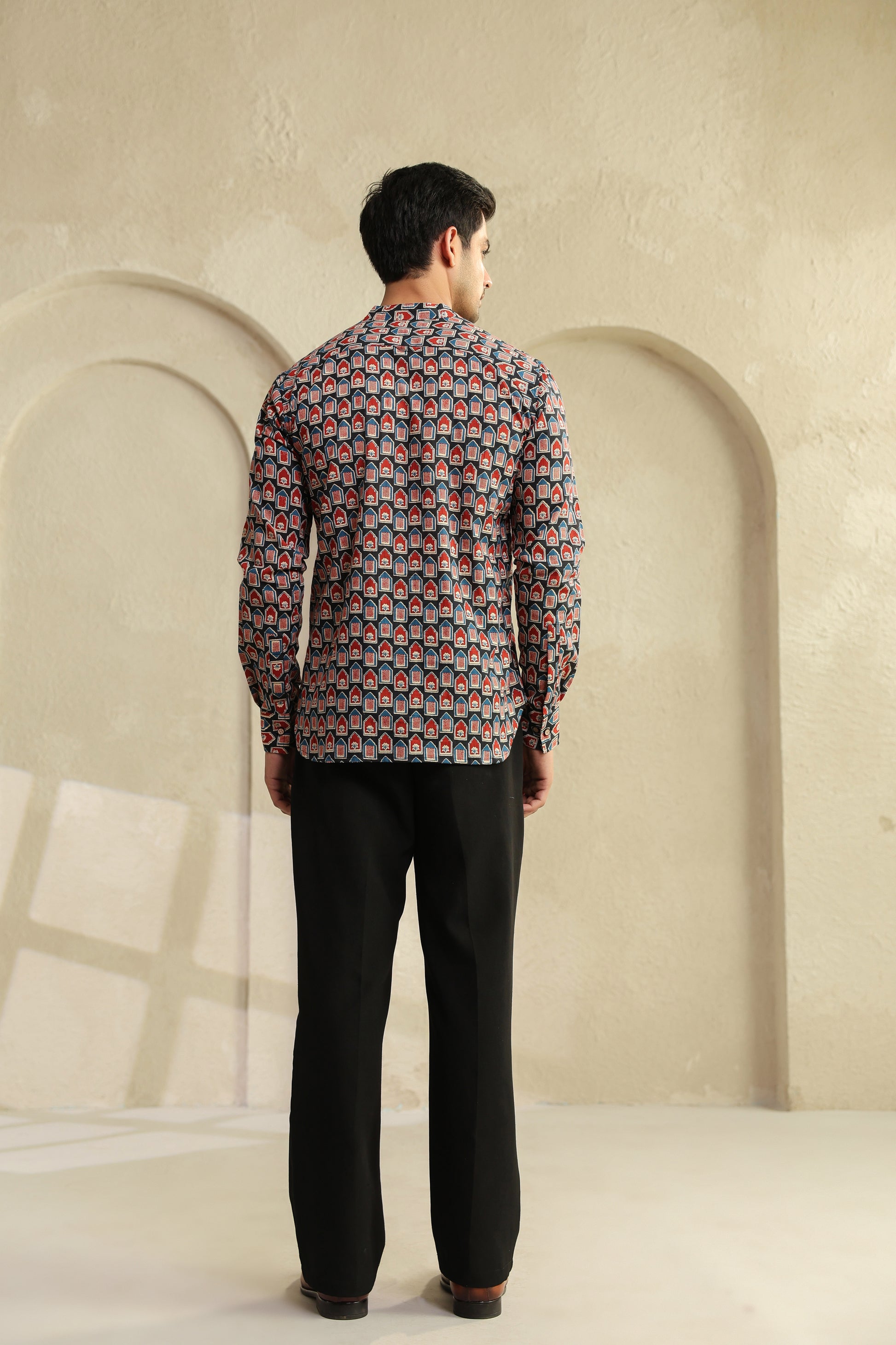 The bold red and black prints aren’t random designs. They’re inspired by age-old block printing, reimagined for today’s world. When you look closely, there’s a quiet balance in it, it feels bold, yet grounded. Just like the man who chooses to wear it.