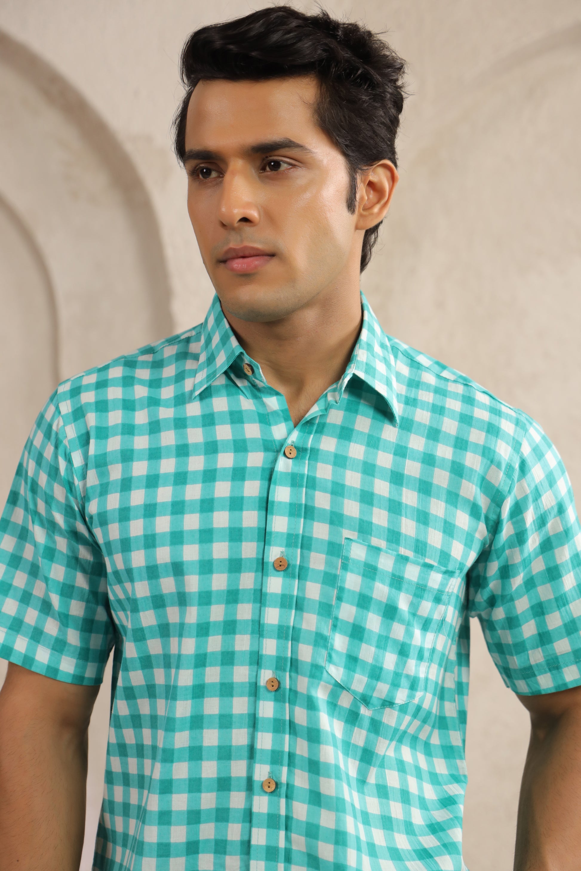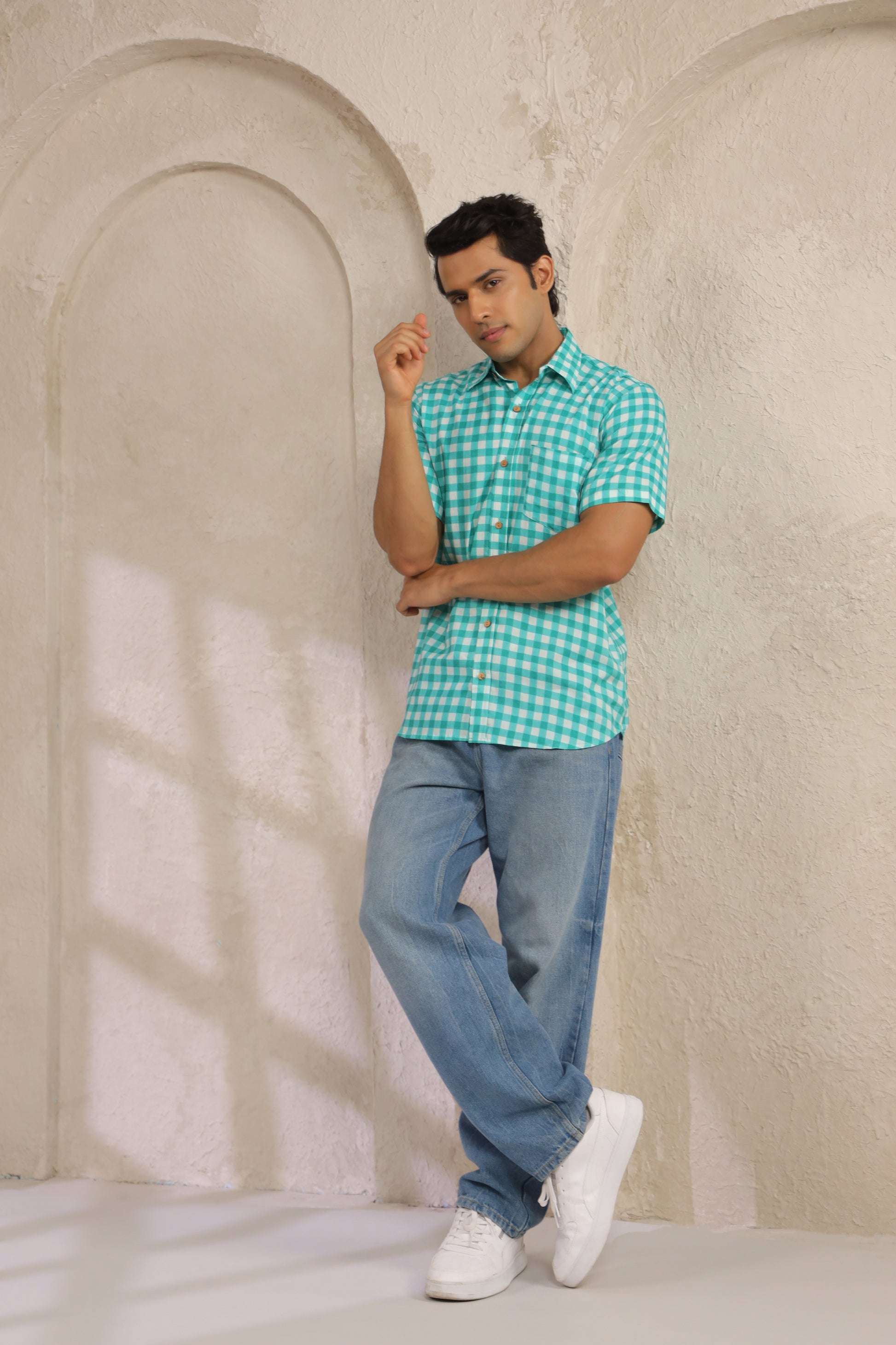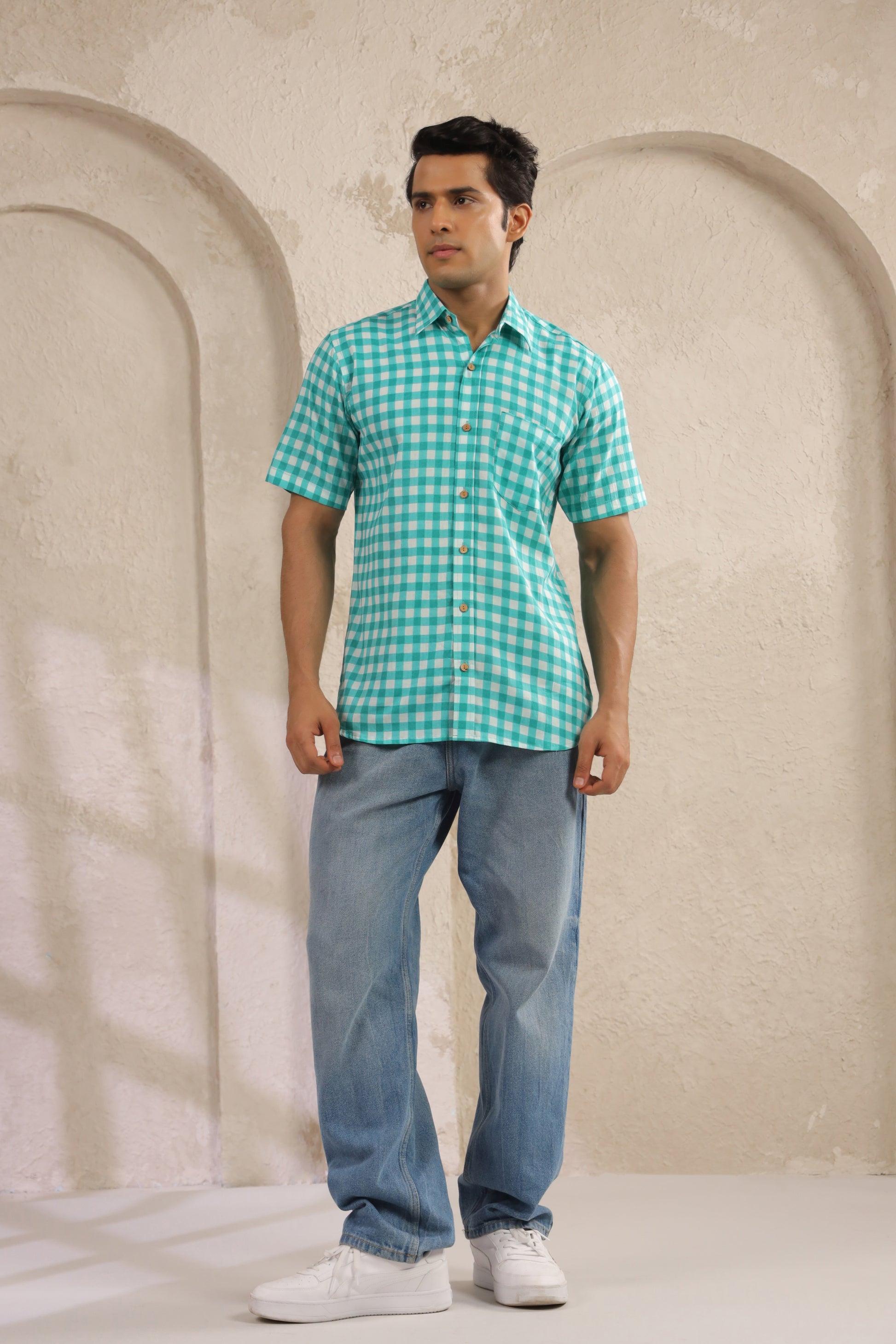 This screen printed cotton shirt is made in checks pattern. This is hand stiched and made of 100% pure cotton. It is a regular fit shirt which can be combined with variety of bottoms.