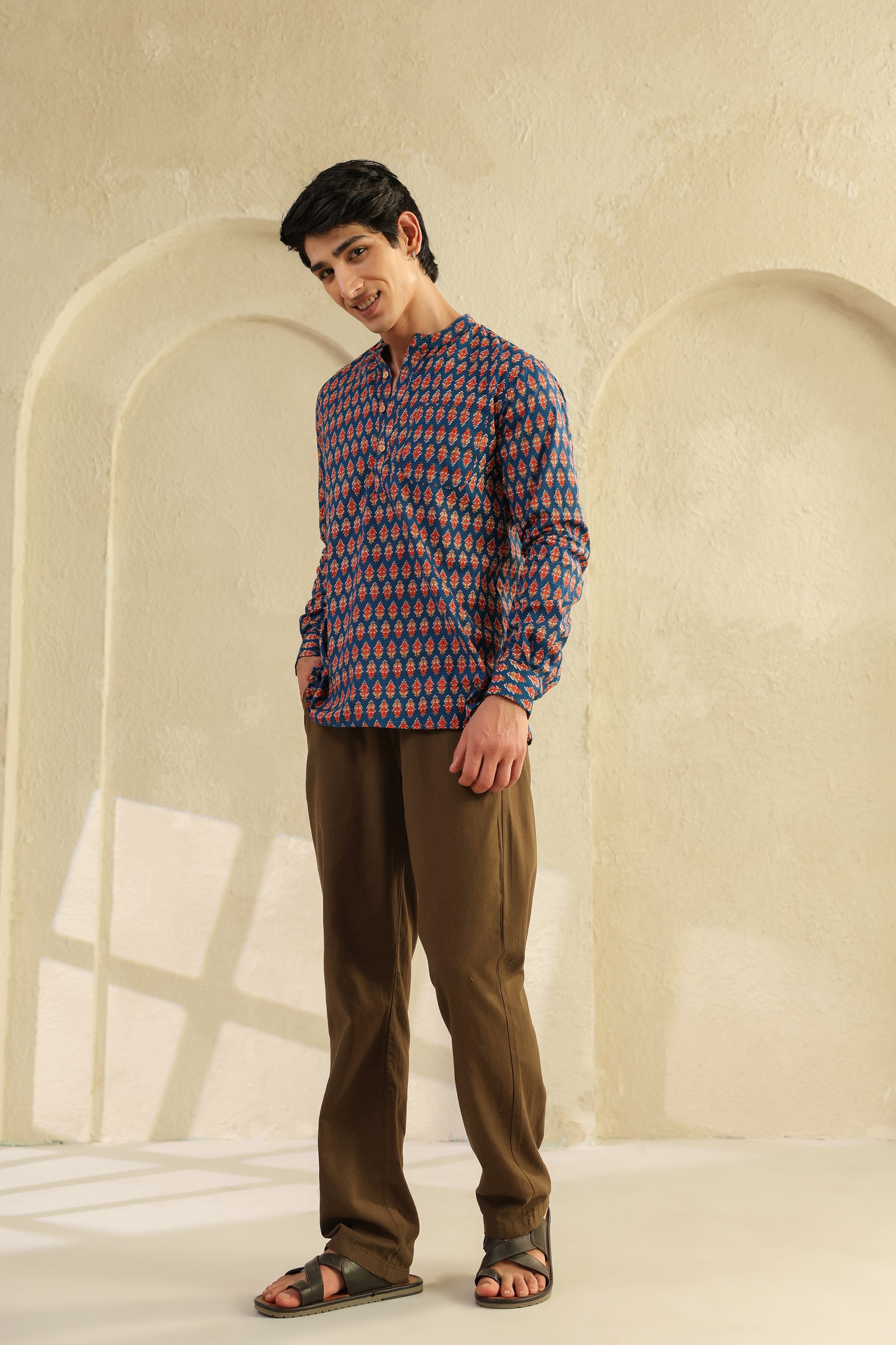 This regular fit shirt kurta is made in pure cotton. This is hand-stitched and perfect for any weather. It is made in full sleeves and mandarin collar.