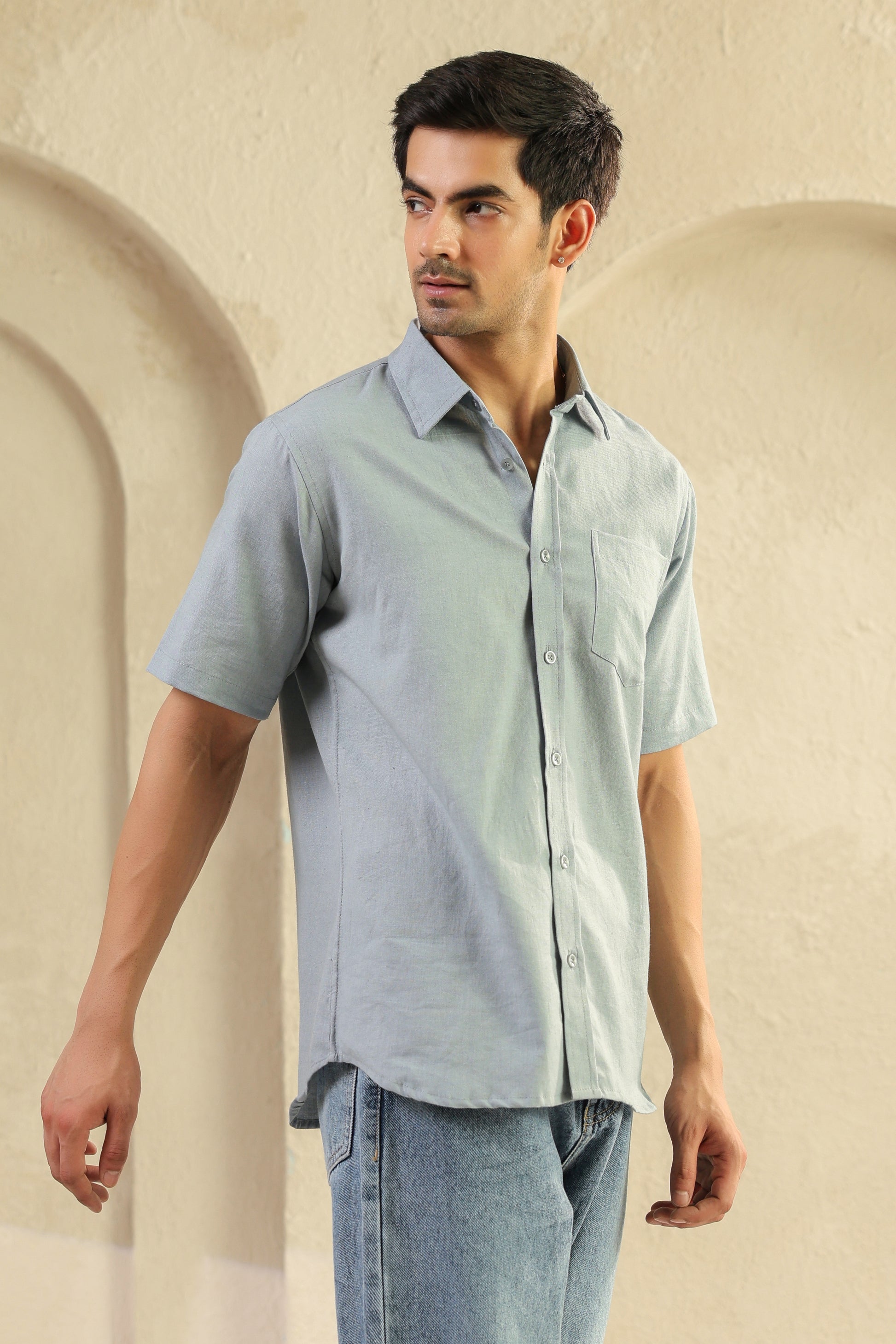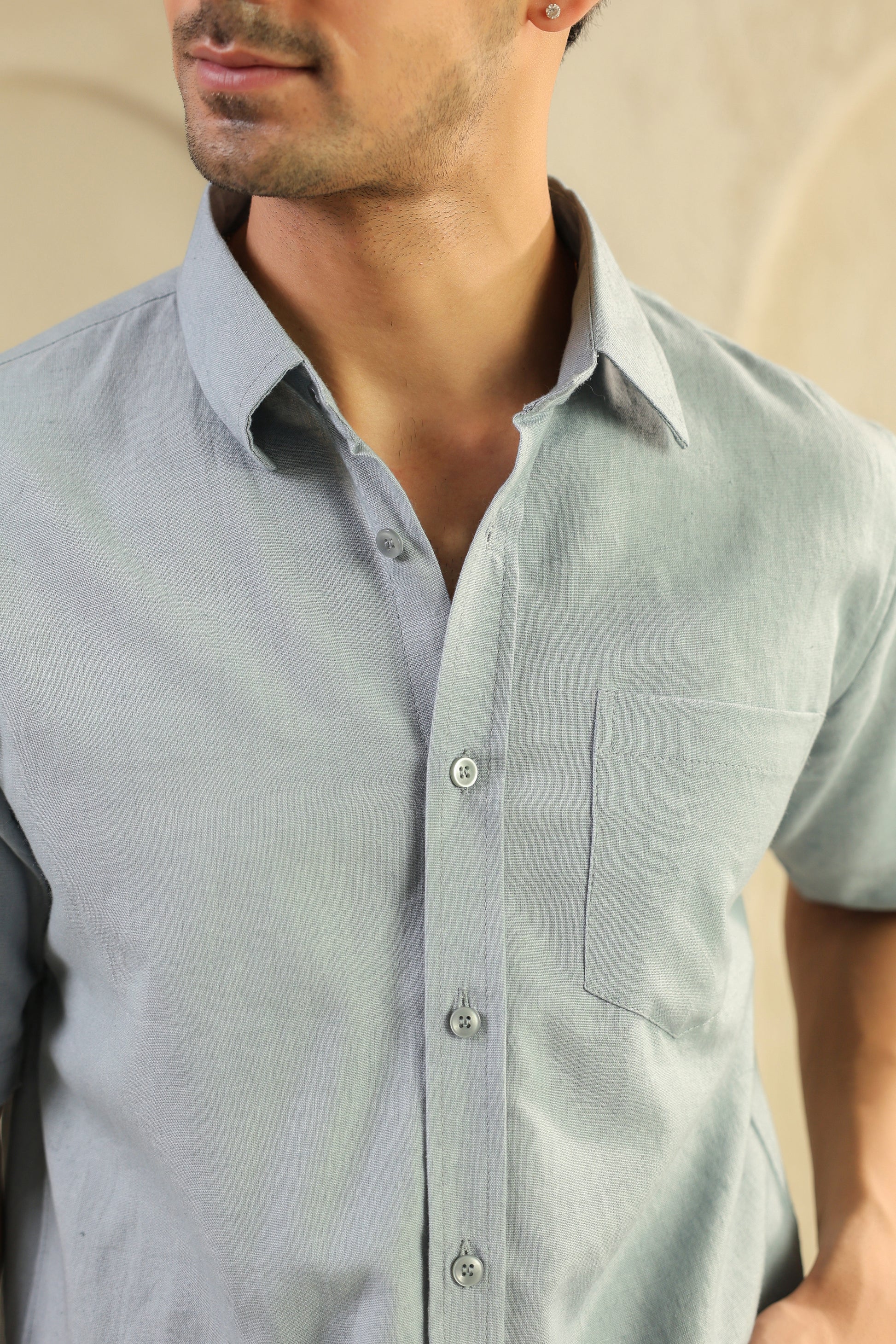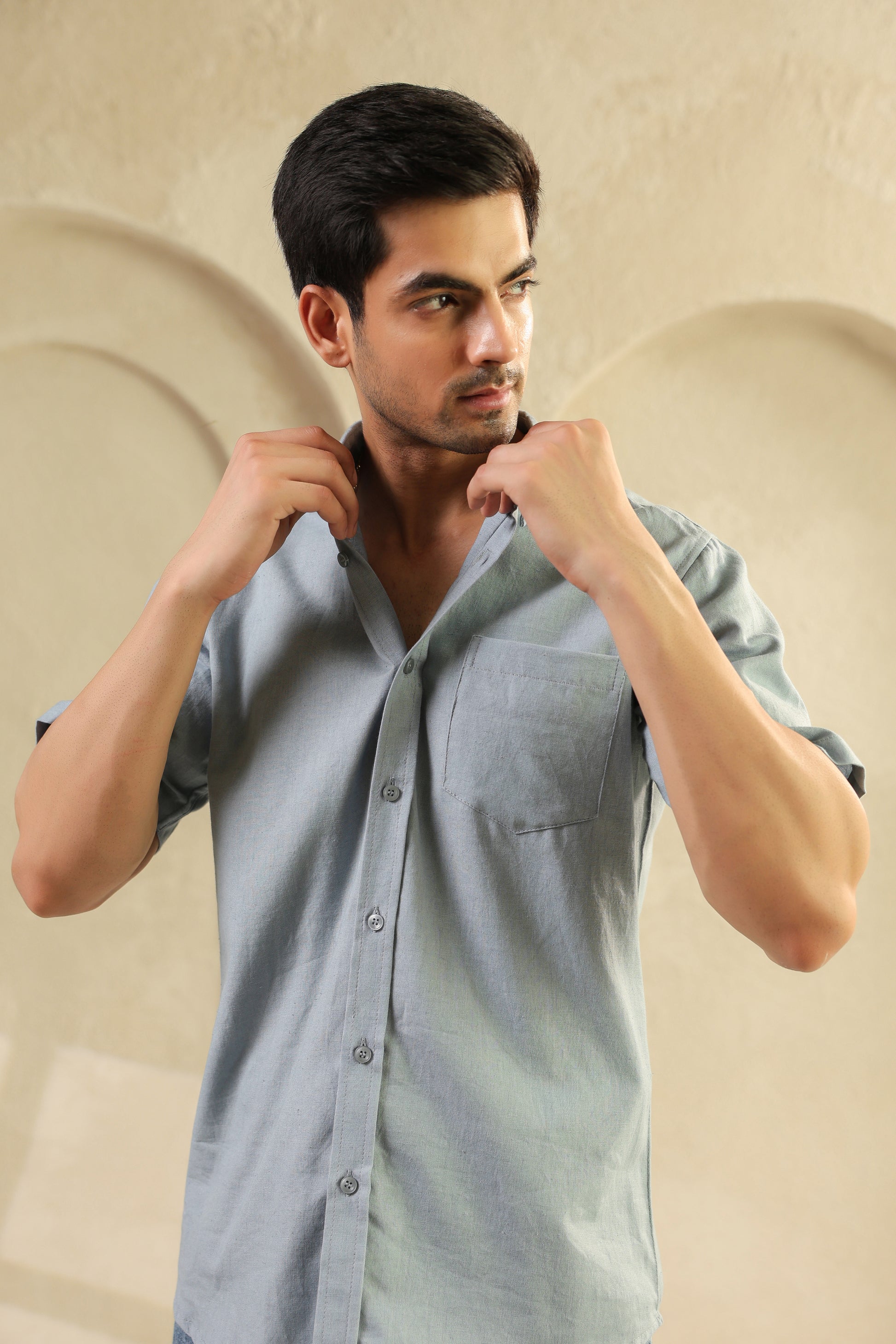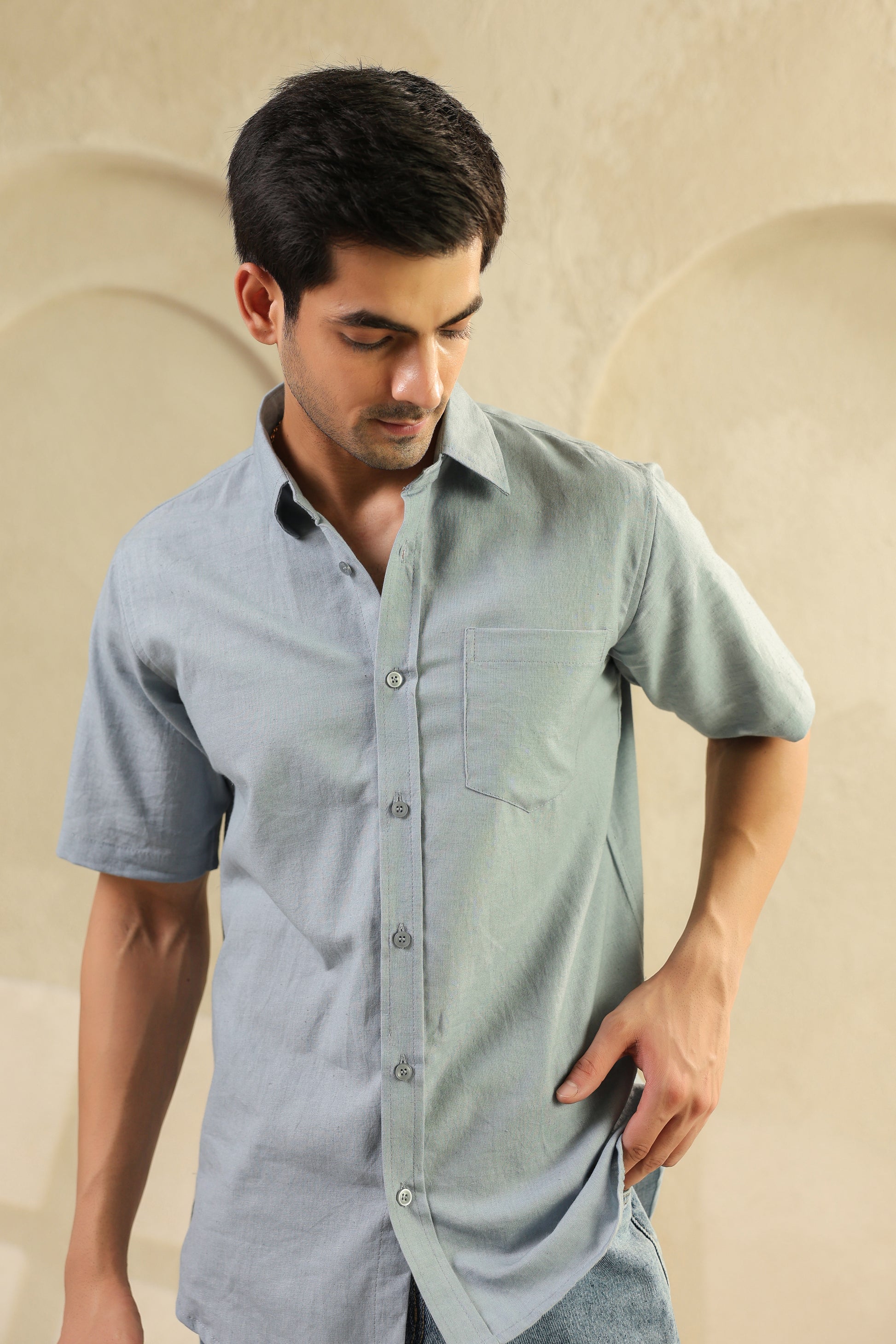 Soft sage with a hint of steel, this shirt feels like a quiet breeze on a long day. Woven in a breathable linen blend, its texture carries the ease of everyday comfort, balanced with the neat sharpness of a clean stitch. Short sleeves and a classic collar bring a sense of ease, crafted for the man who moves with calm, steady intention.