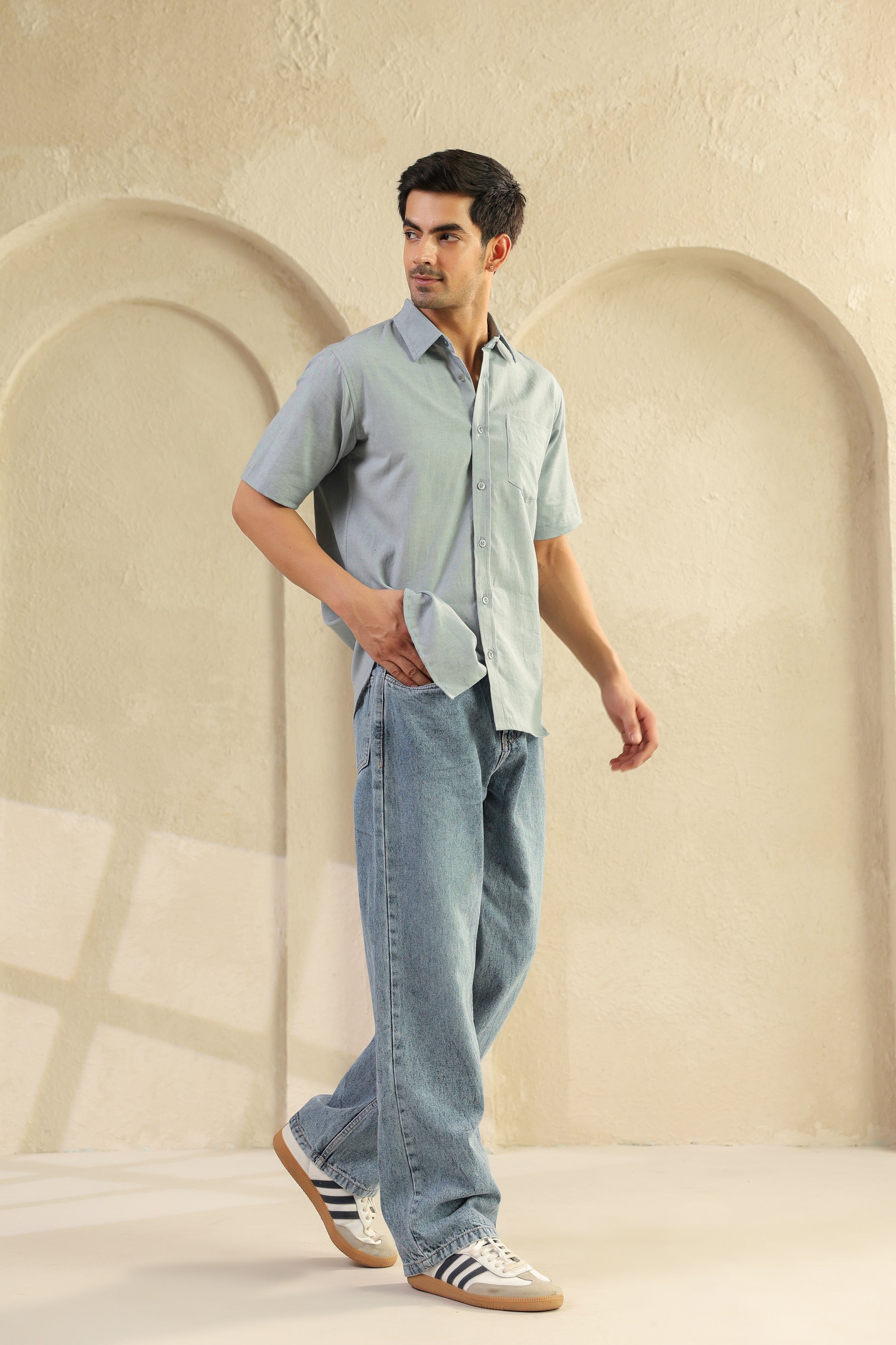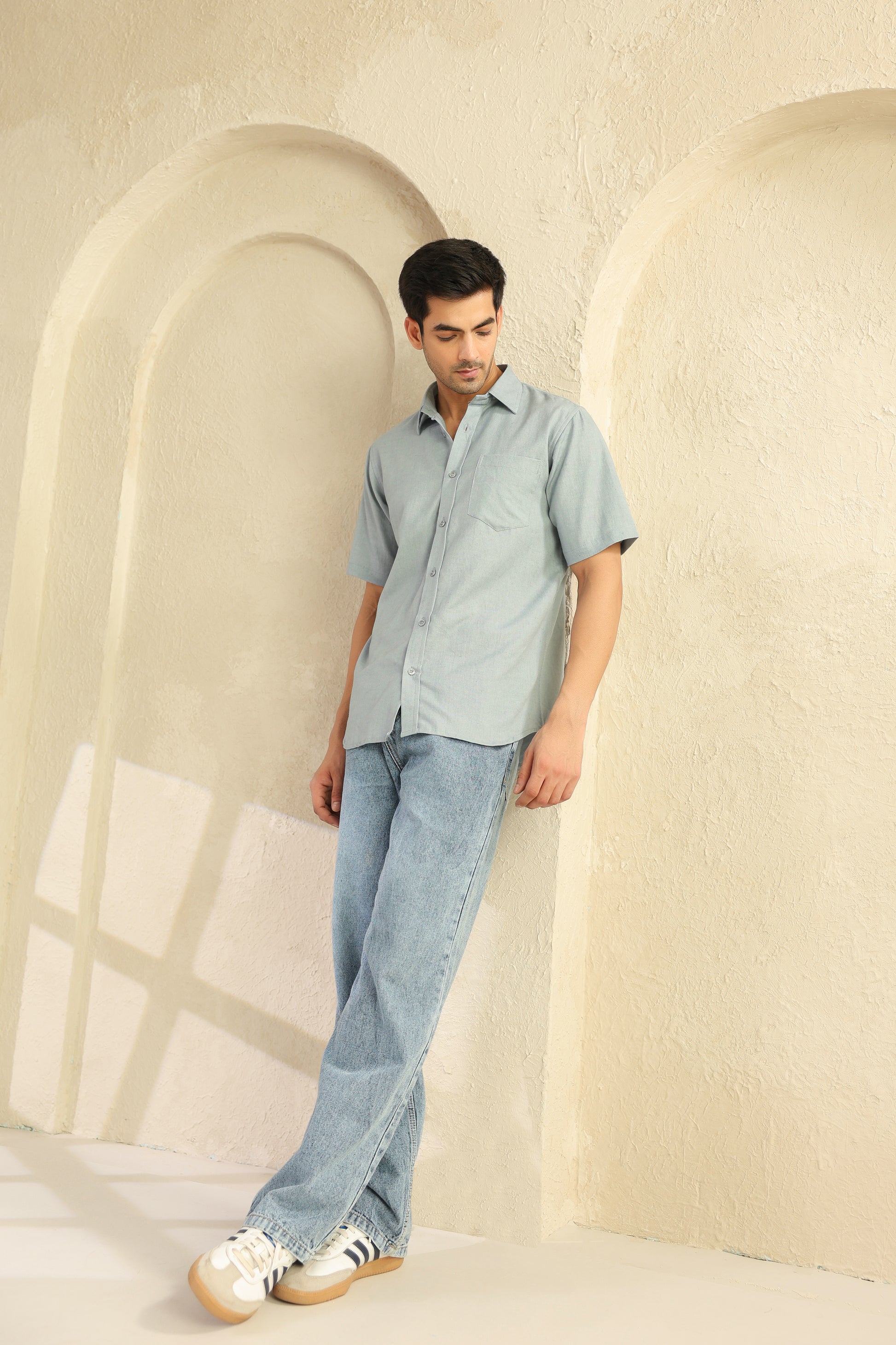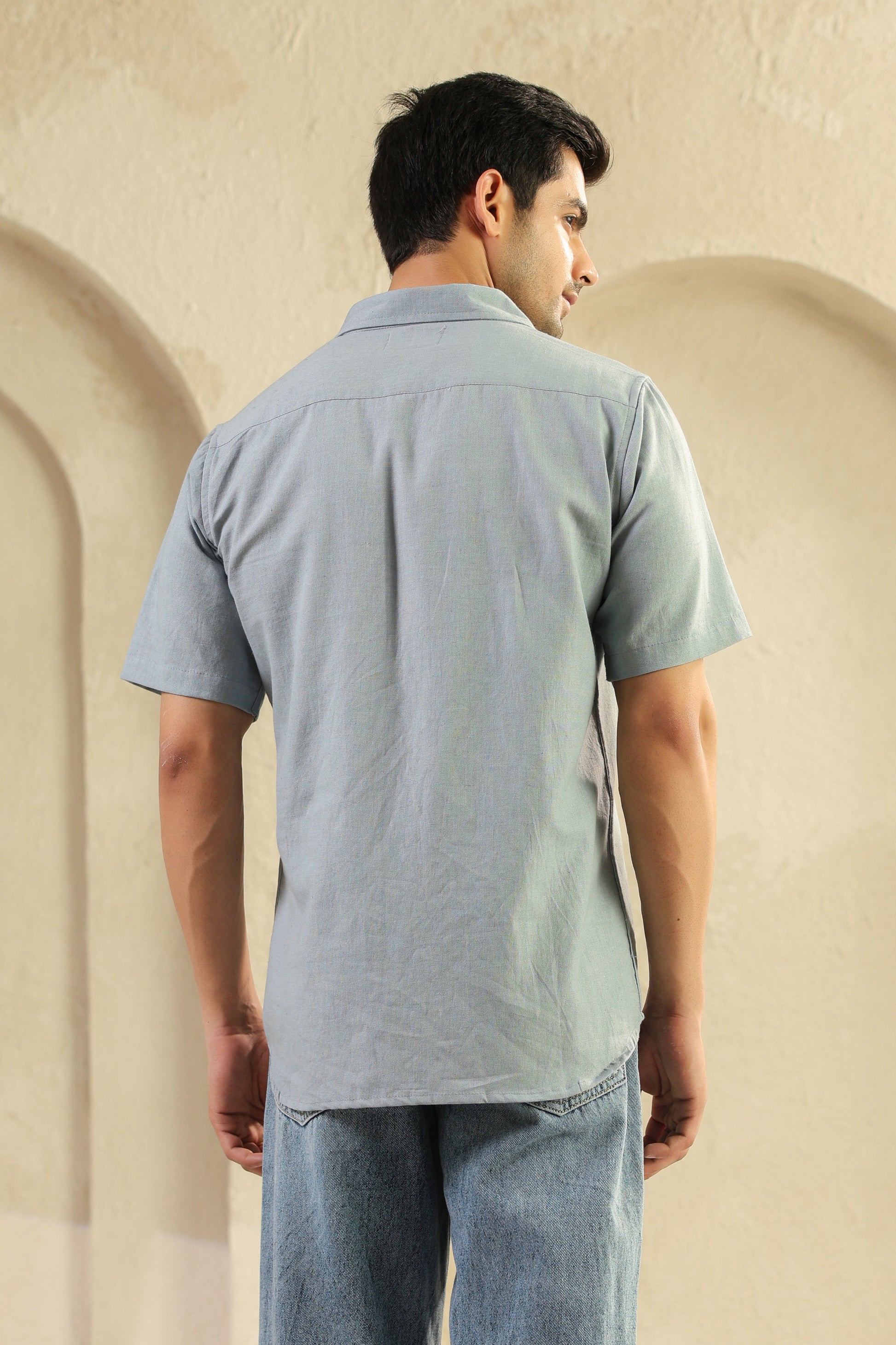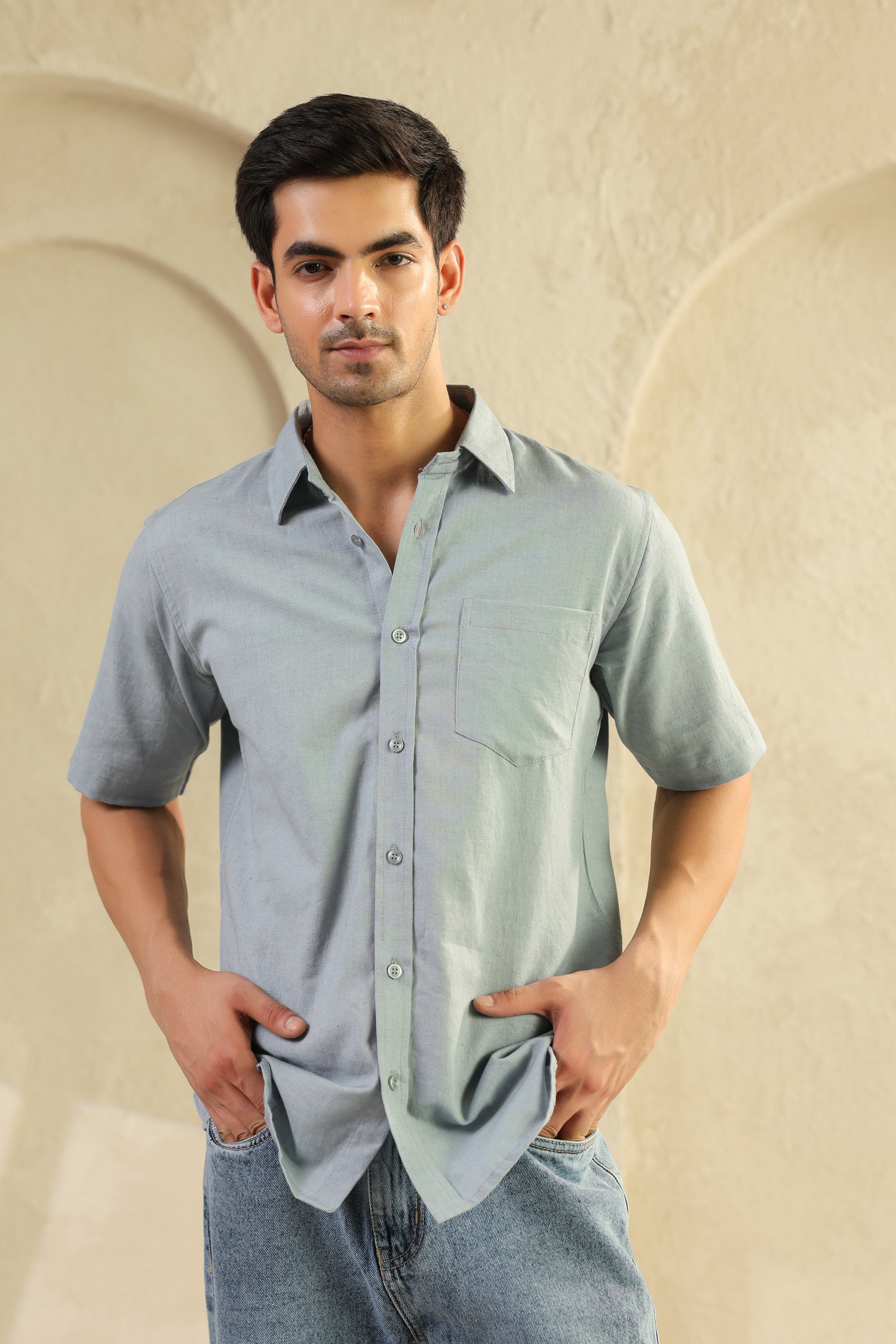 Soft sage with a hint of steel, this shirt feels like a quiet breeze on a long day. Woven in a breathable linen blend, its texture carries the ease of everyday comfort, balanced with the neat sharpness of a clean stitch. Short sleeves and a classic collar bring a sense of ease, crafted for the man who moves with calm, steady intention.