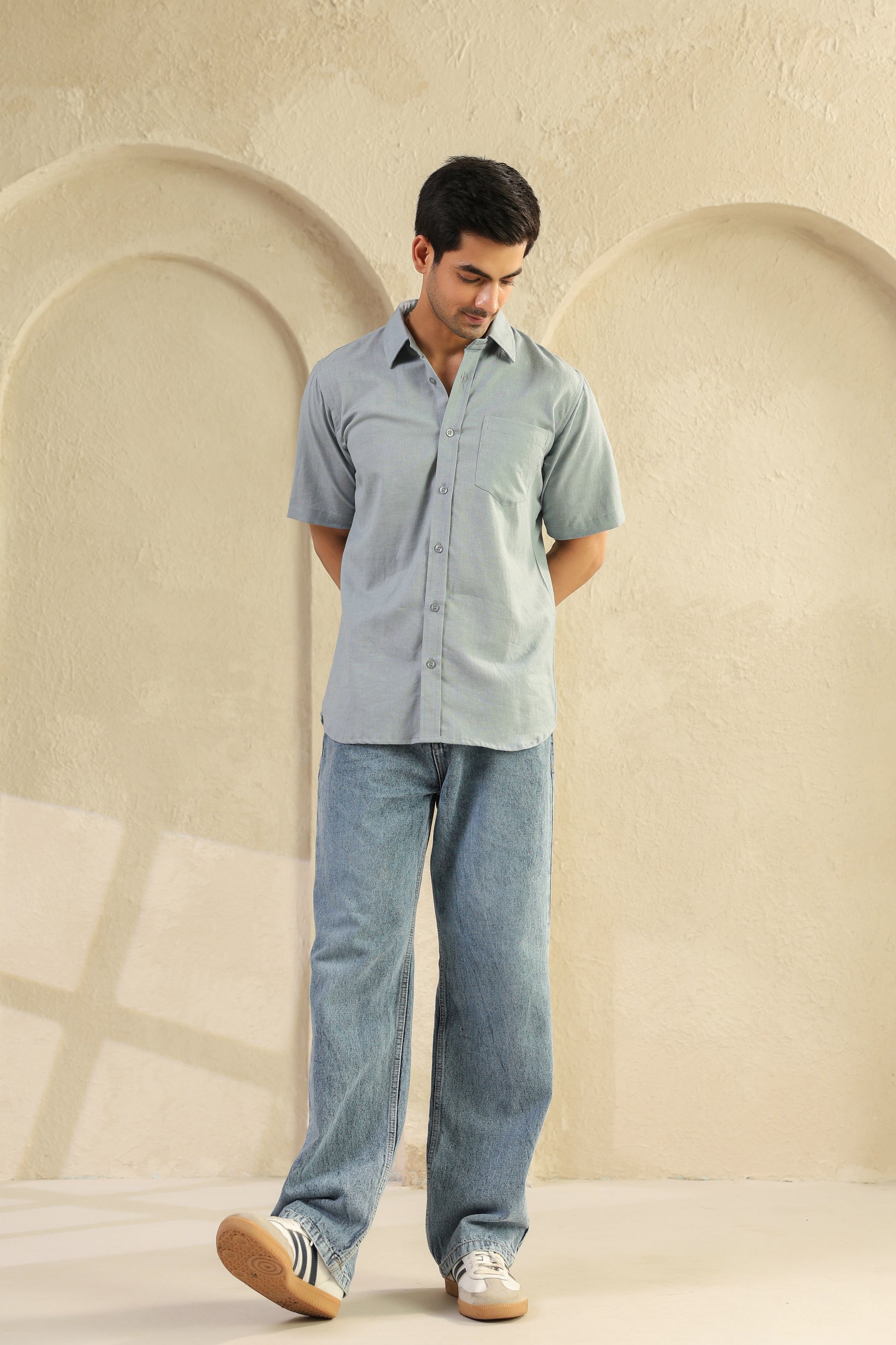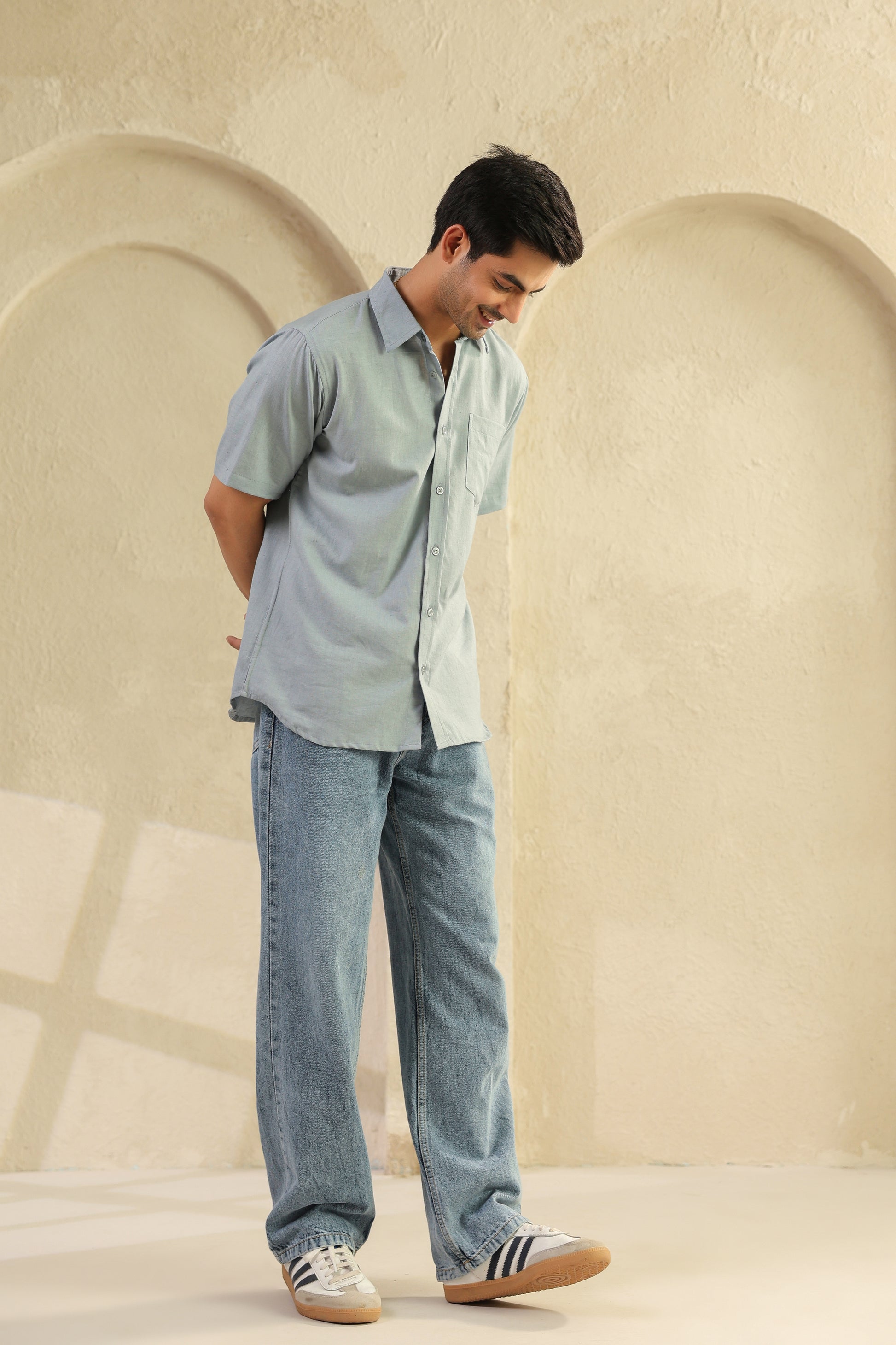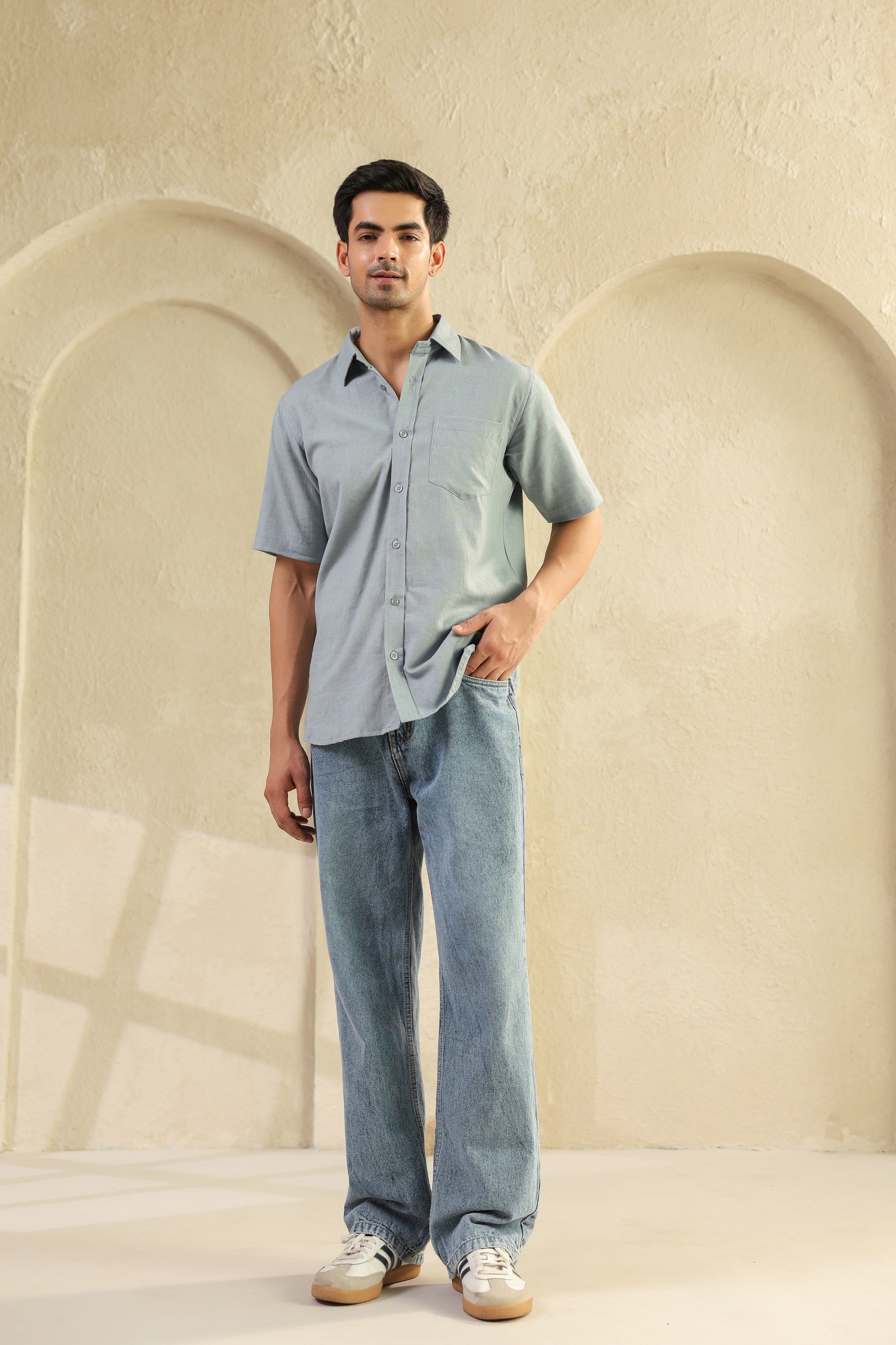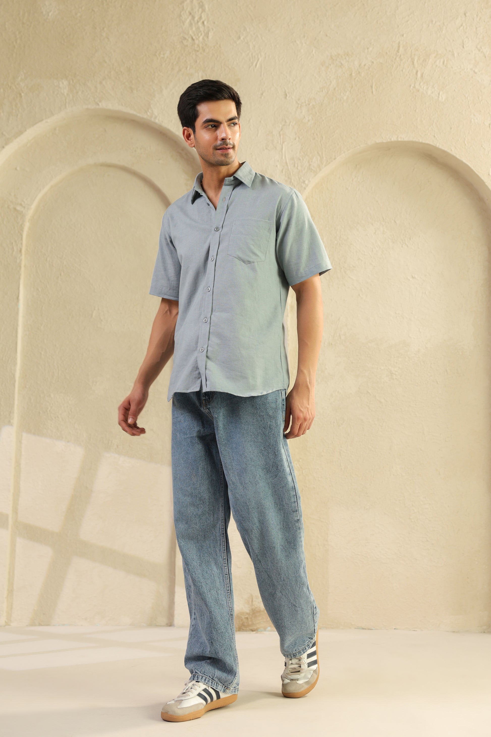 Soft sage with a hint of steel, this shirt feels like a quiet breeze on a long day. Woven in a breathable linen blend, its texture carries the ease of everyday comfort, balanced with the neat sharpness of a clean stitch. Short sleeves and a classic collar bring a sense of ease, crafted for the man who moves with calm, steady intention.