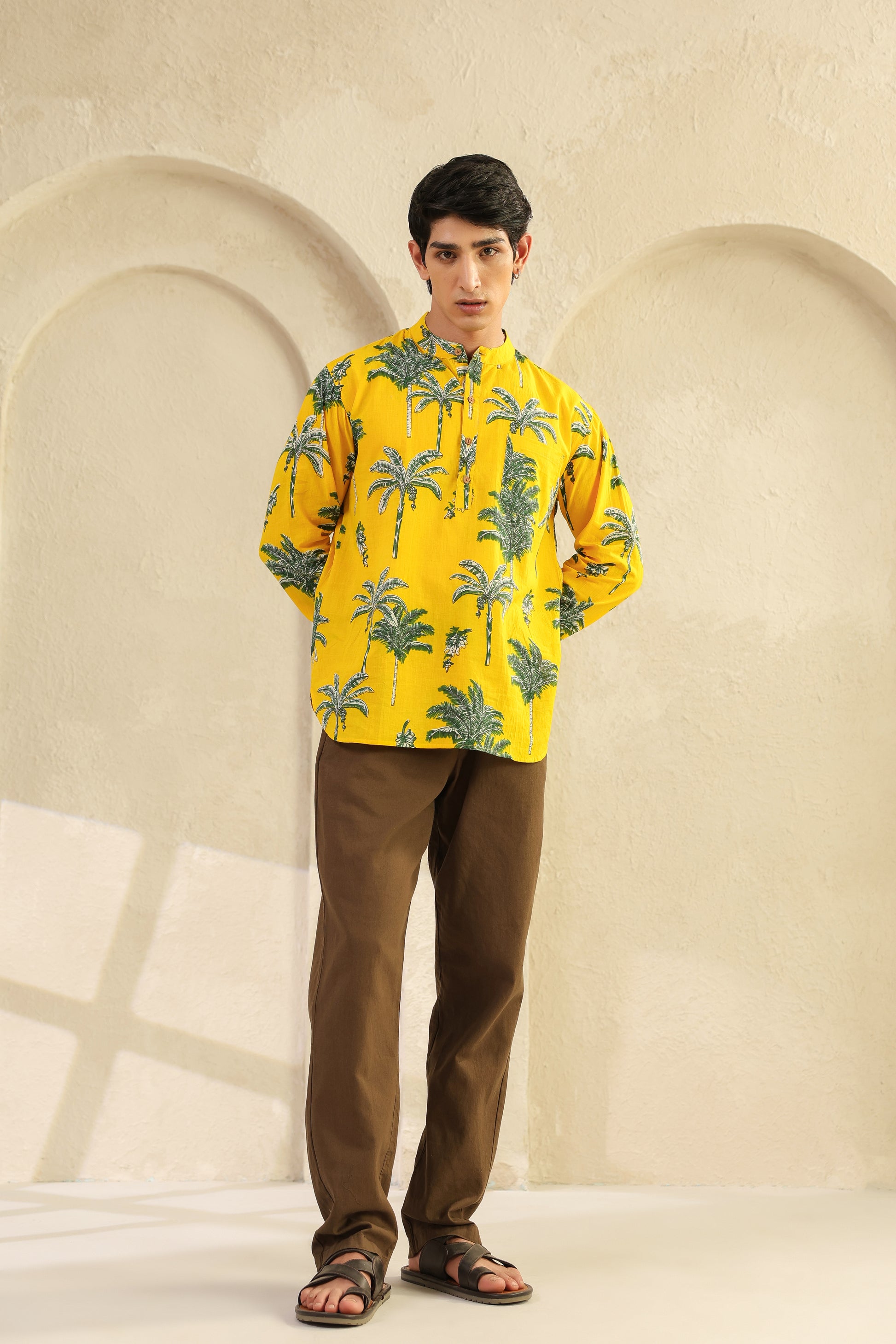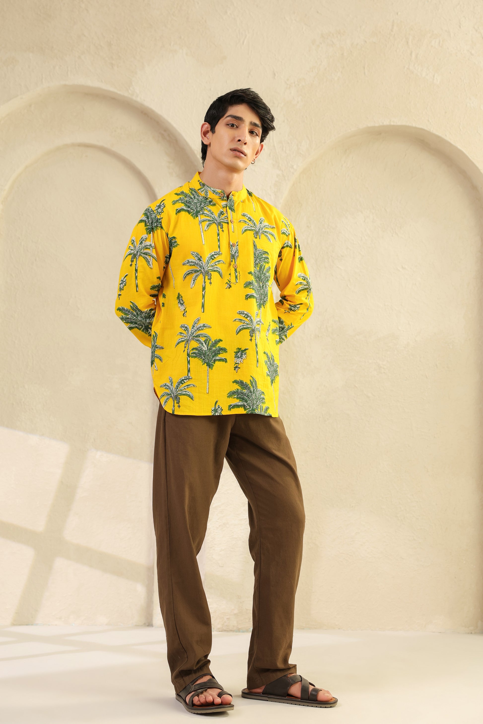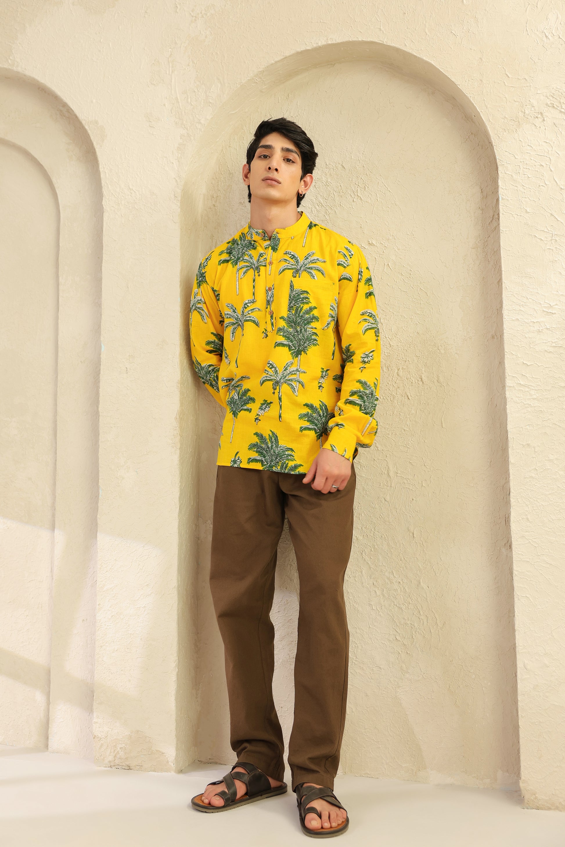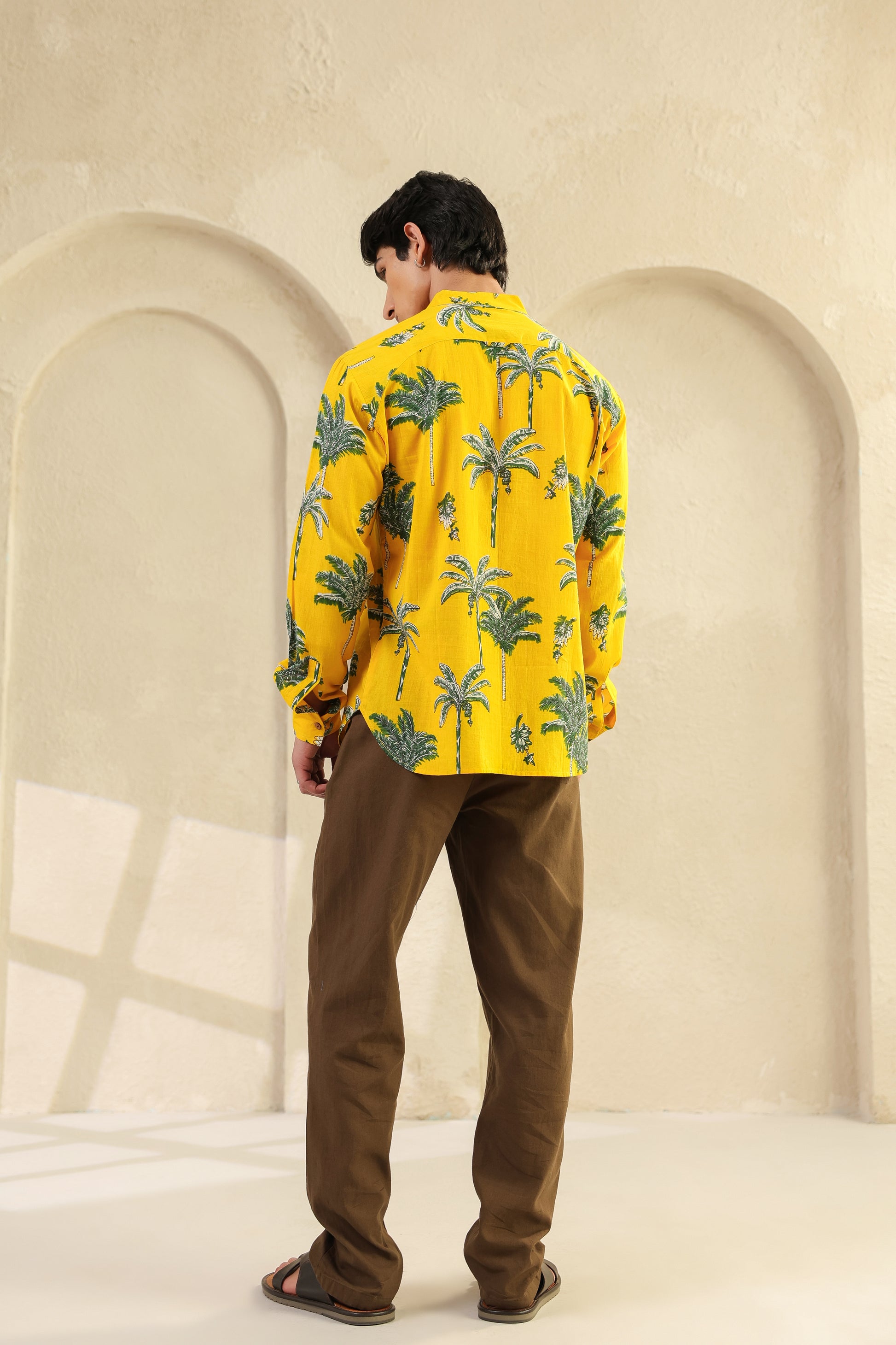 The print carries a sense of escape, tall palms rising over a sunlit yellow base, like a quiet getaway. Stitched in breathable cotton with hand-done care, it’s made for slow days and bold hearts. A piece for the man who doesn’t try too hard, but always stands out.