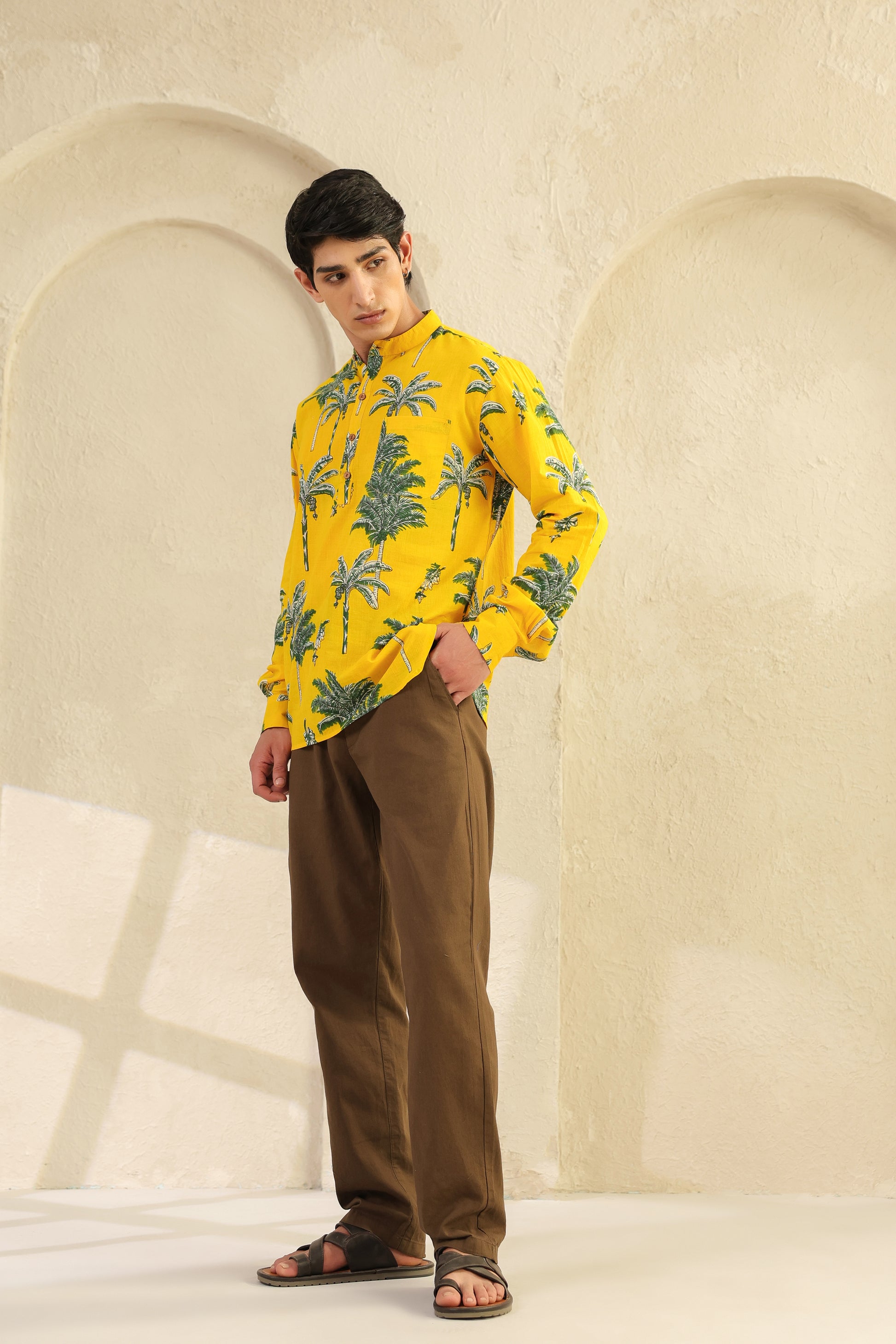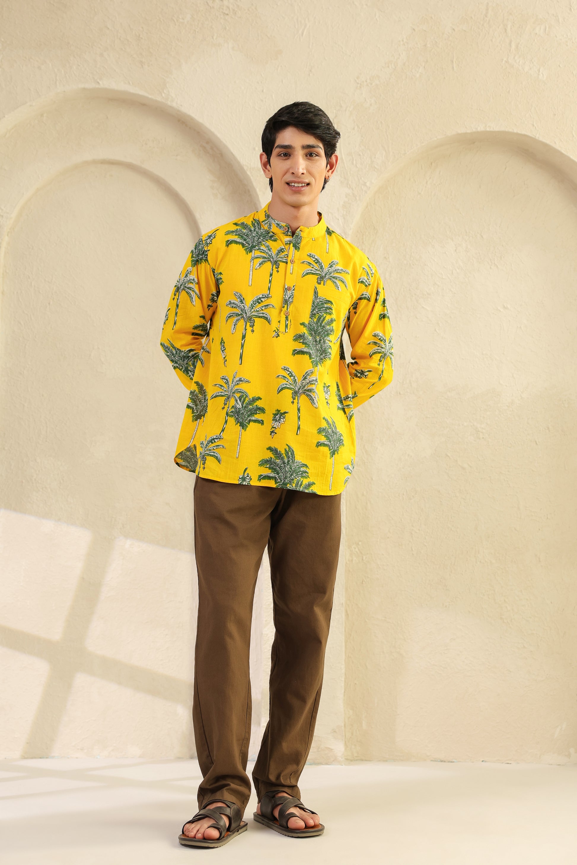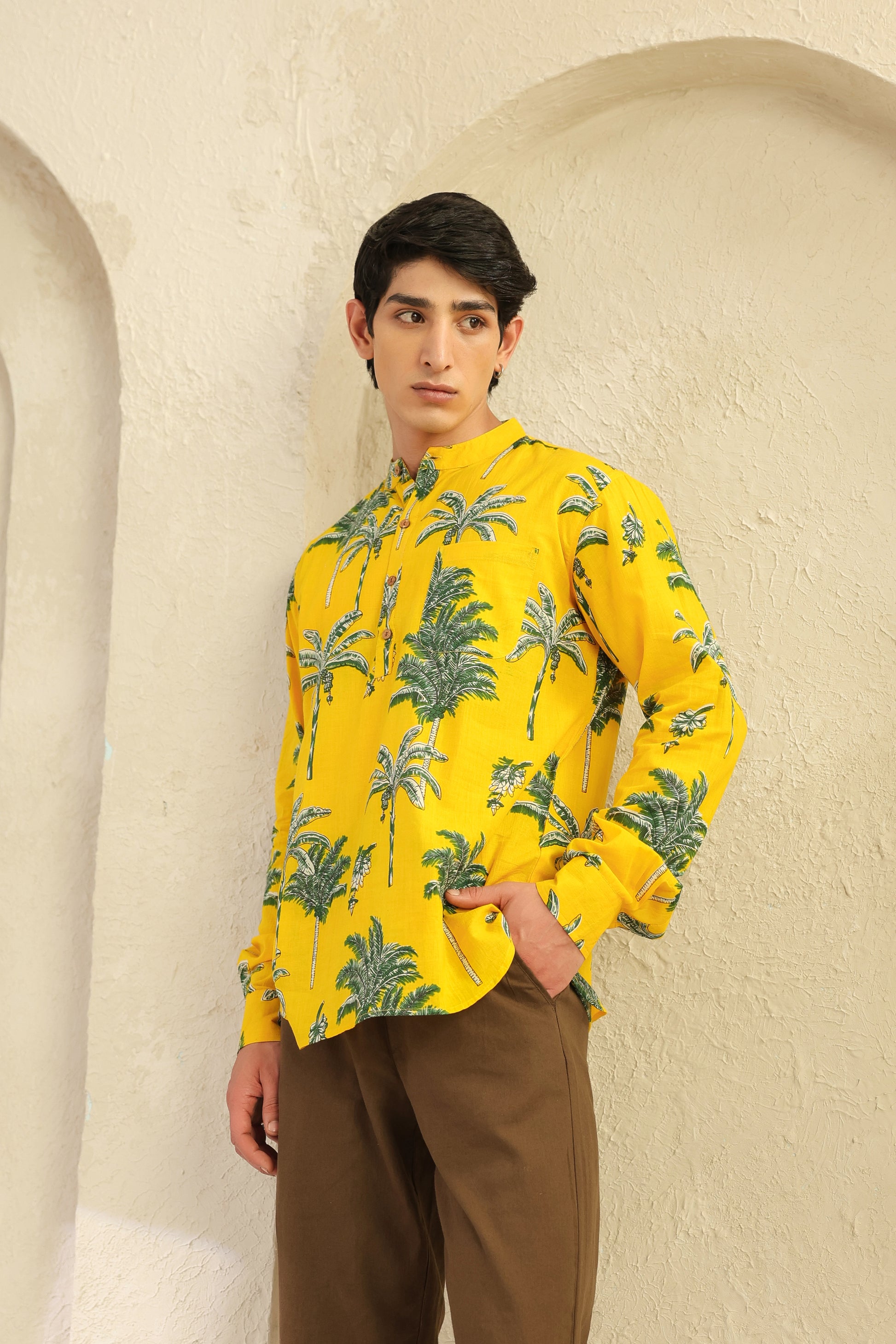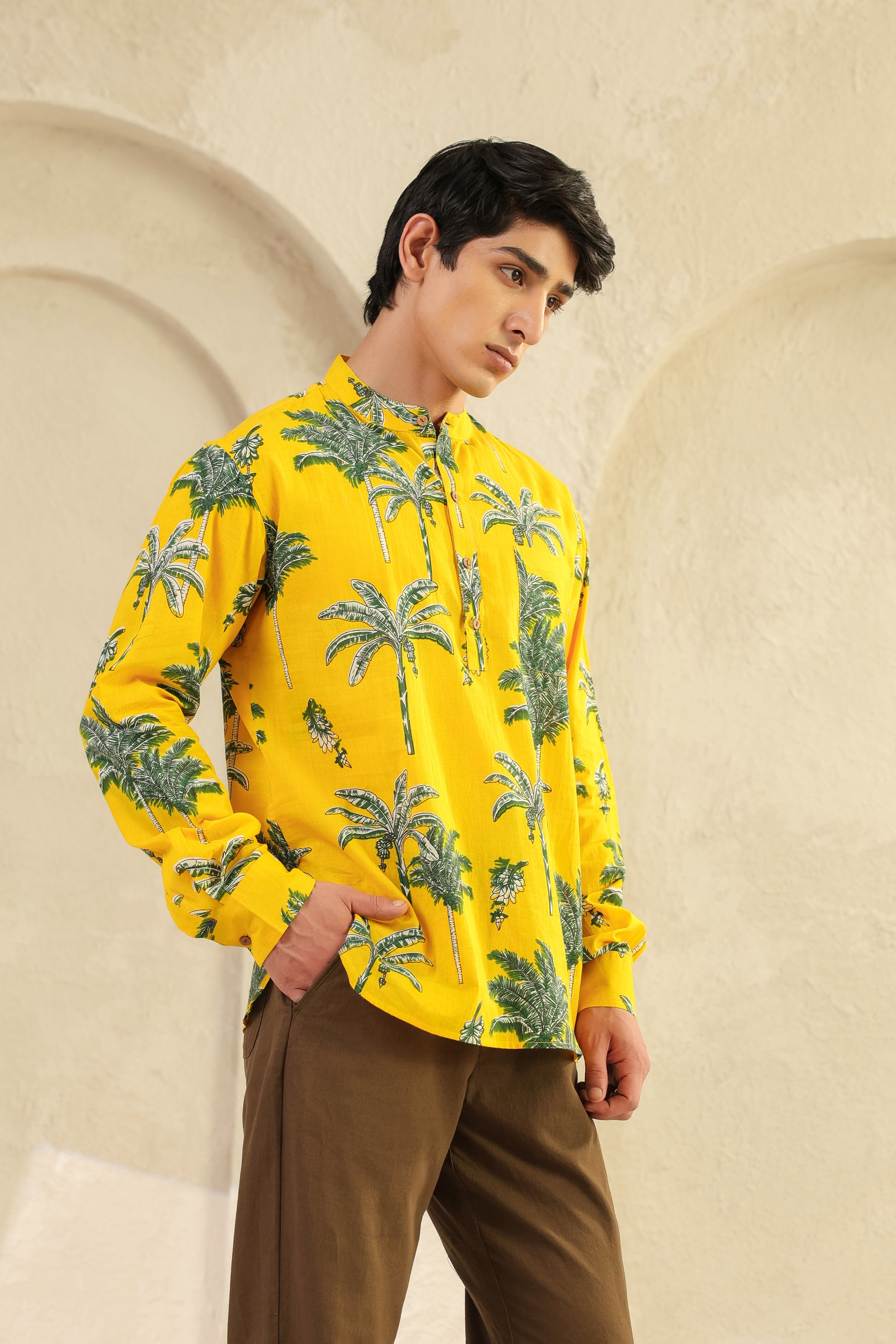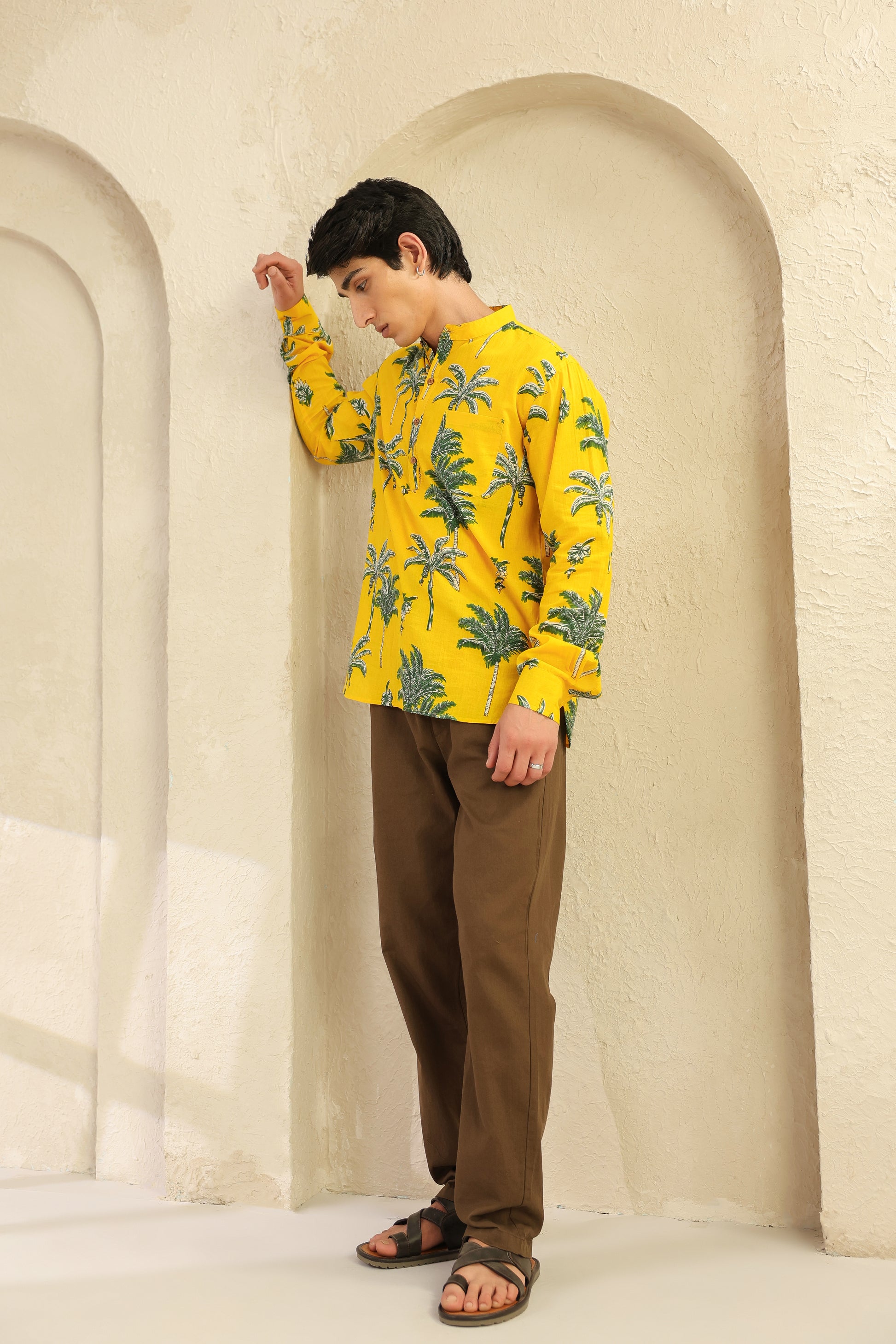 The print carries a sense of escape, tall palms rising over a sunlit yellow base, like a quiet getaway. Stitched in breathable cotton with hand-done care, it’s made for slow days and bold hearts. A piece for the man who doesn’t try too hard, but always stands out.