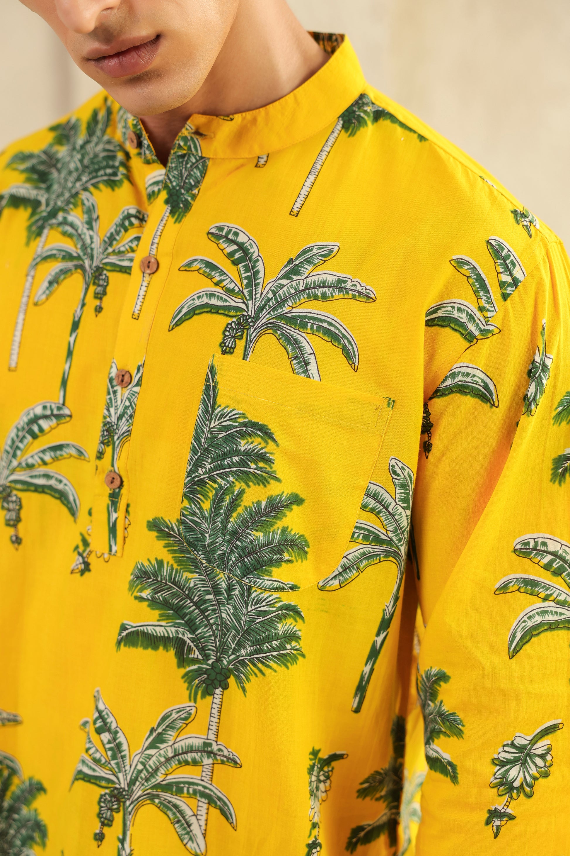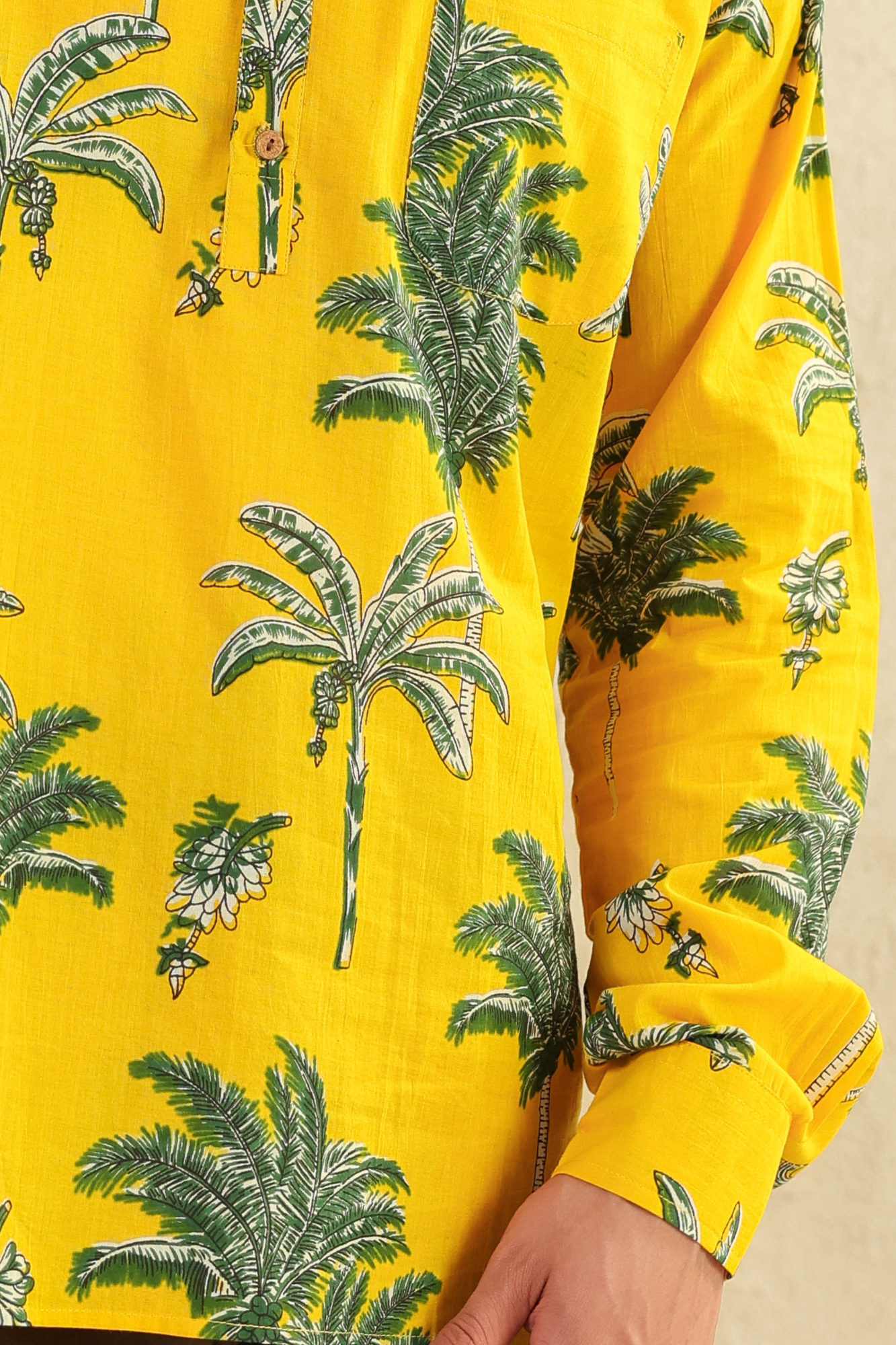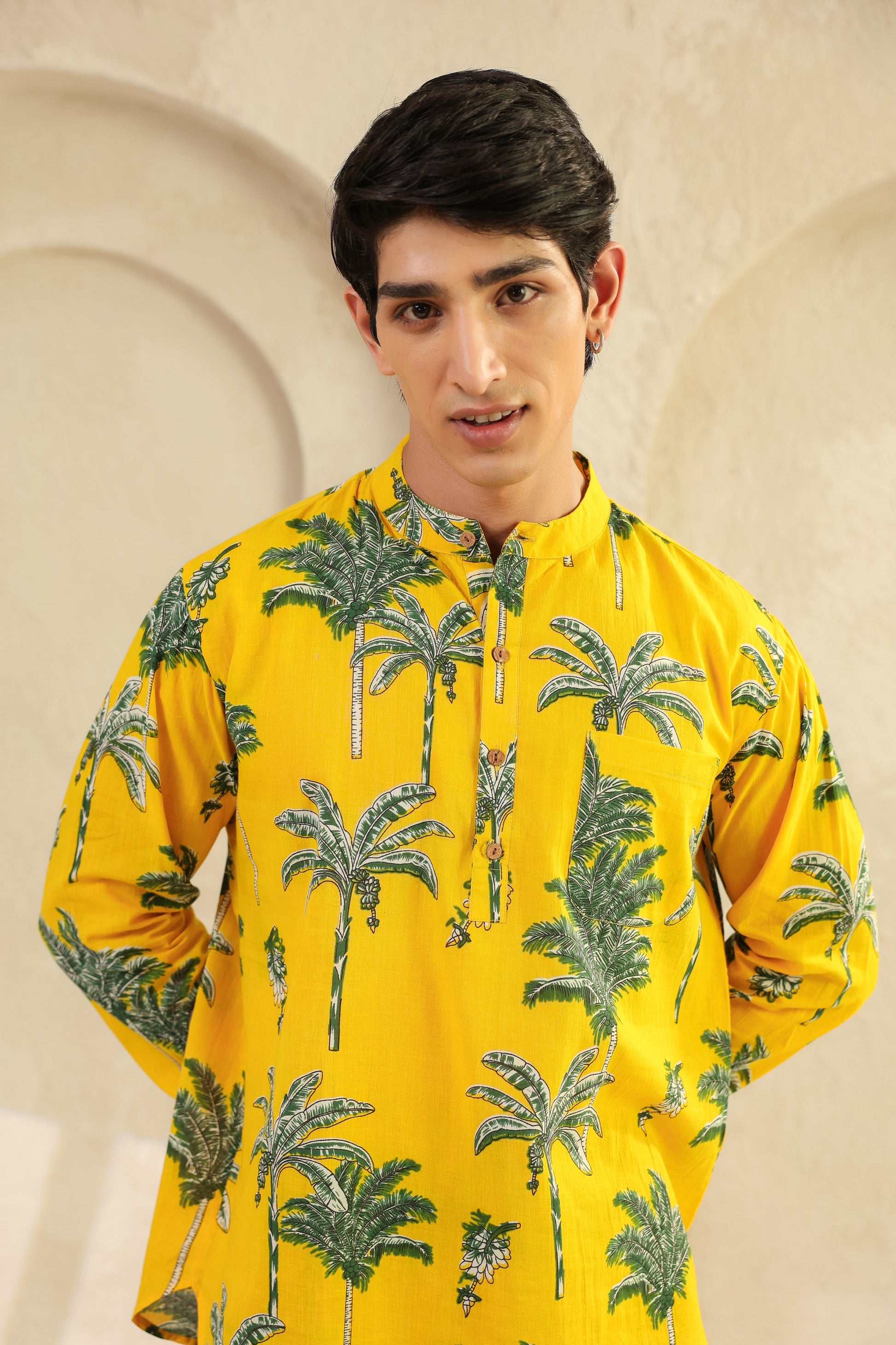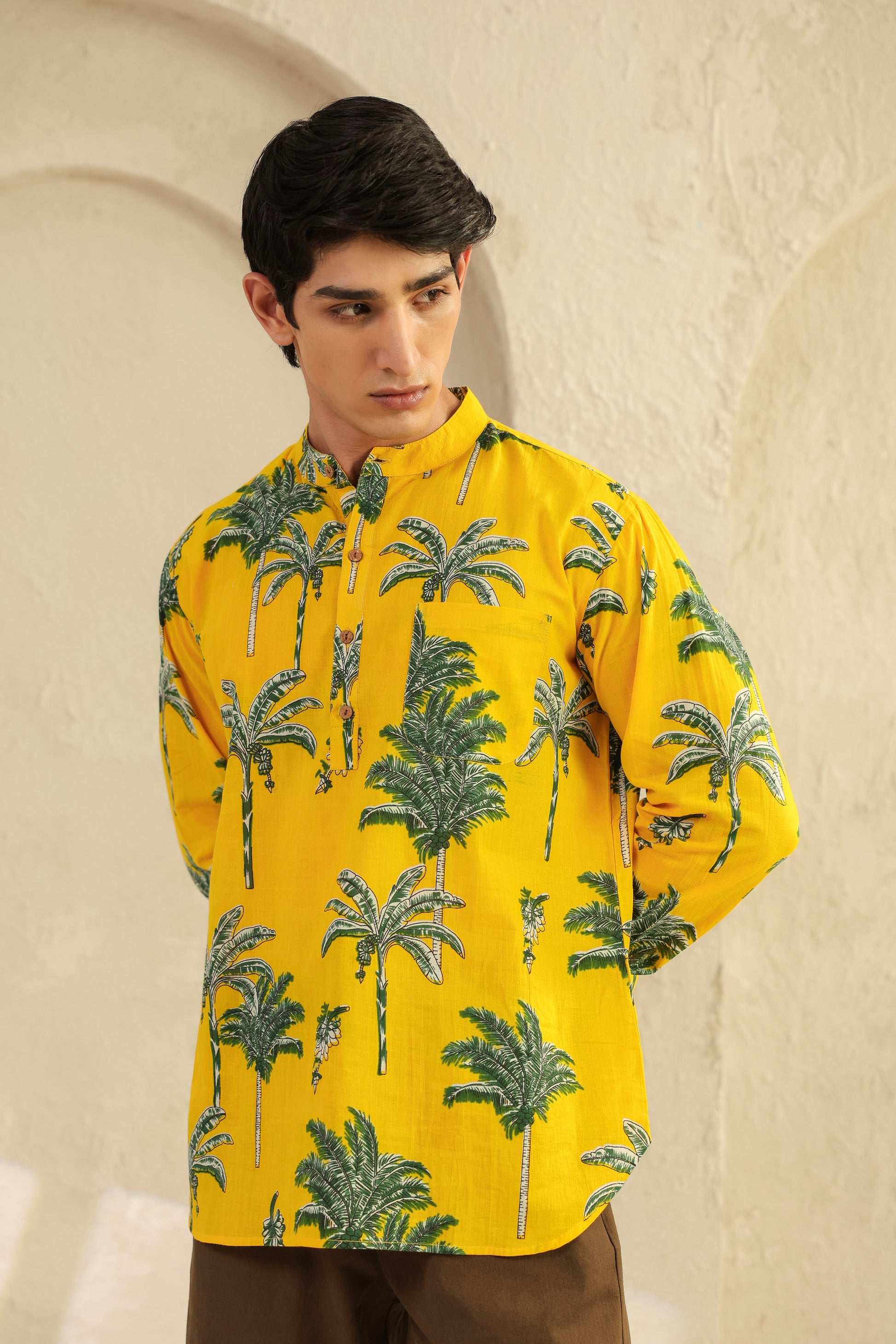 The print carries a sense of escape, tall palms rising over a sunlit yellow base, like a quiet getaway. Stitched in breathable cotton with hand-done care, it’s made for slow days and bold hearts. A piece for the man who doesn’t try too hard, but always stands out.