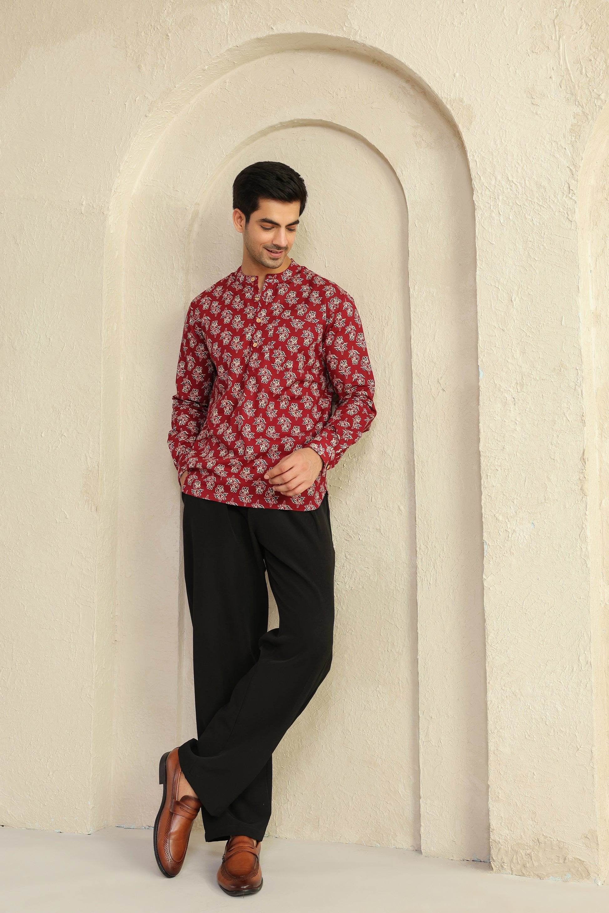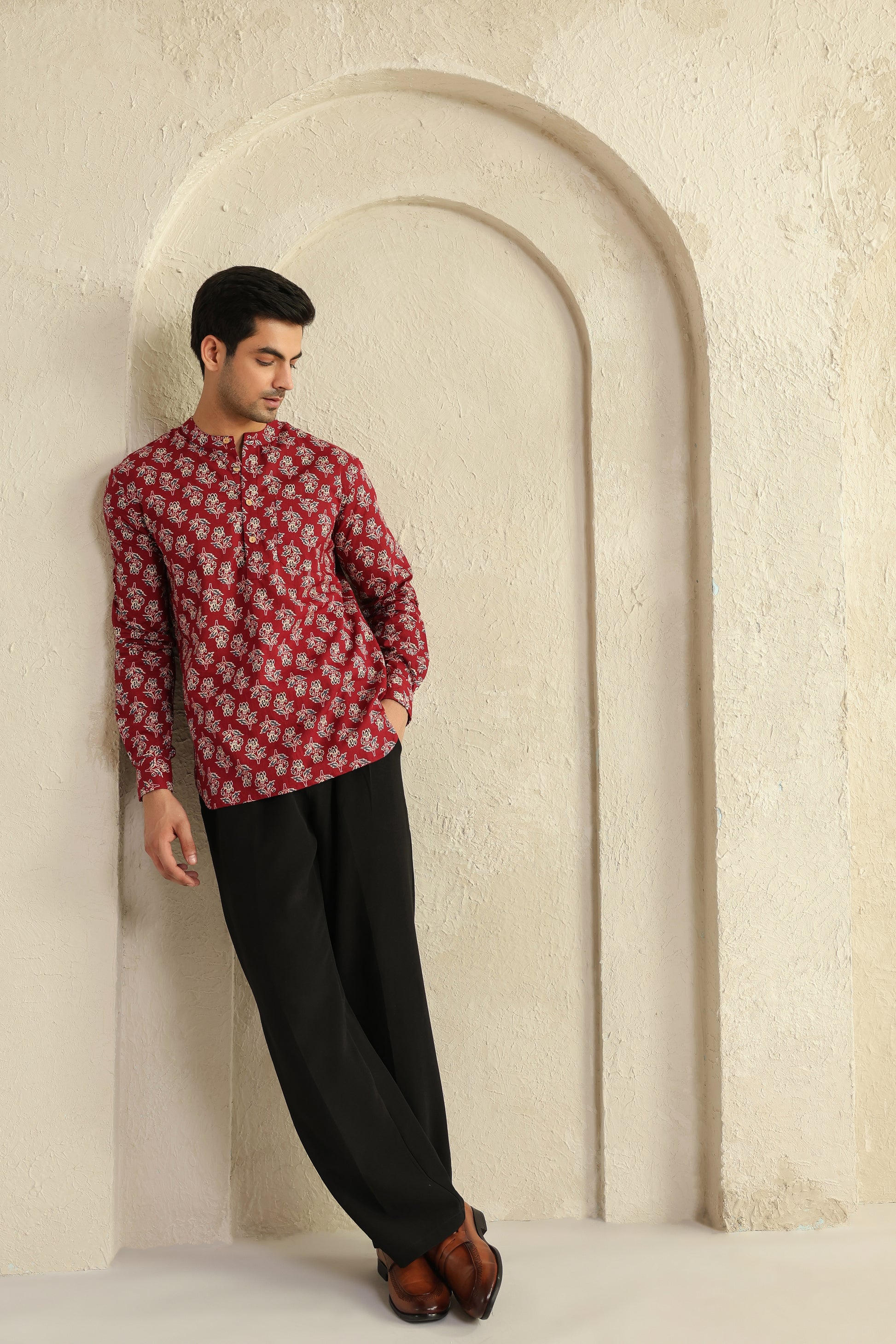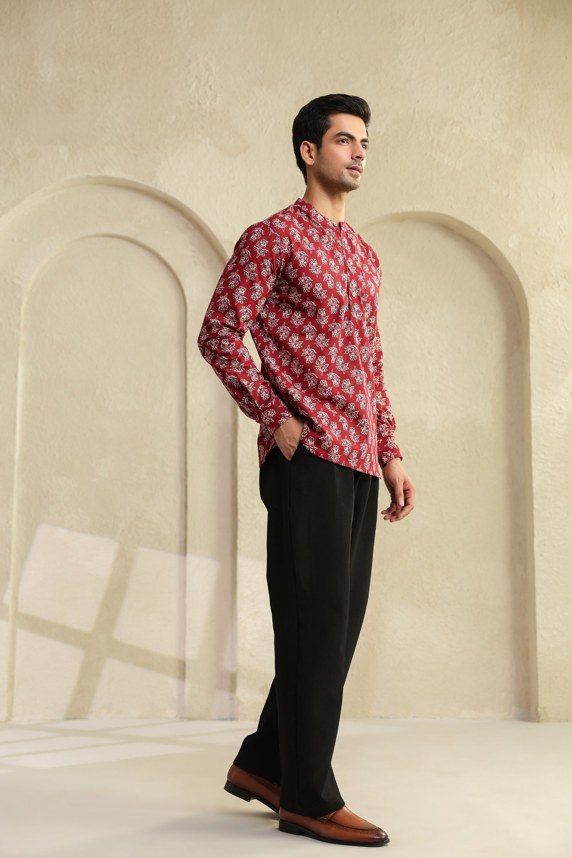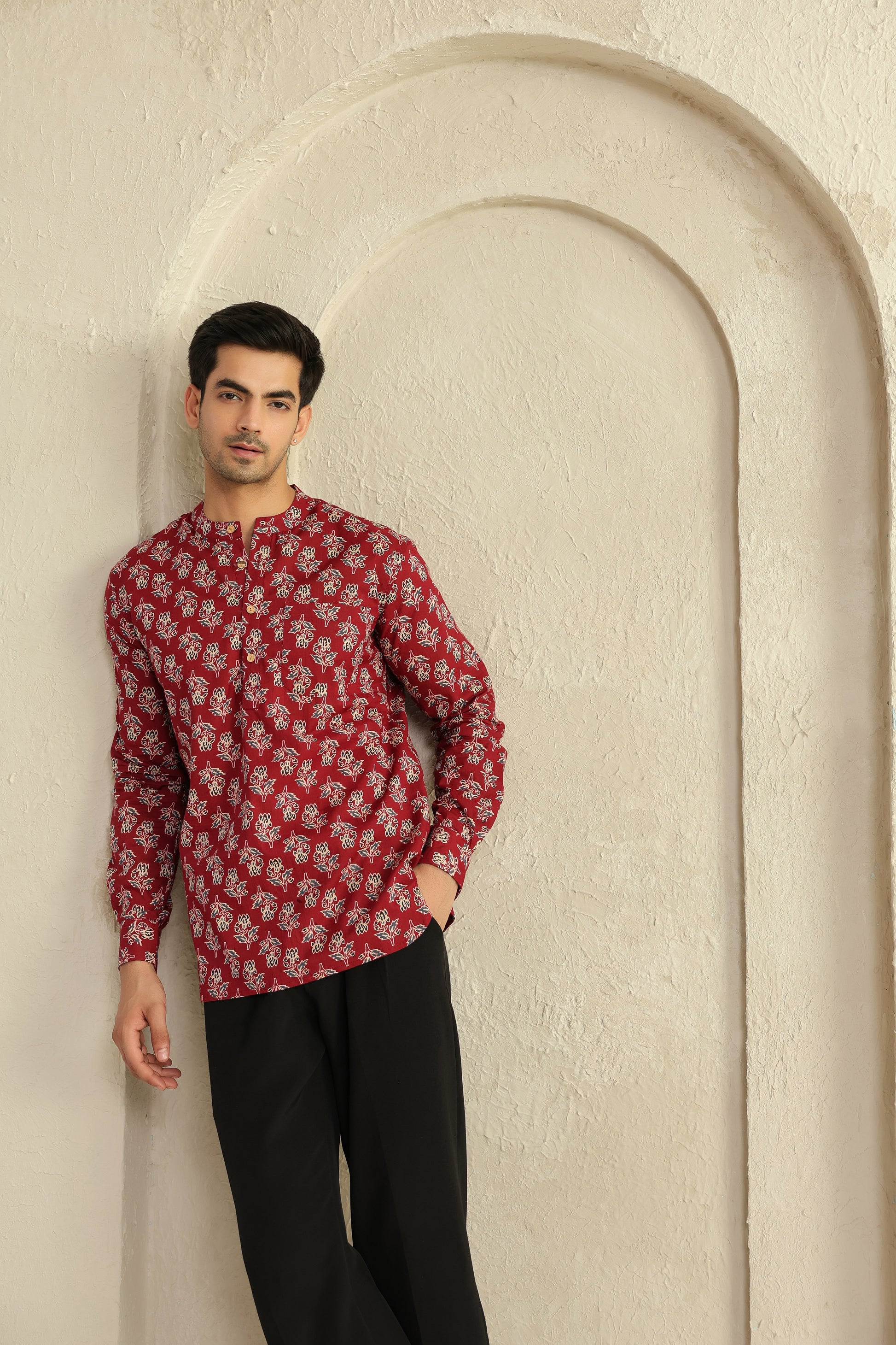 The deep rust cotton holds warmth without weight. It’s soft to touch, tailored in a regular fit with full sleeves and a mandarin collar that adds quiet structure. Hand stitched with care, every detail feels intentional. This is for the man who values stillness in design and strength in simplicity.