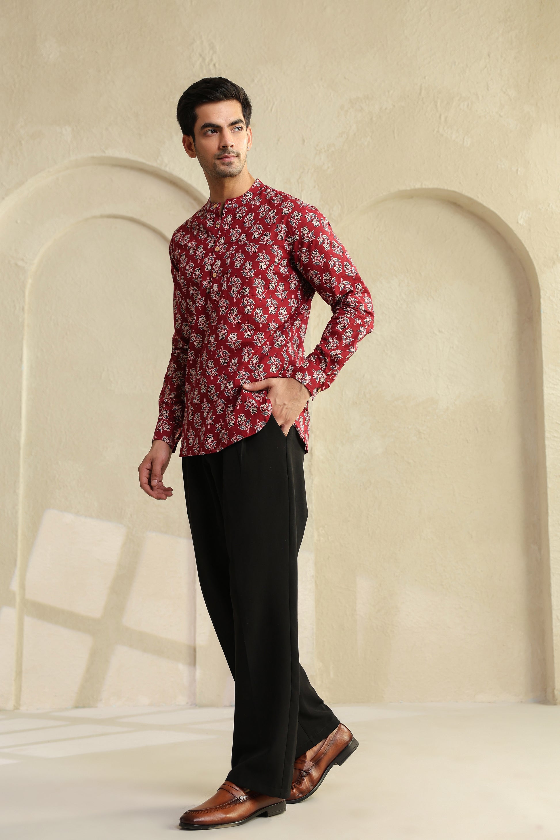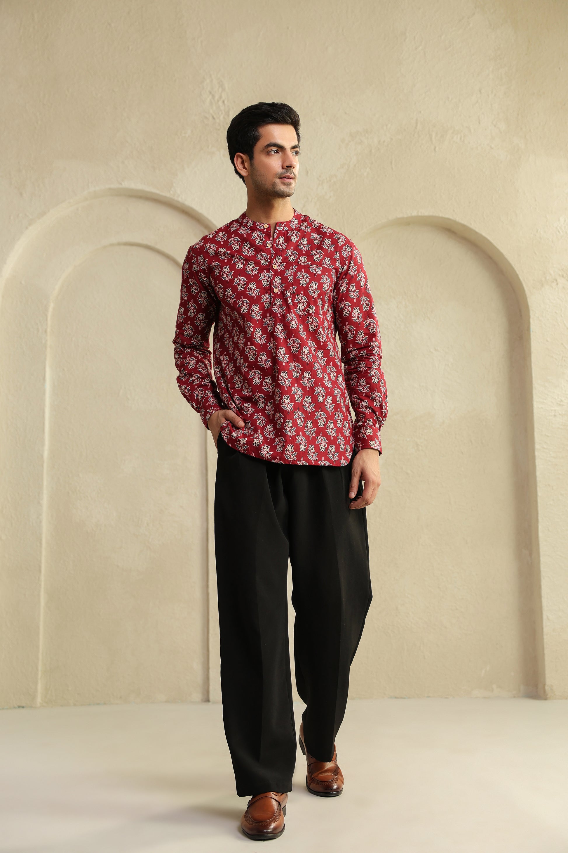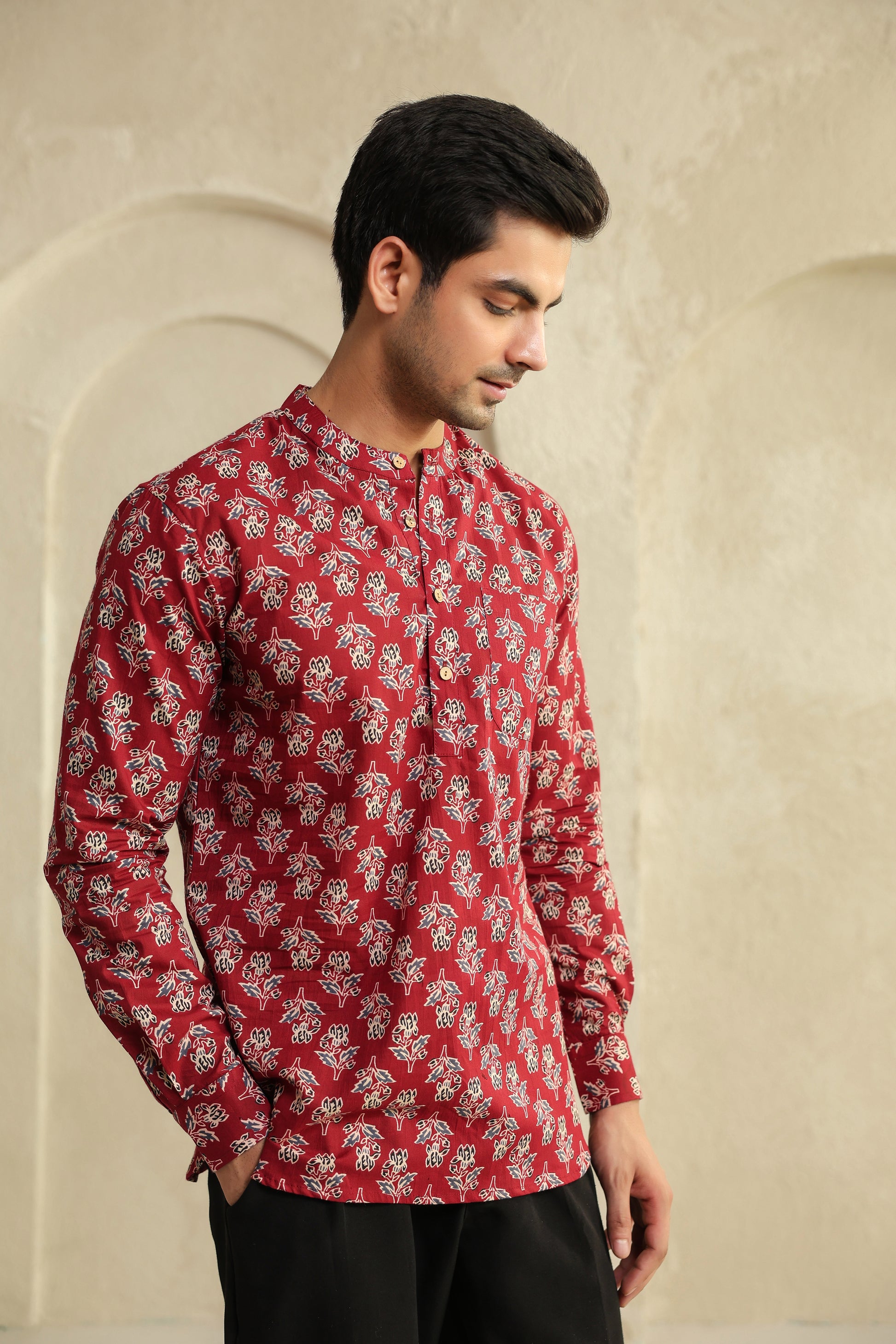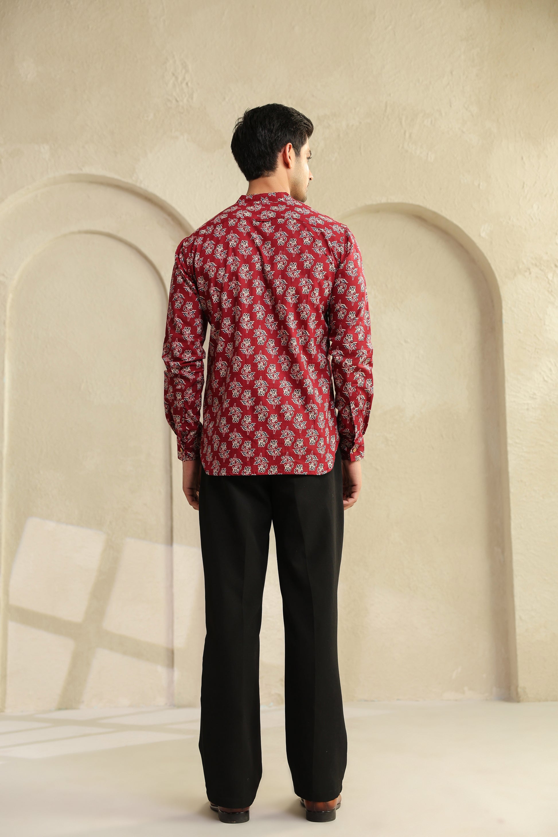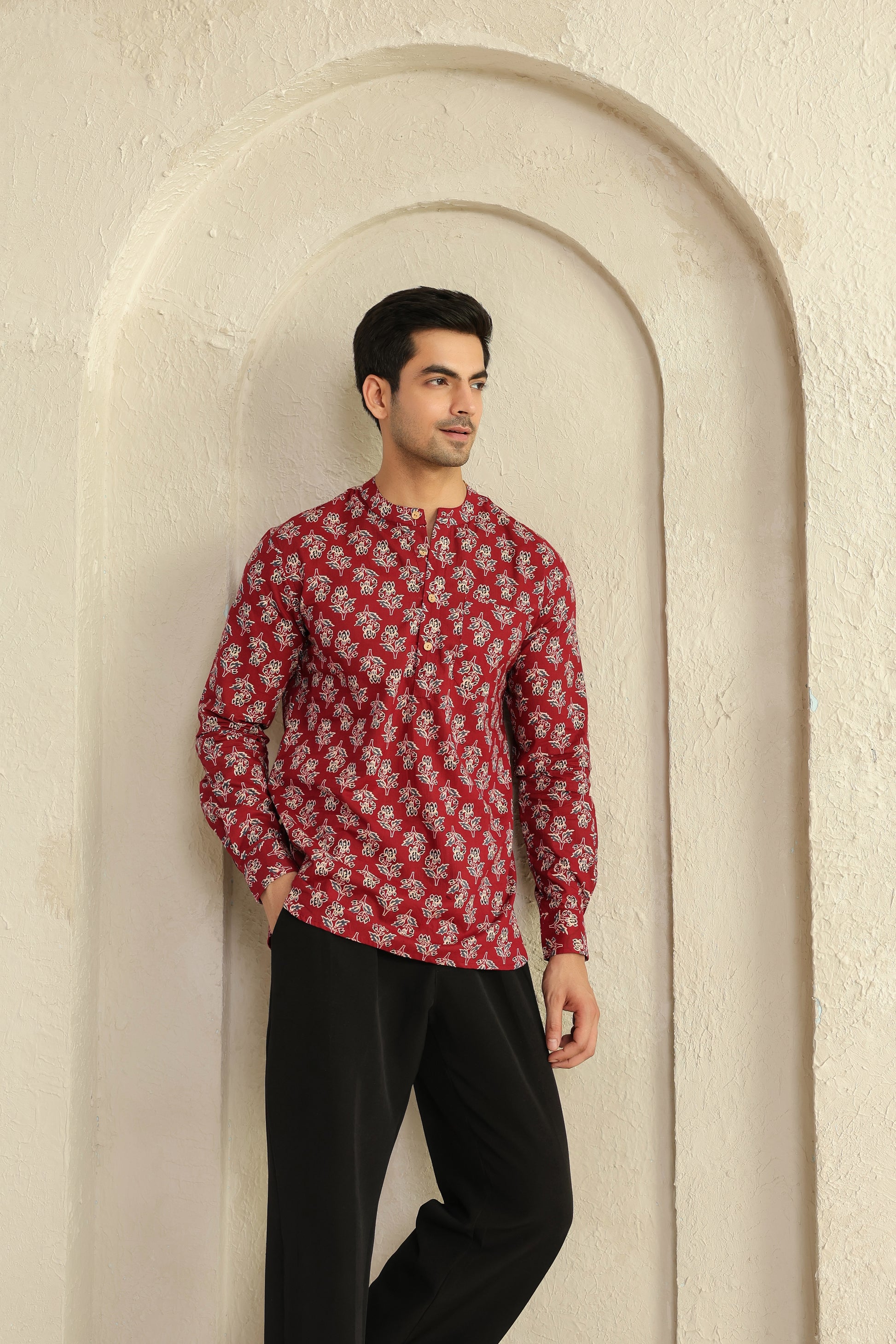 The deep rust cotton holds warmth without weight. It’s soft to touch, tailored in a regular fit with full sleeves and a mandarin collar that adds quiet structure. Hand stitched with care, every detail feels intentional. This is for the man who values stillness in design and strength in simplicity.