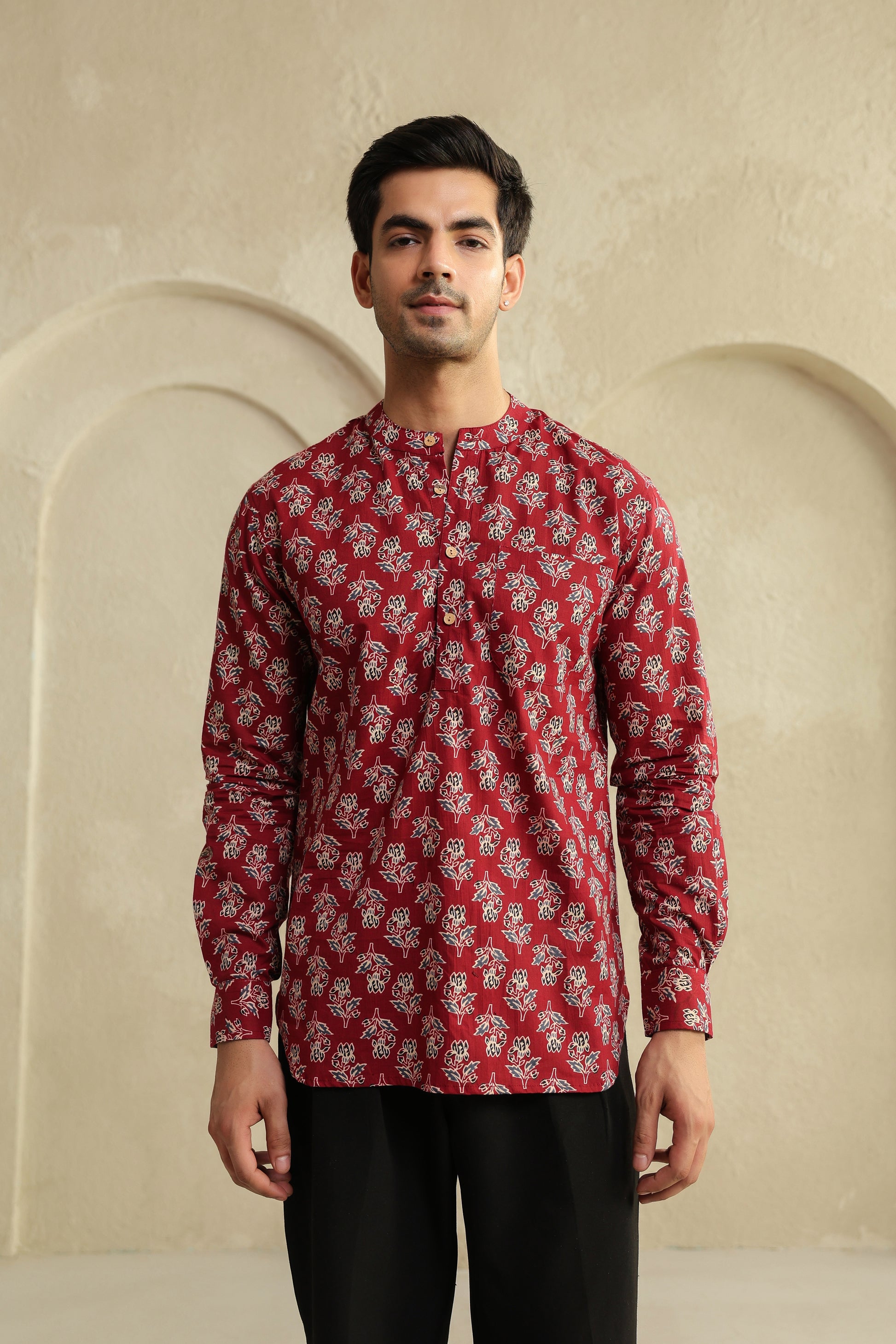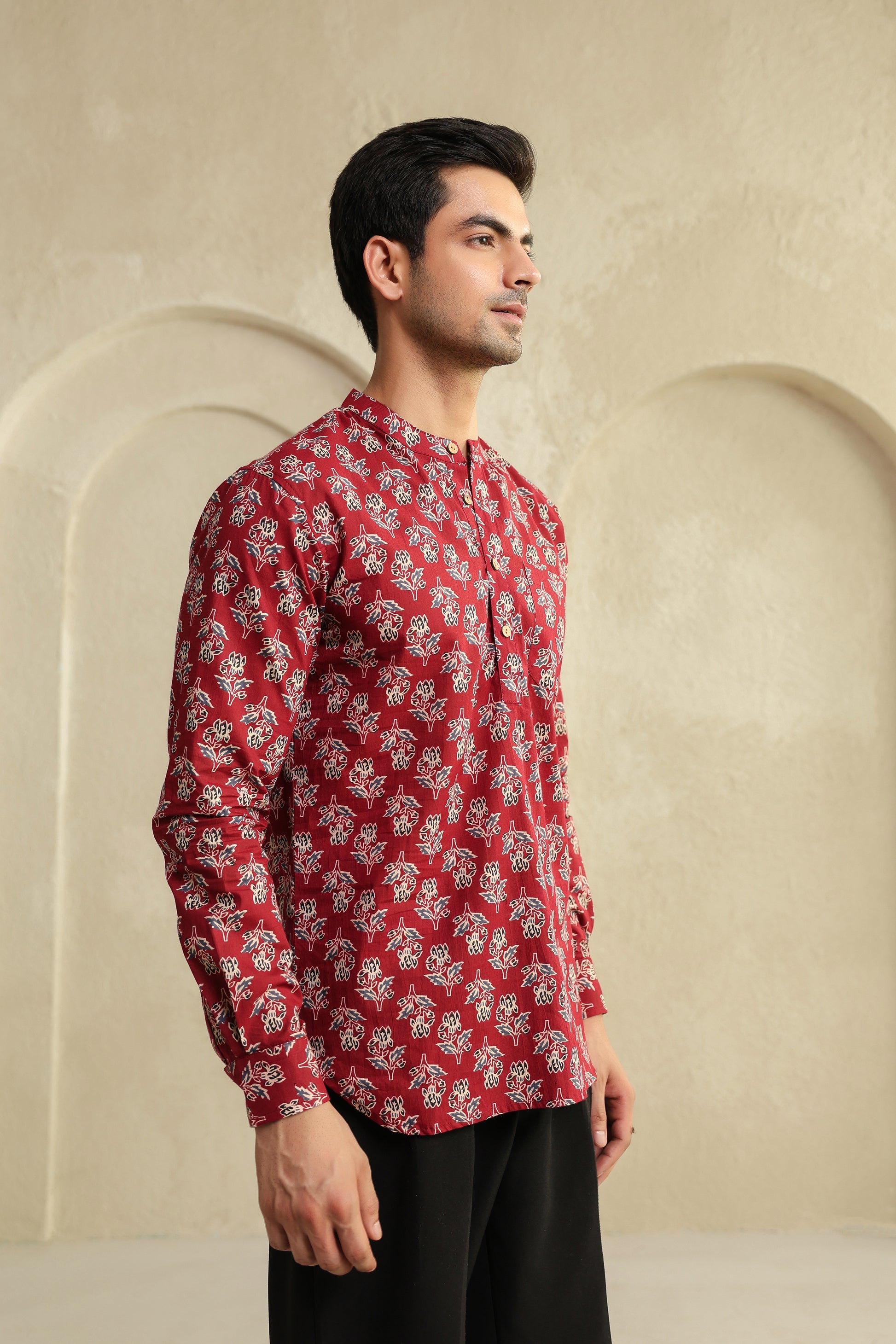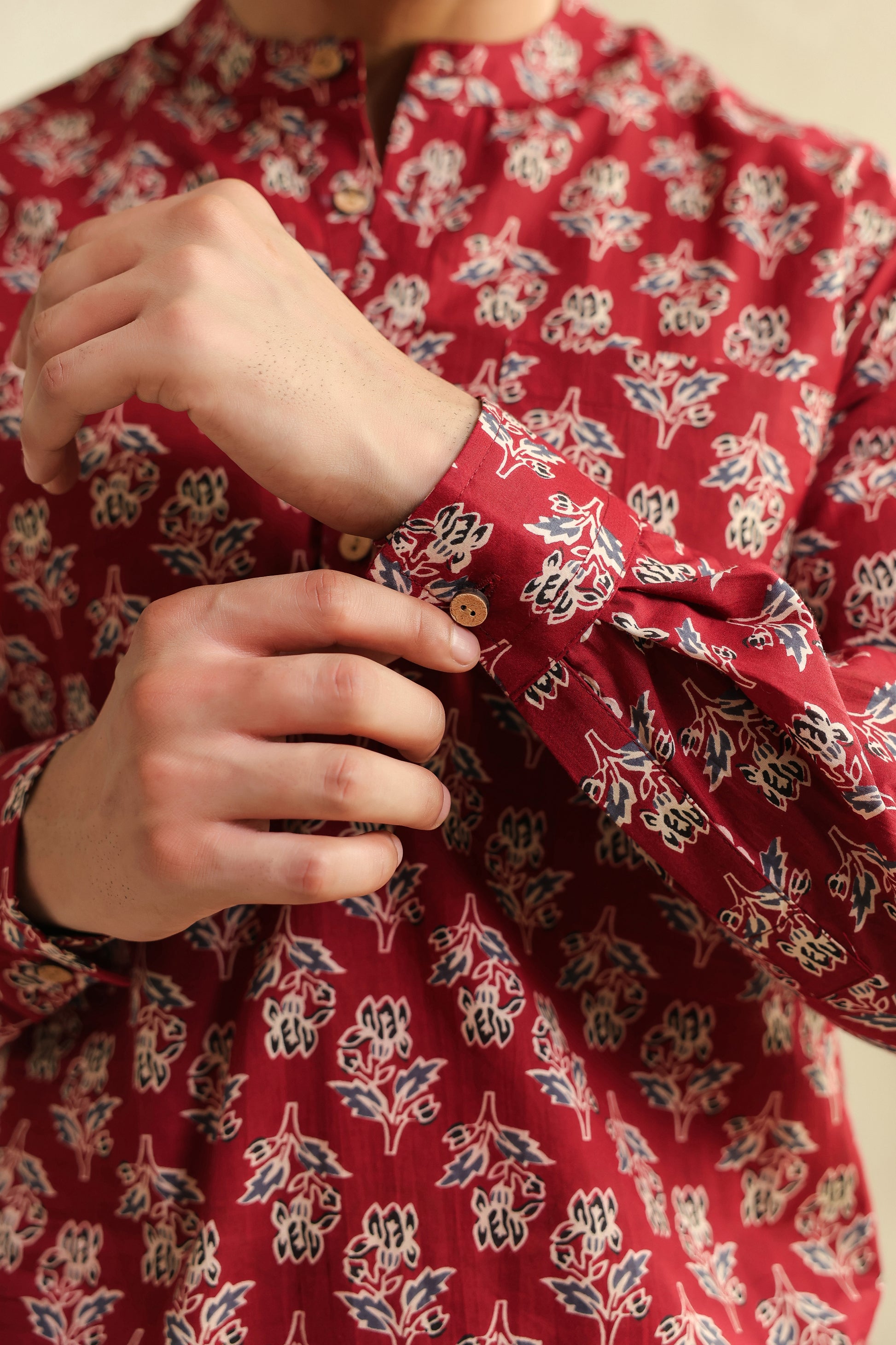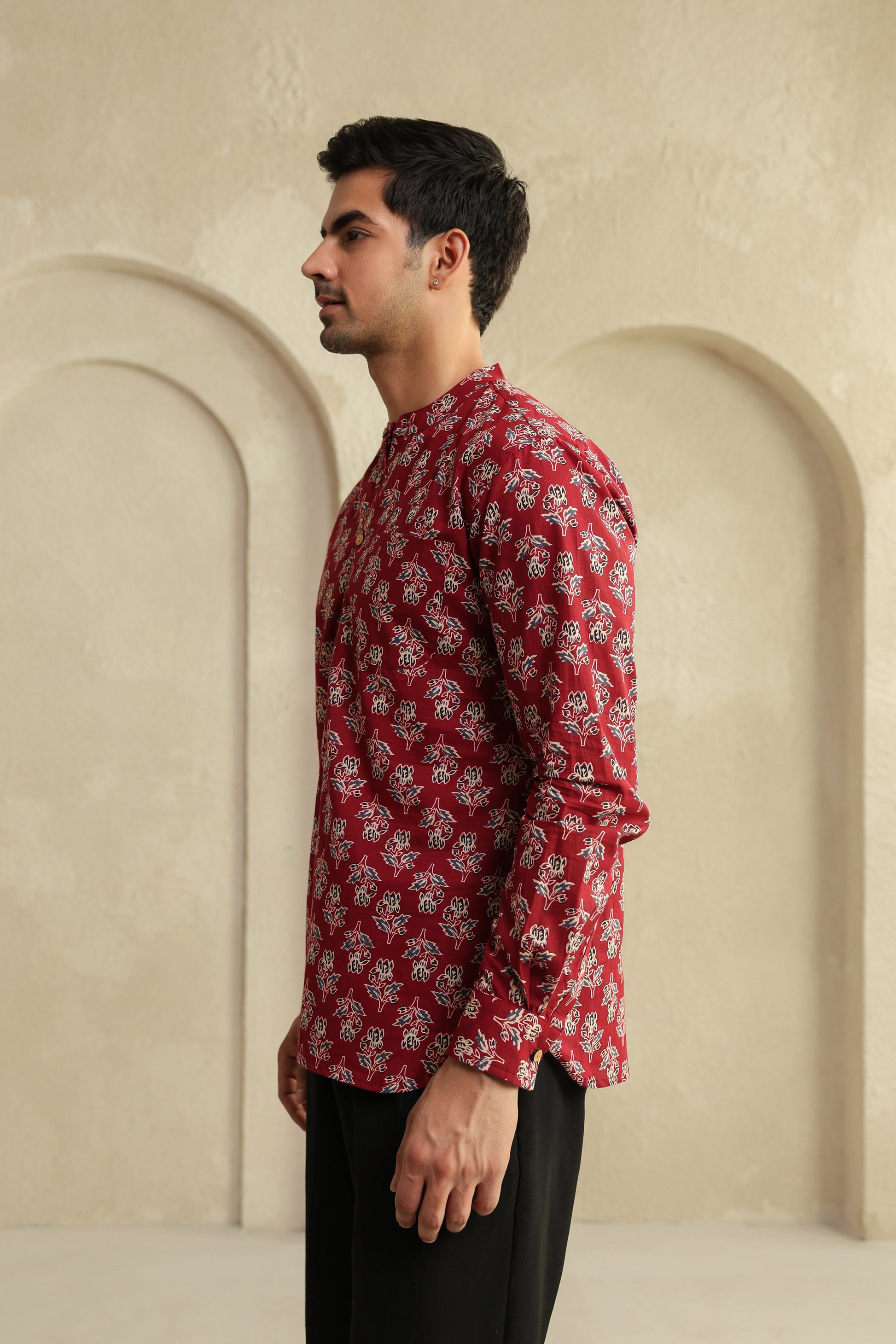 The deep rust cotton holds warmth without weight. It’s soft to touch, tailored in a regular fit with full sleeves and a mandarin collar that adds quiet structure. Hand stitched with care, every detail feels intentional. This is for the man who values stillness in design and strength in simplicity.