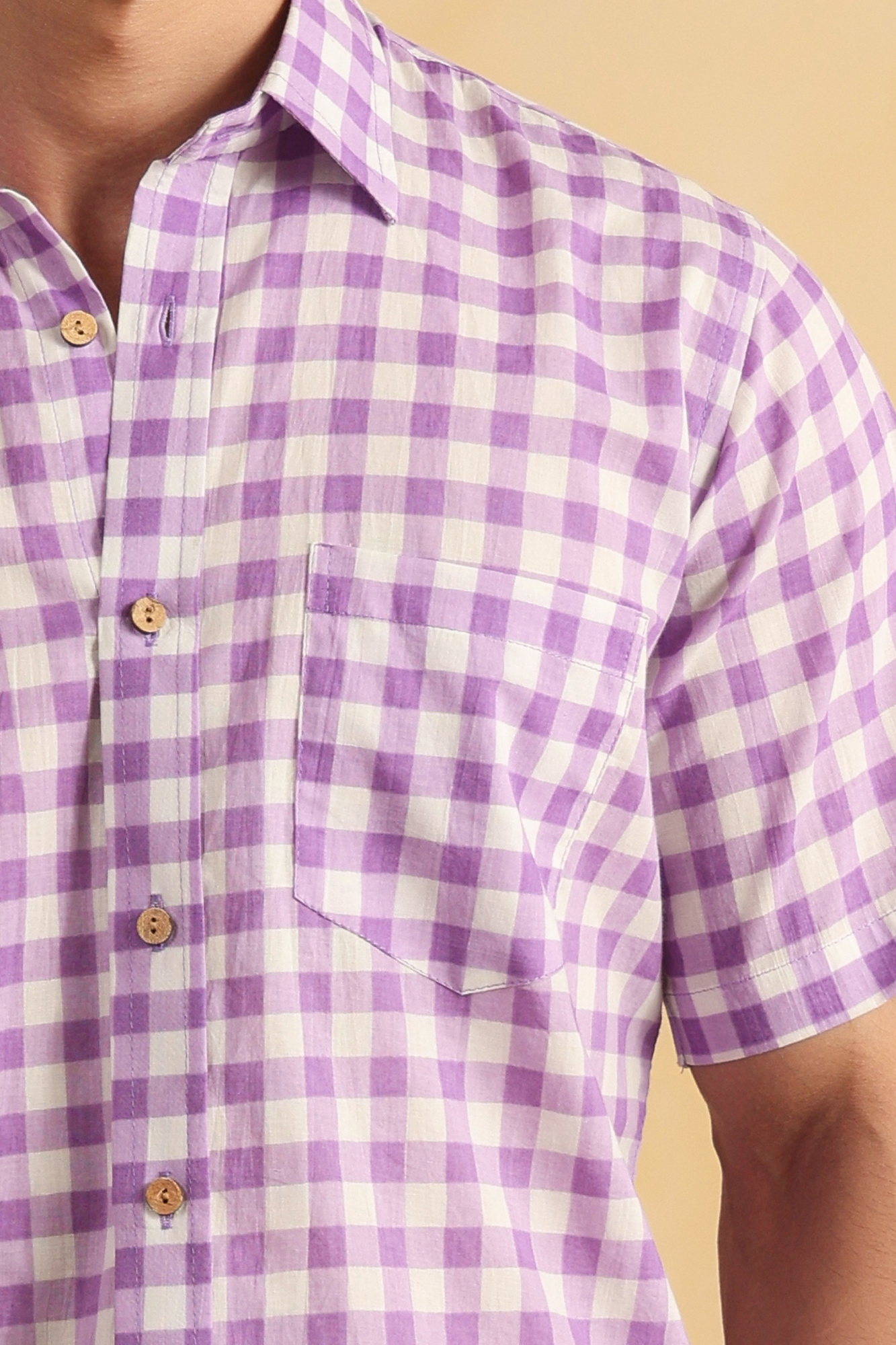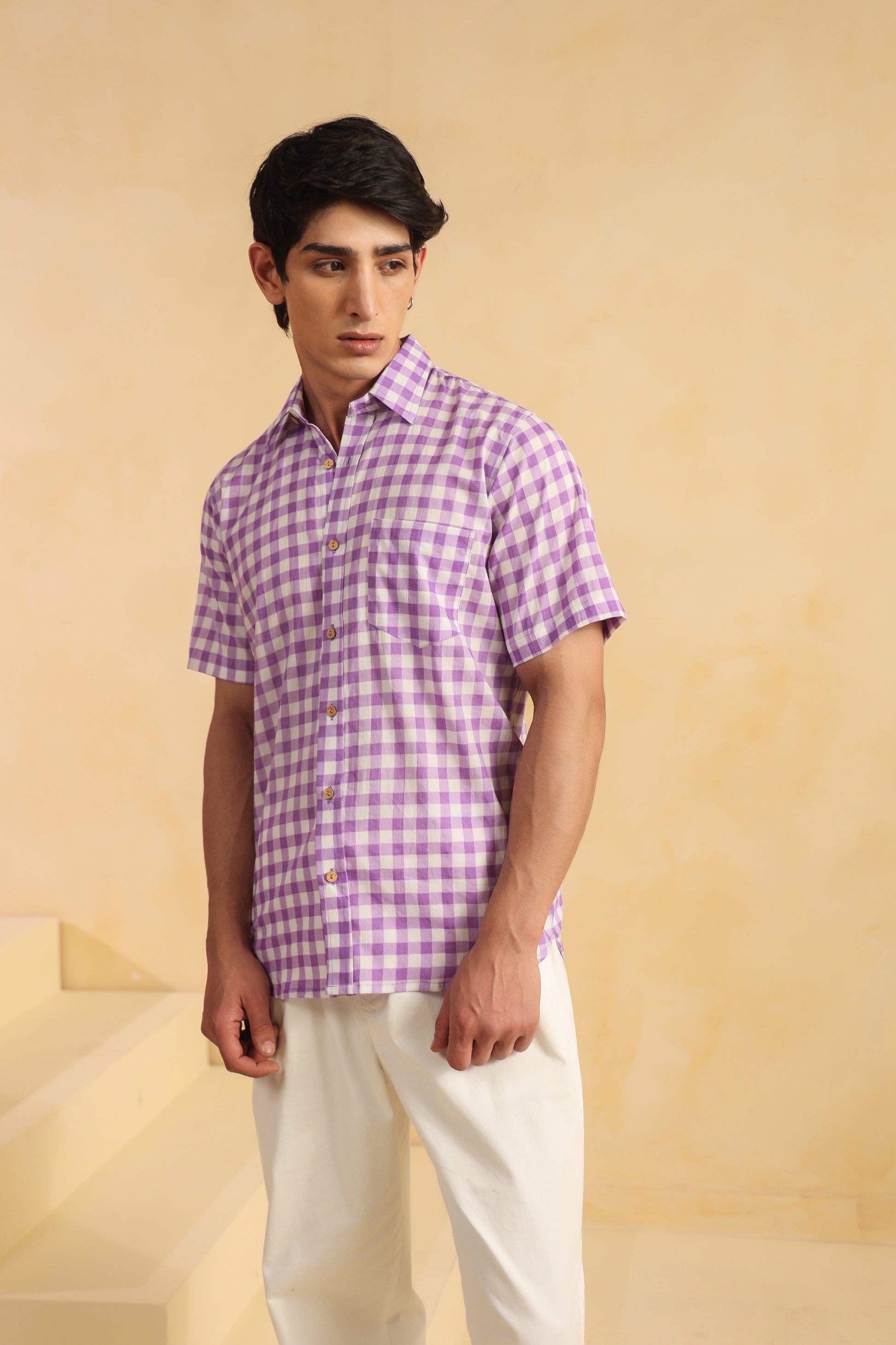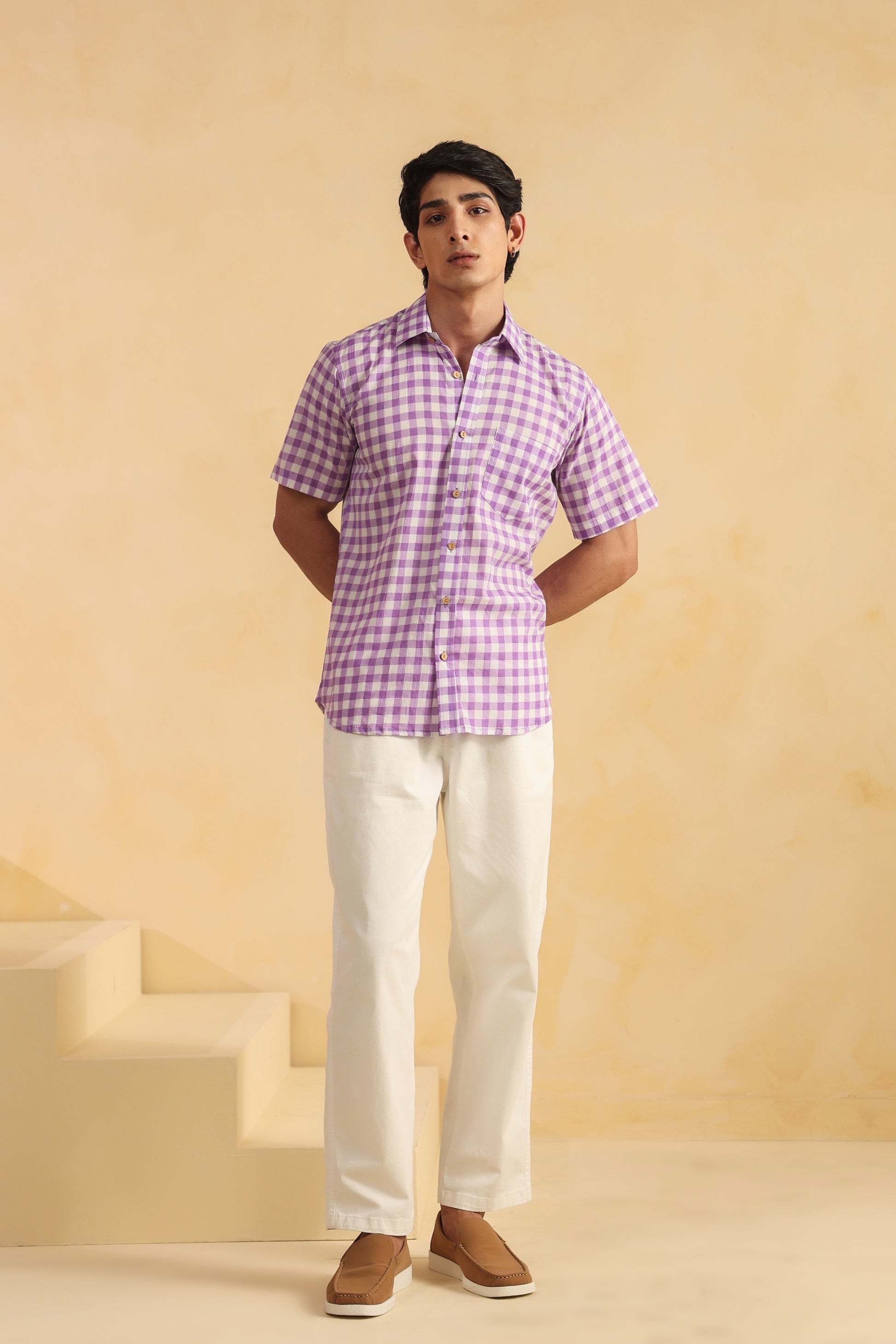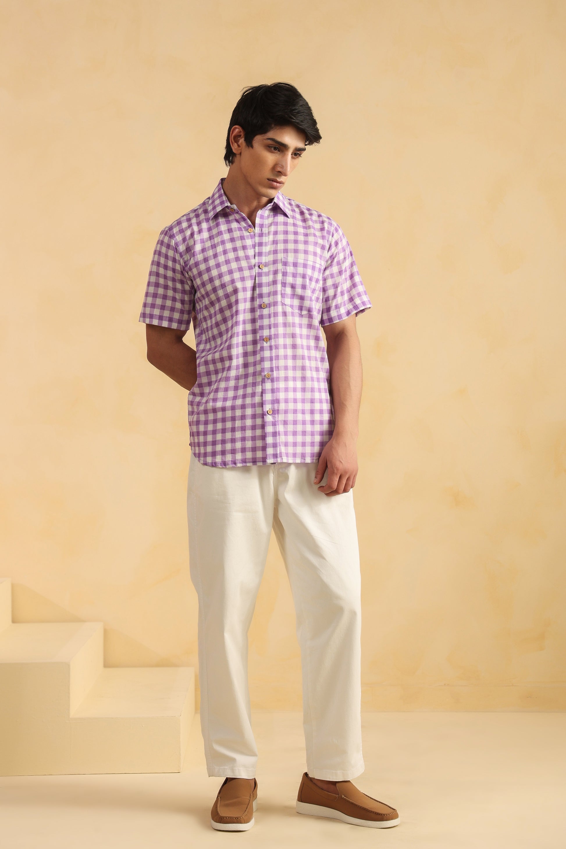 The soft lavender checks aren’t just a pattern. They carry a kind of ease that feels both fresh and familiar. Inspired by classic gingham but softened for today, the shirt has a calm rhythm when you look closely. Each line, each square, sits in quiet balance. Made from pure cotton, stitched by hand, it feels light and breathable — like a second skin on warm days. Just like the man who chooses to wear it, it doesn’t try too hard. It just feels right.