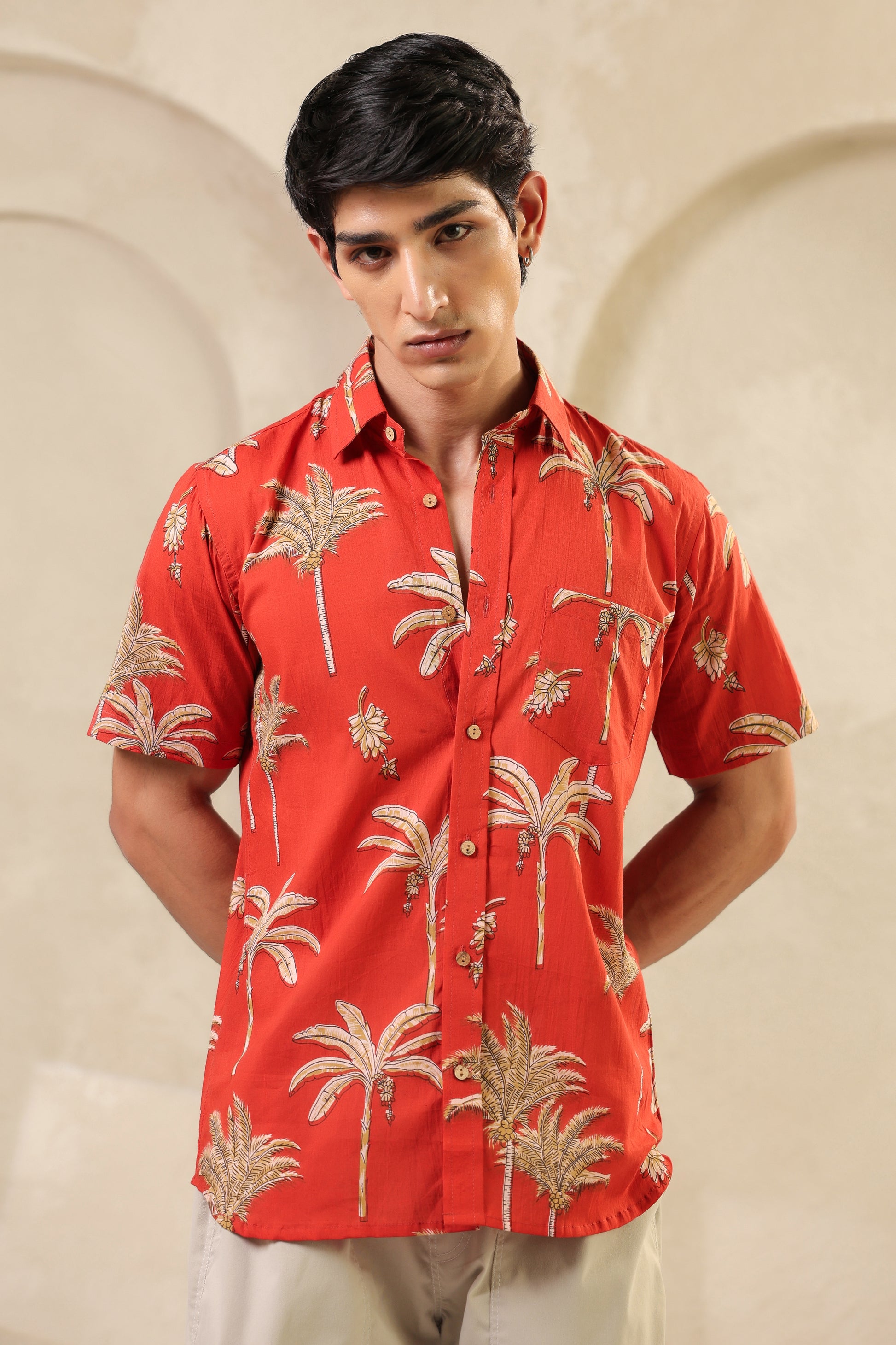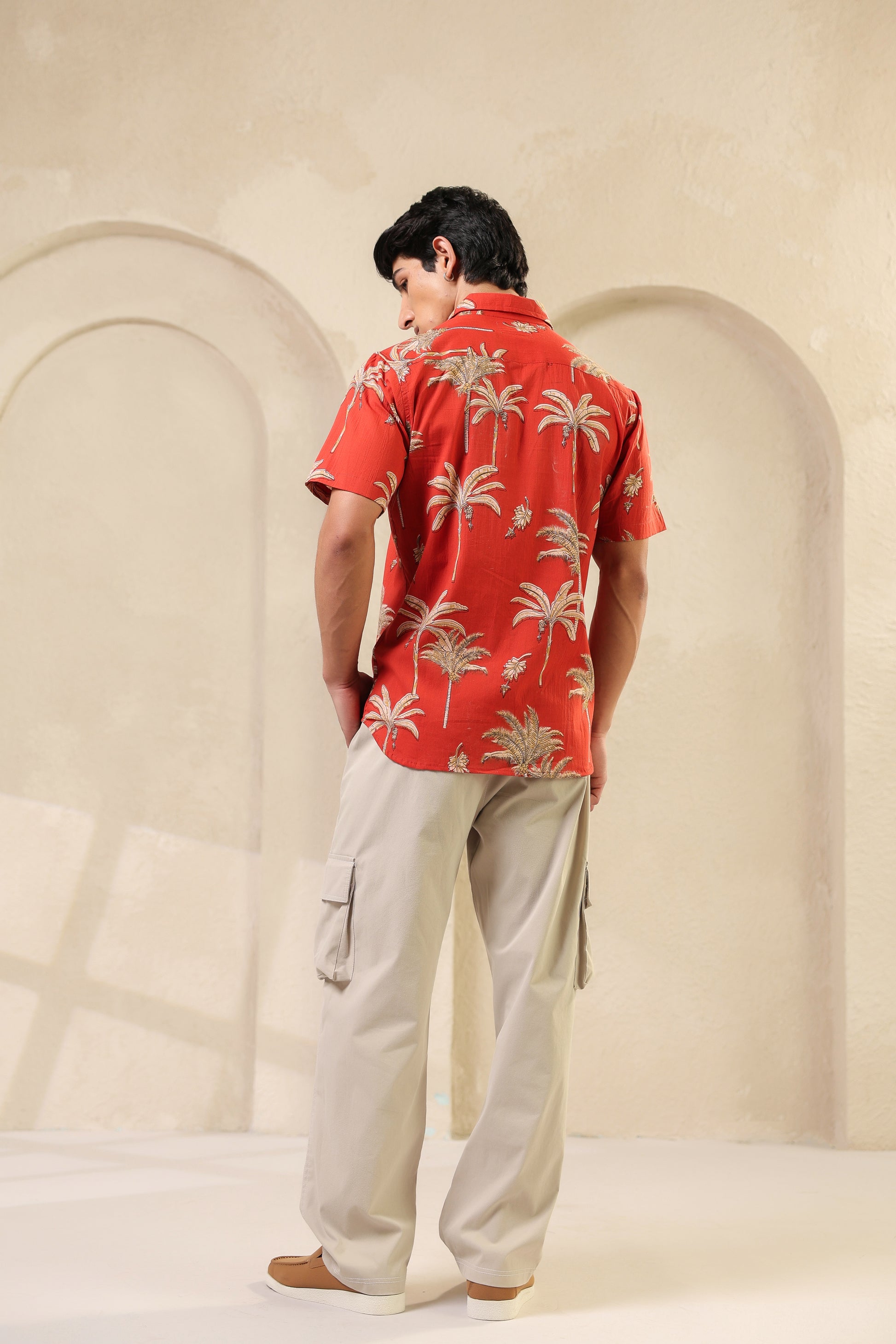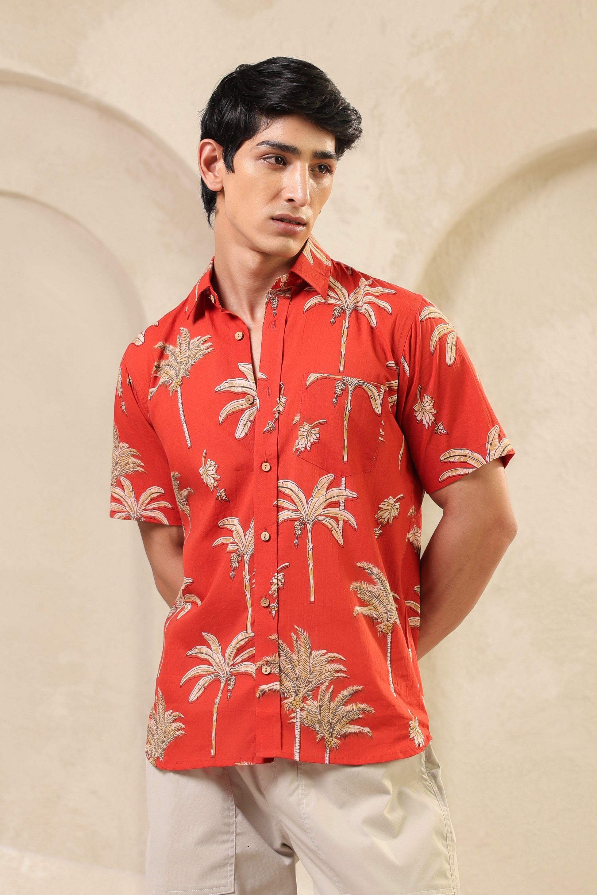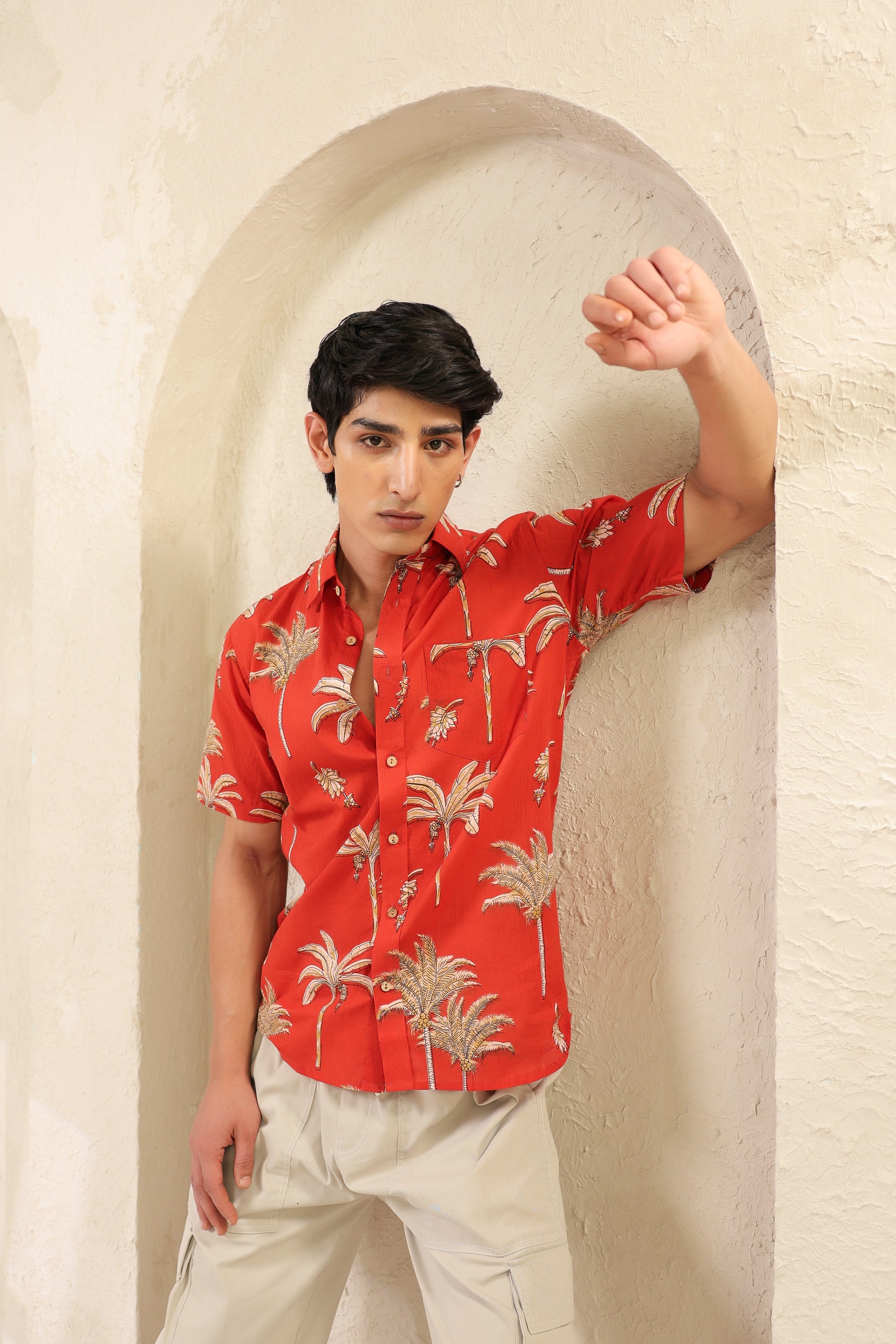The rust orange here is more than colour. It brings to mind ripe fruit and late summer skies. The banana plant motifs are playful but precise, drawn in a way that feels both nostalgic and fresh. The fabric is soft pure cotton and every stitch is placed by hand with quiet care. There’s rhythm in the print, warmth in the tones. Just like the man who chooses to wear it.