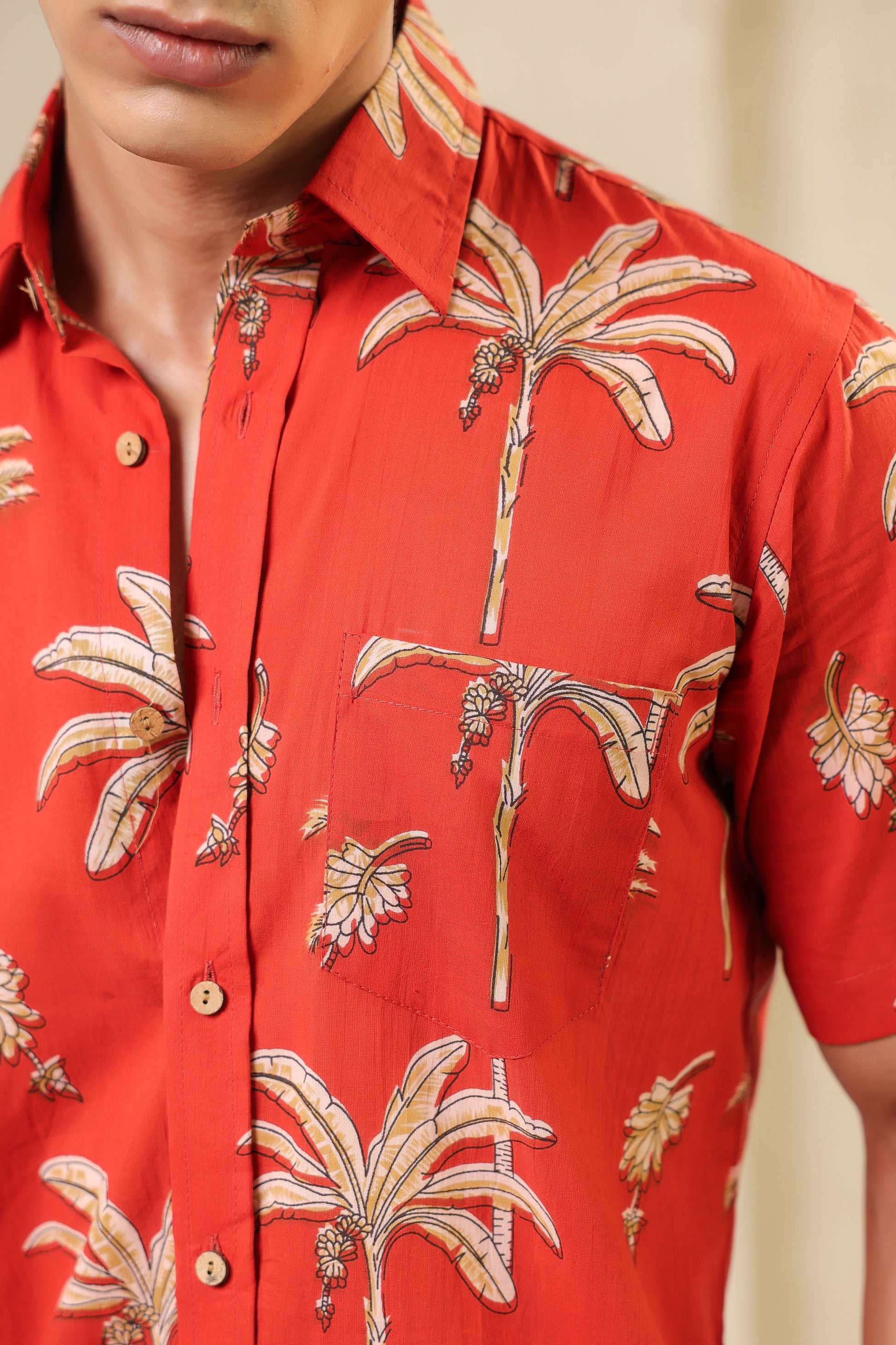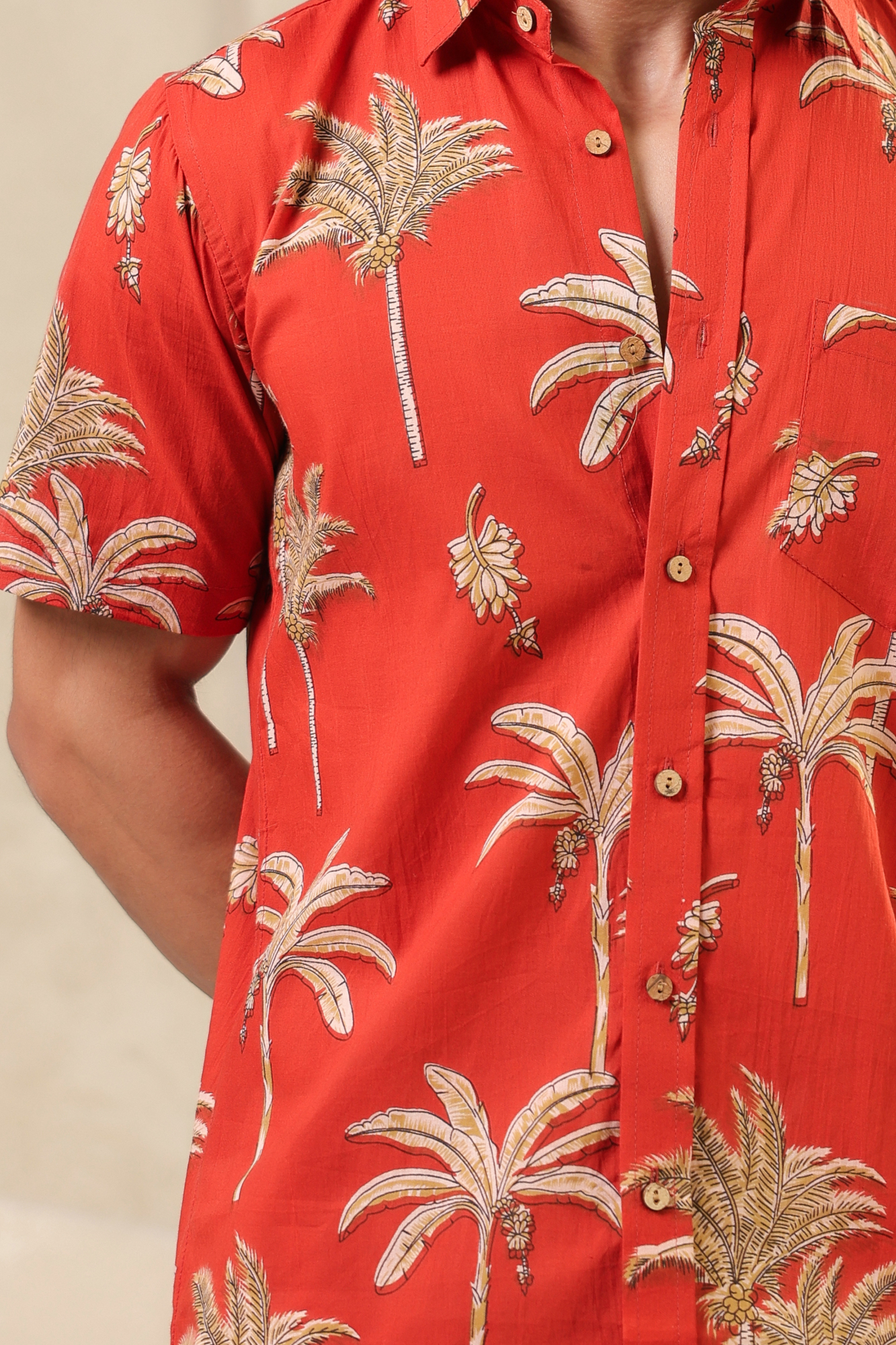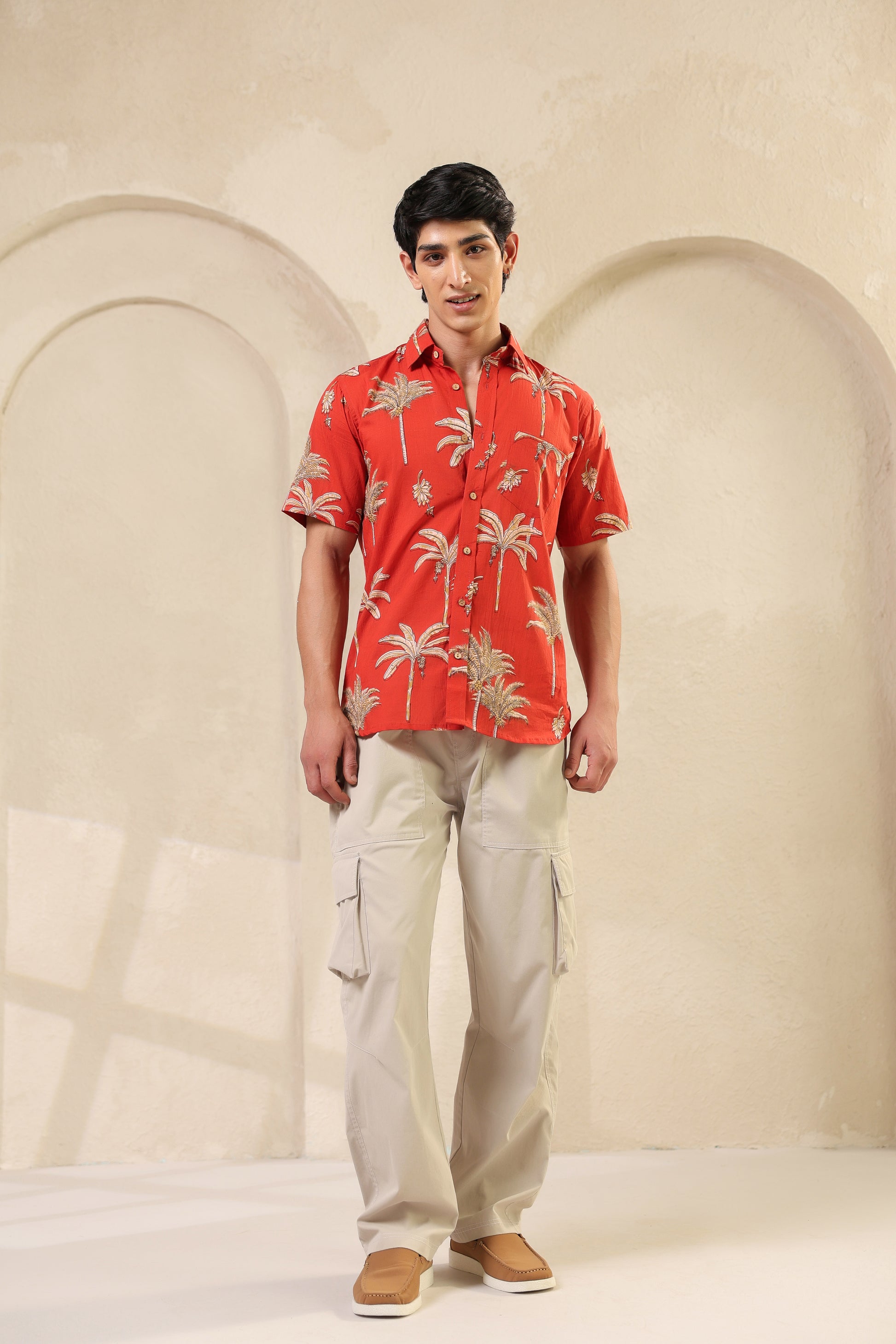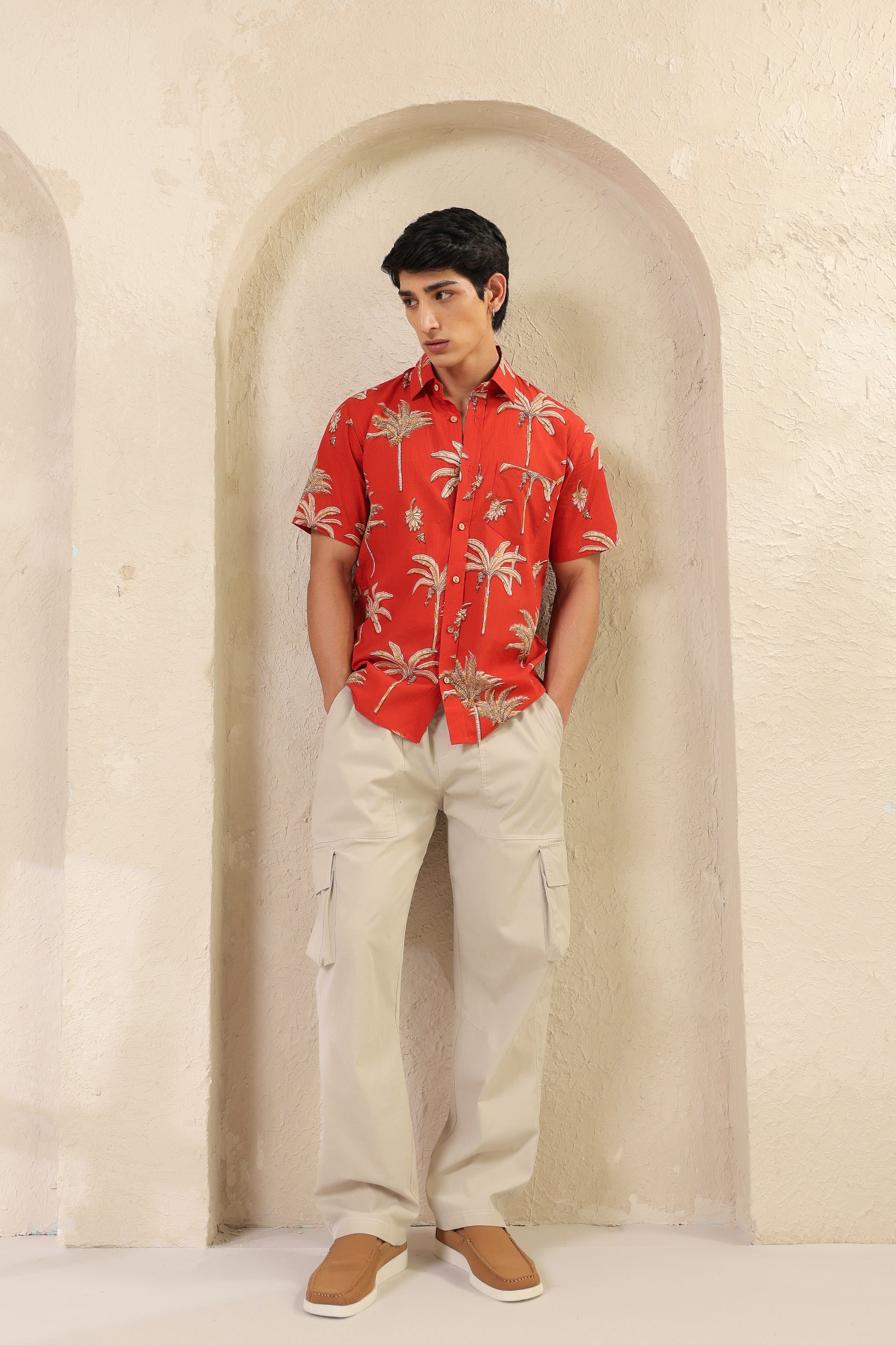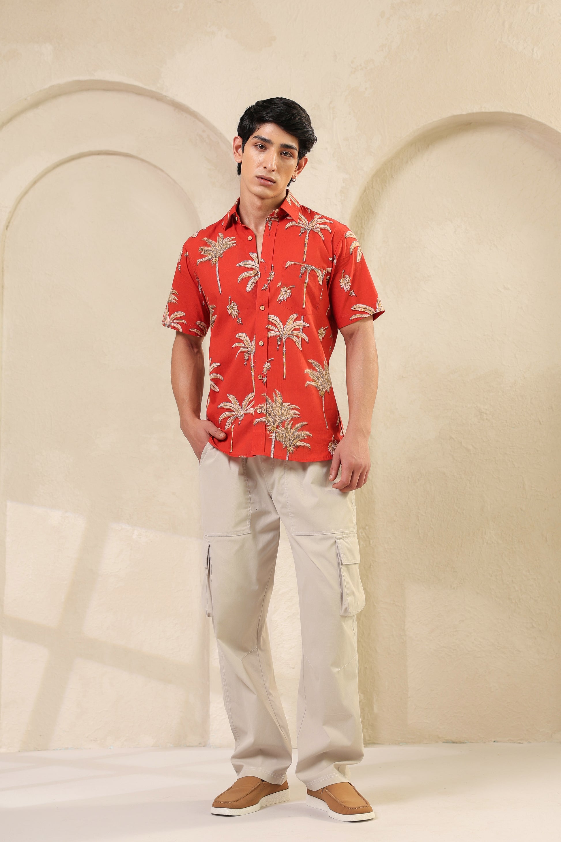 The rust orange here is more than colour. It brings to mind ripe fruit and late summer skies. The banana plant motifs are playful but precise, drawn in a way that feels both nostalgic and fresh. The fabric is soft pure cotton and every stitch is placed by hand with quiet care. There’s rhythm in the print, warmth in the tones. Just like the man who chooses to wear it.