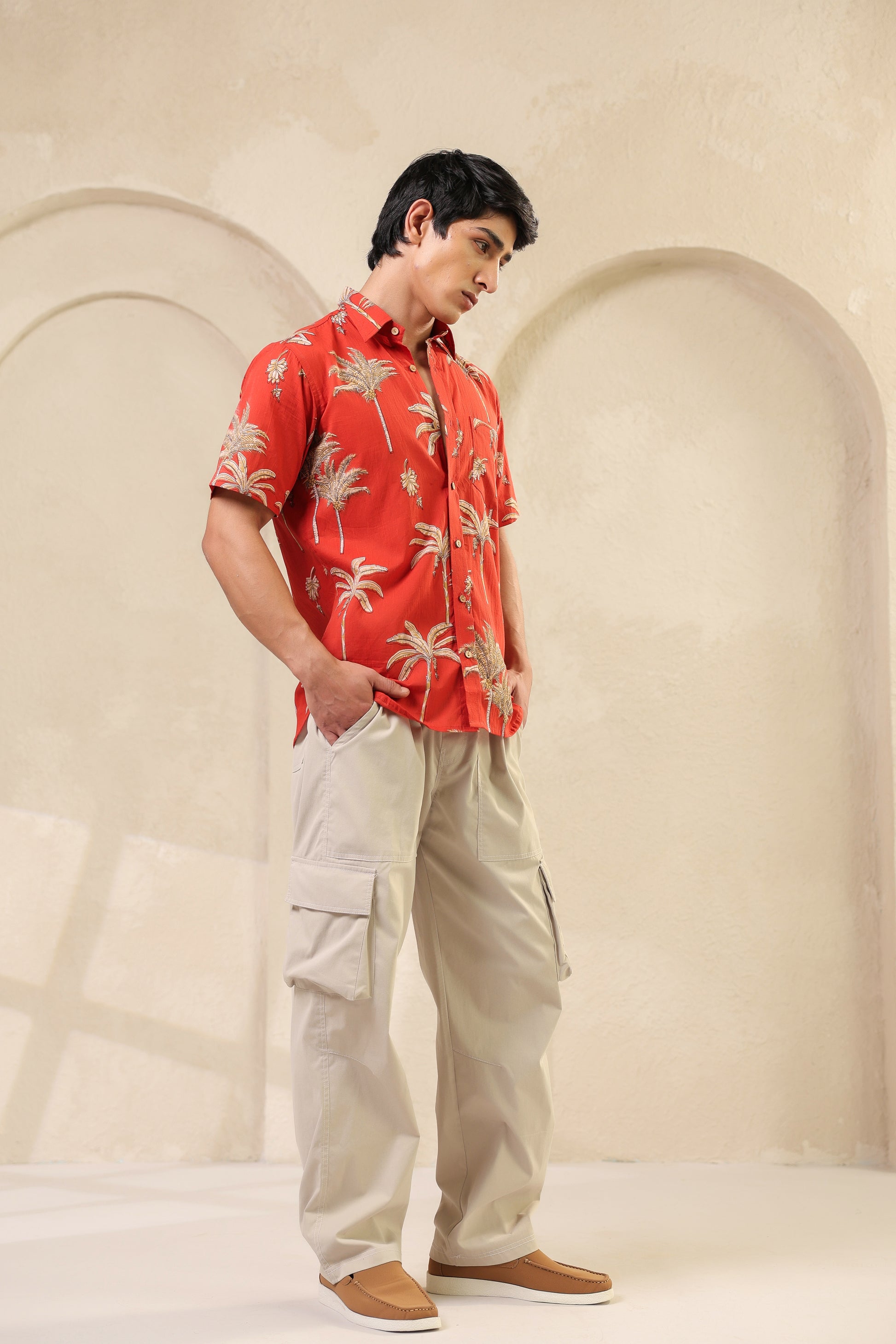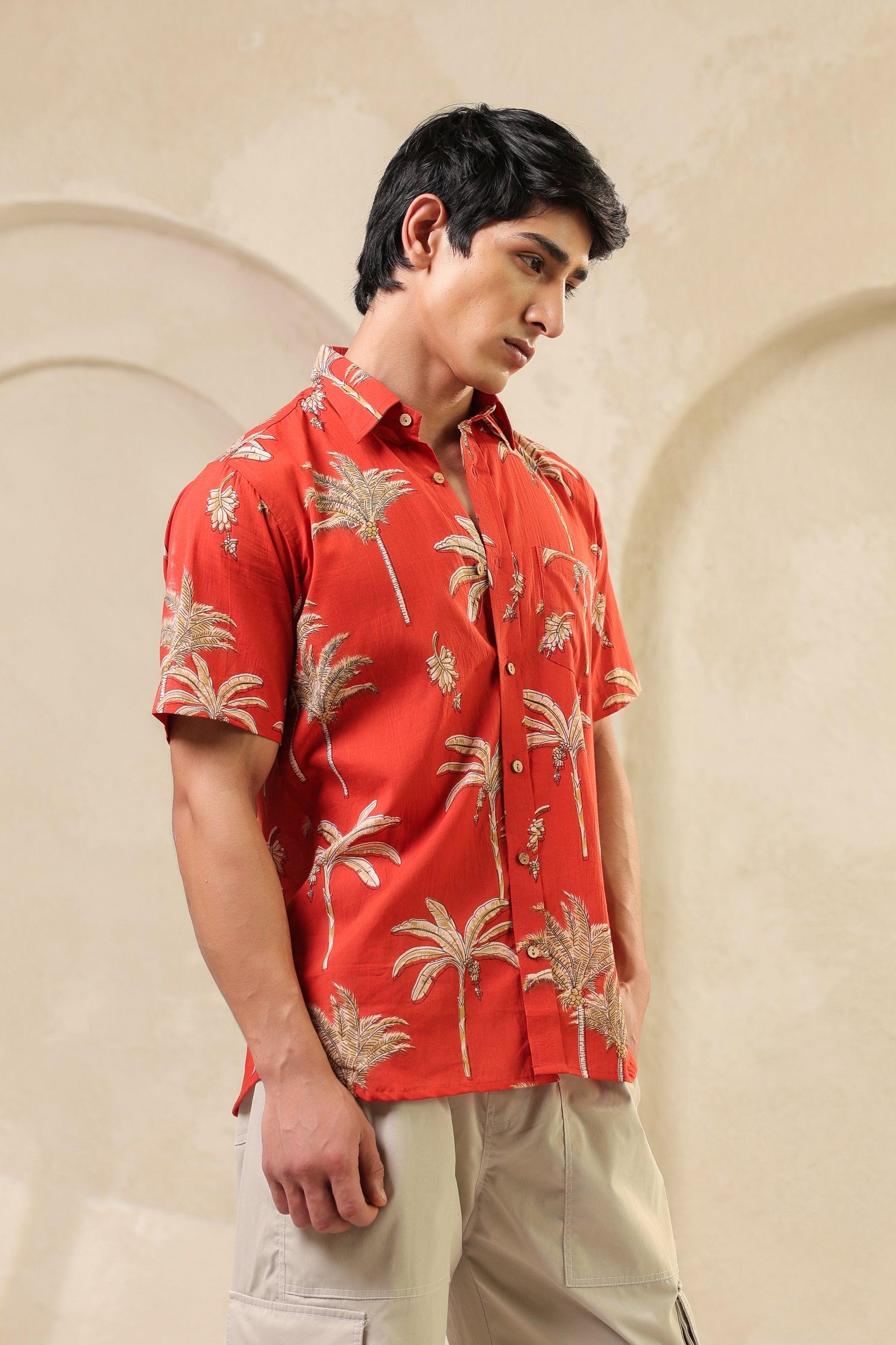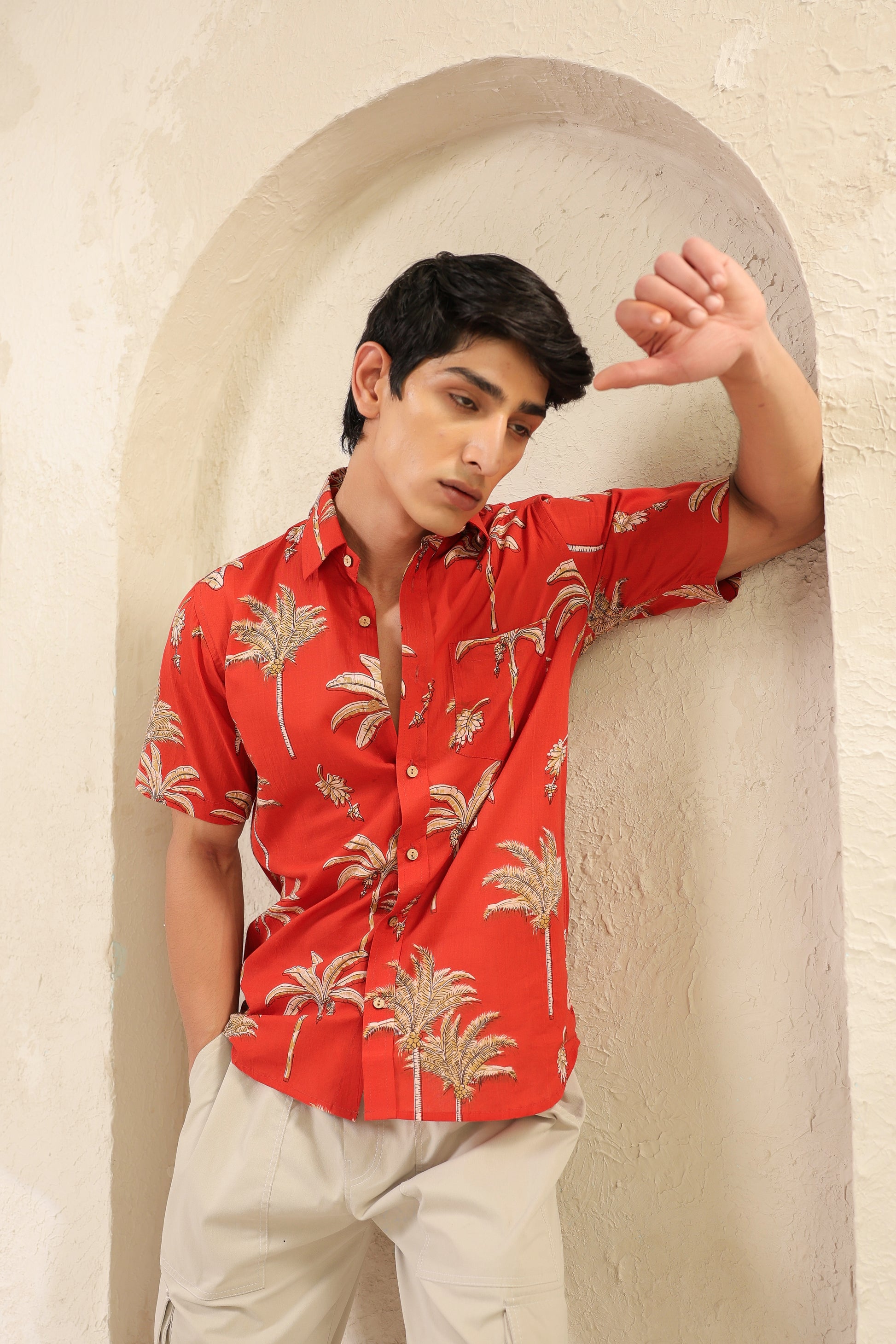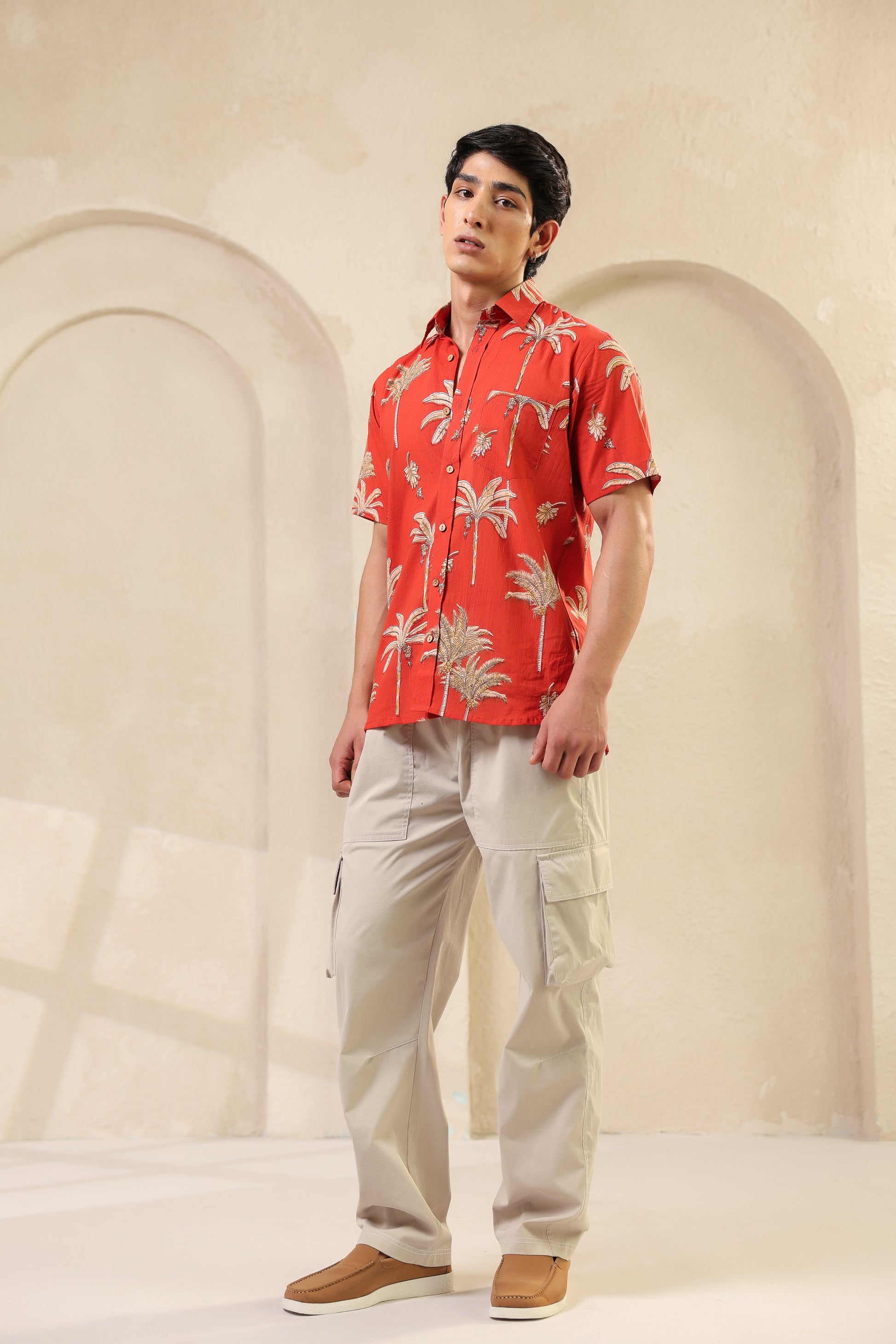The rust orange here is more than colour. It brings to mind ripe fruit and late summer skies. The banana plant motifs are playful but precise, drawn in a way that feels both nostalgic and fresh. The fabric is soft pure cotton and every stitch is placed by hand with quiet care. There’s rhythm in the print, warmth in the tones. Just like the man who chooses to wear it.