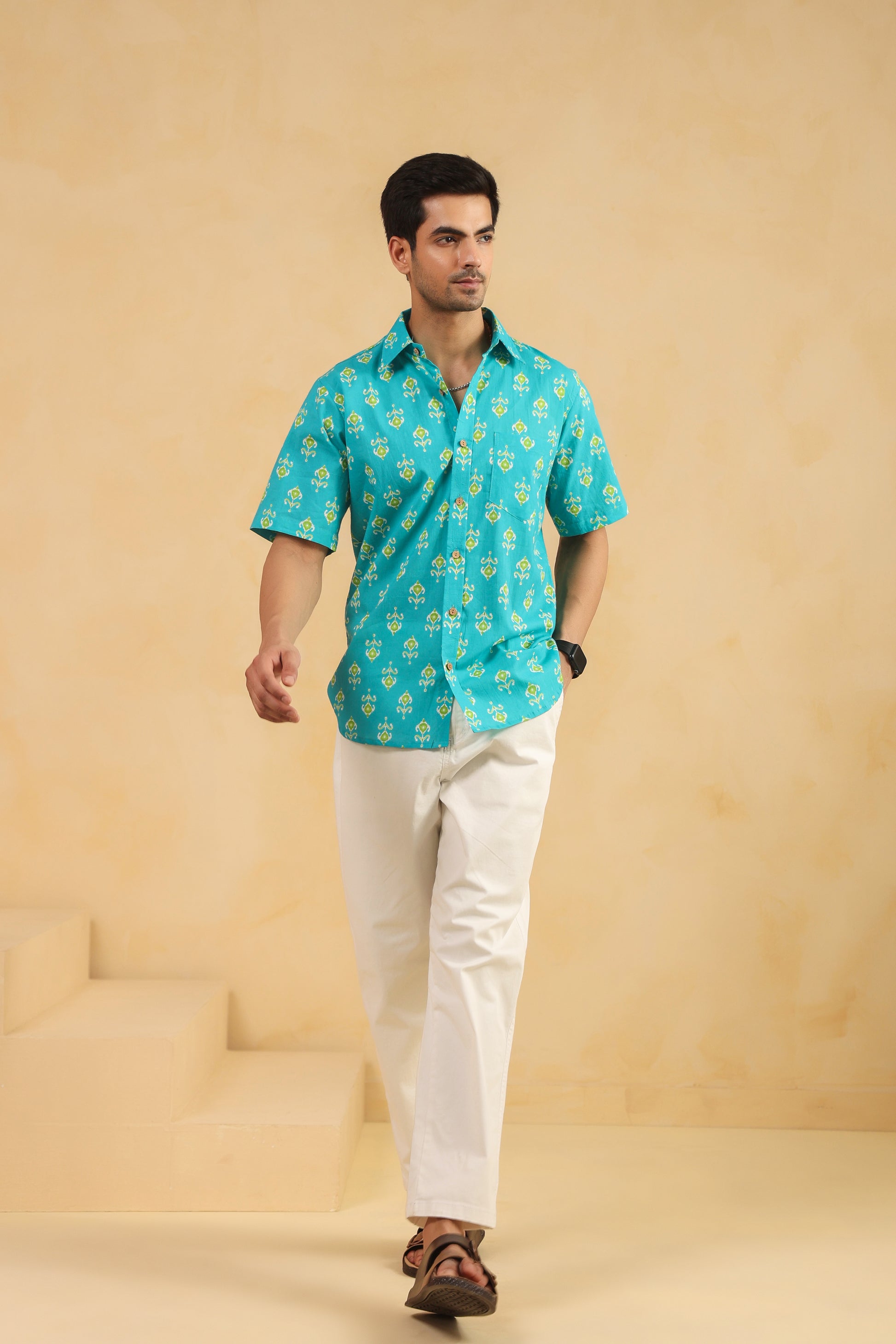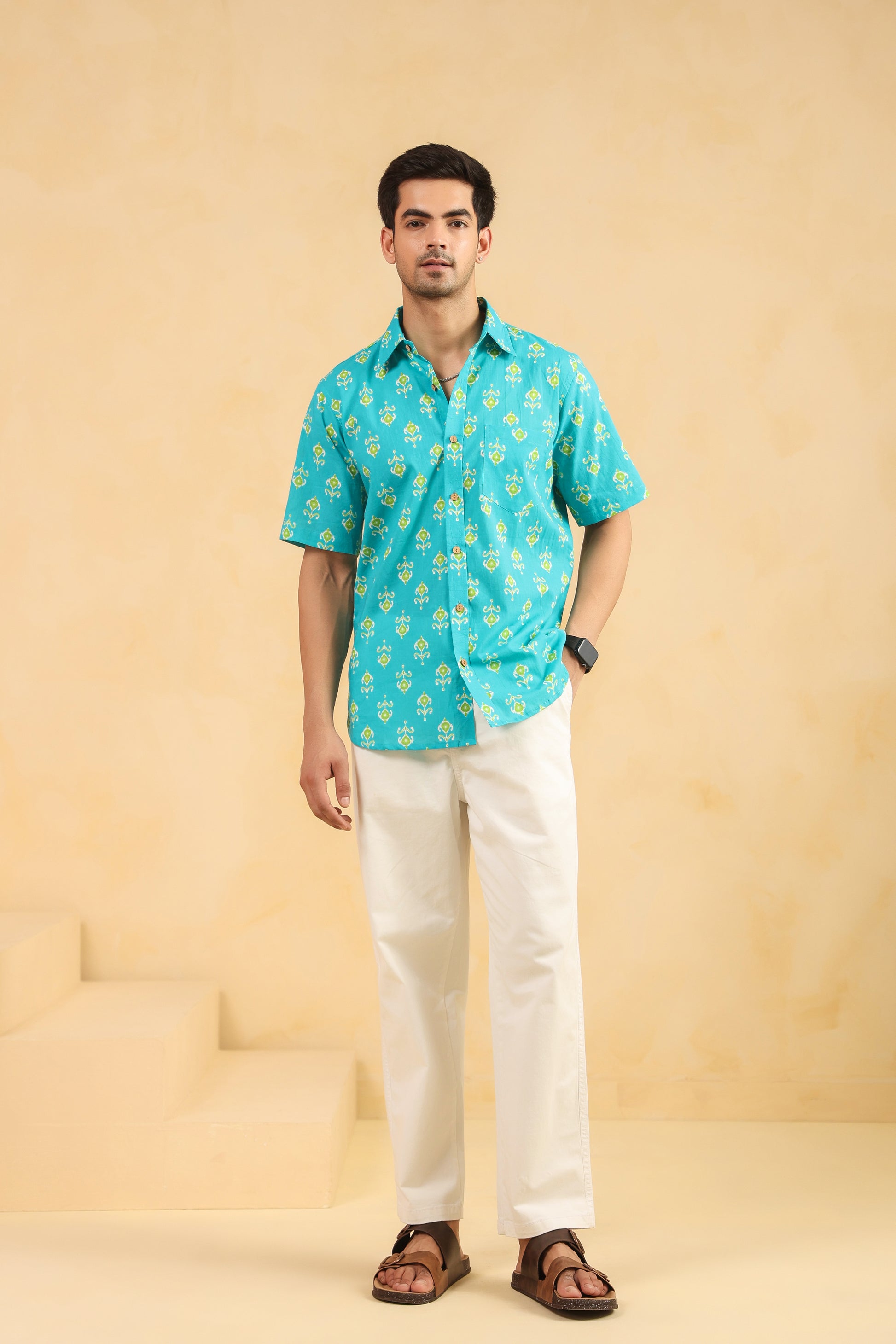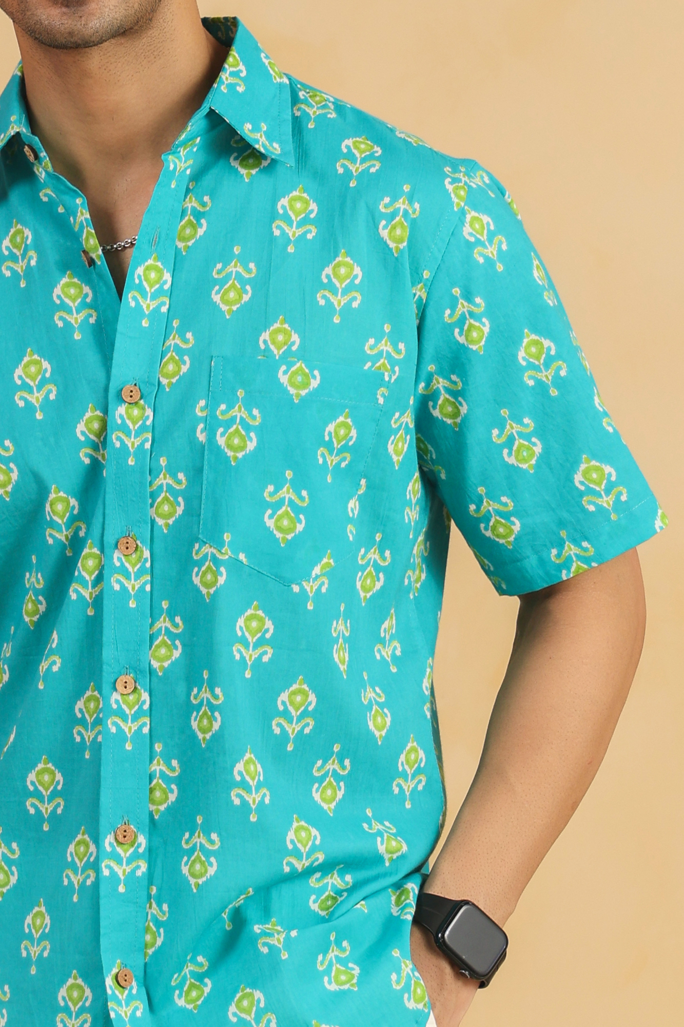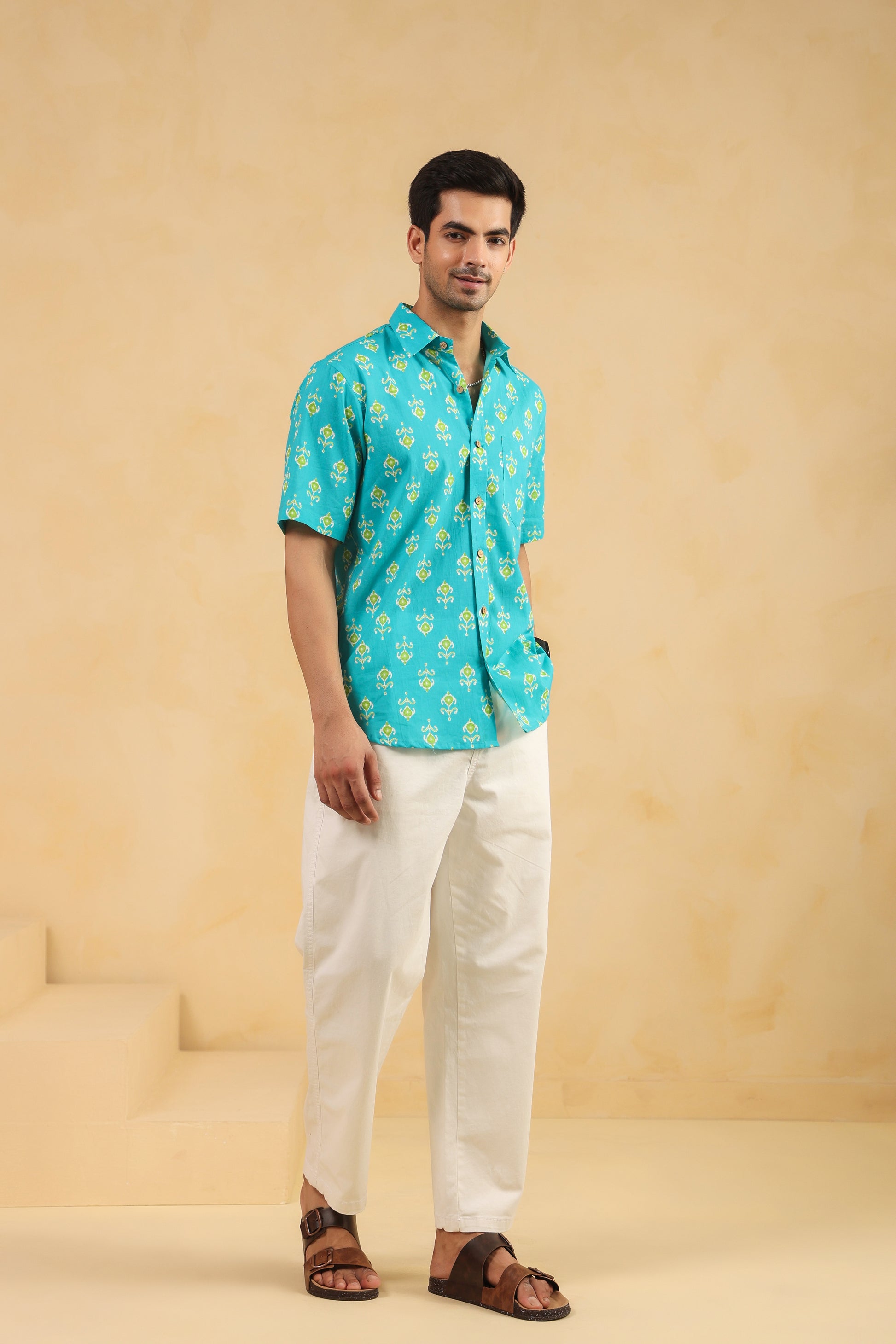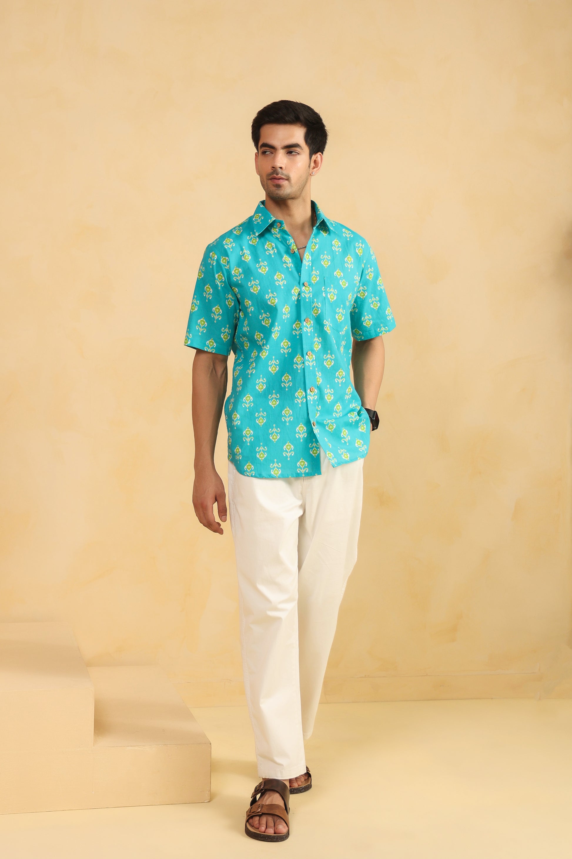 The turquoise cotton feels like a breath of fresh air. Hand-printed with green floral motifs, the pattern flows like ripples across still water. Each stitch is done by hand, subtle yet intentional, adding quiet depth to the piece. Made for the man who values ease and detail.