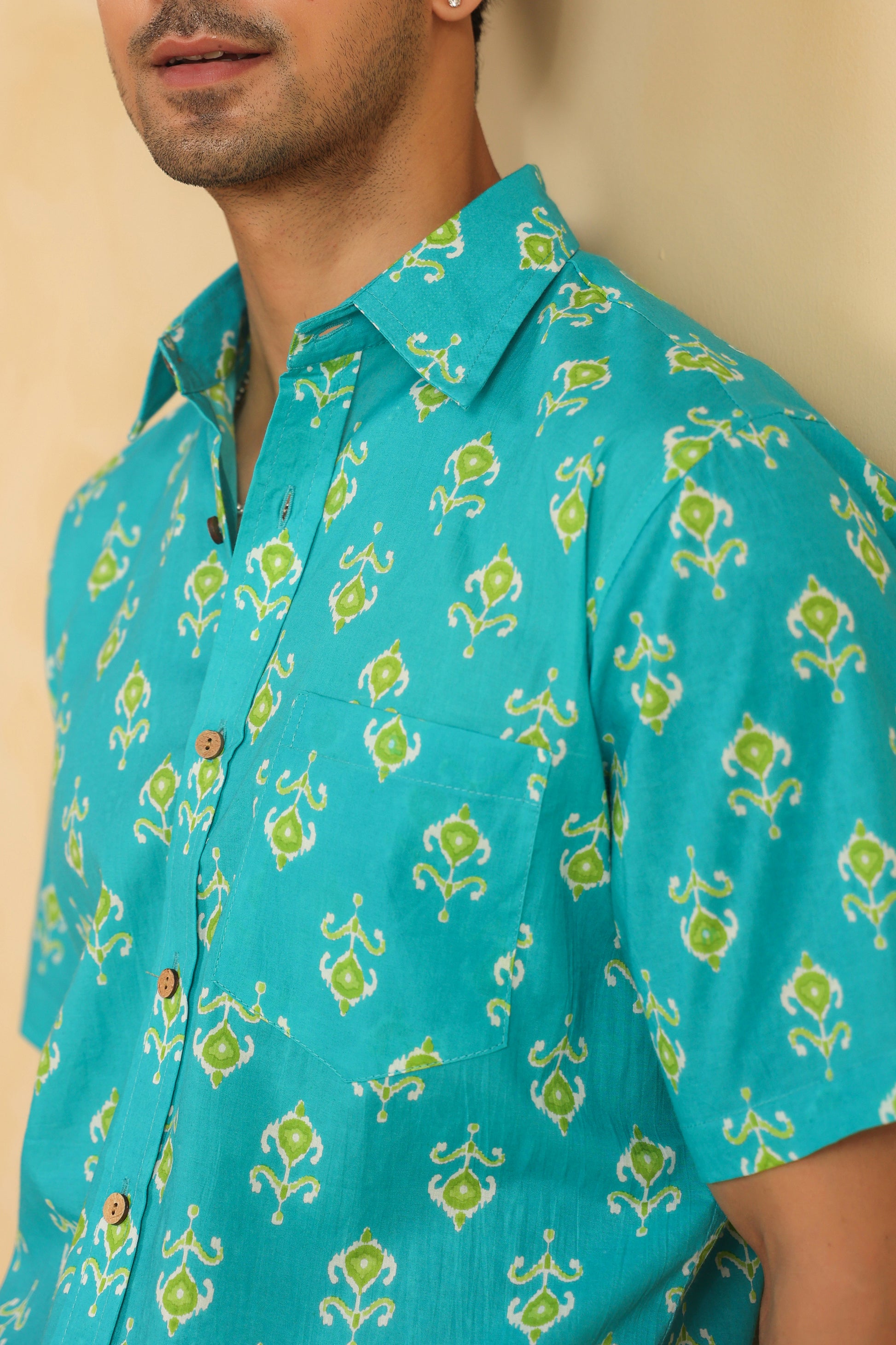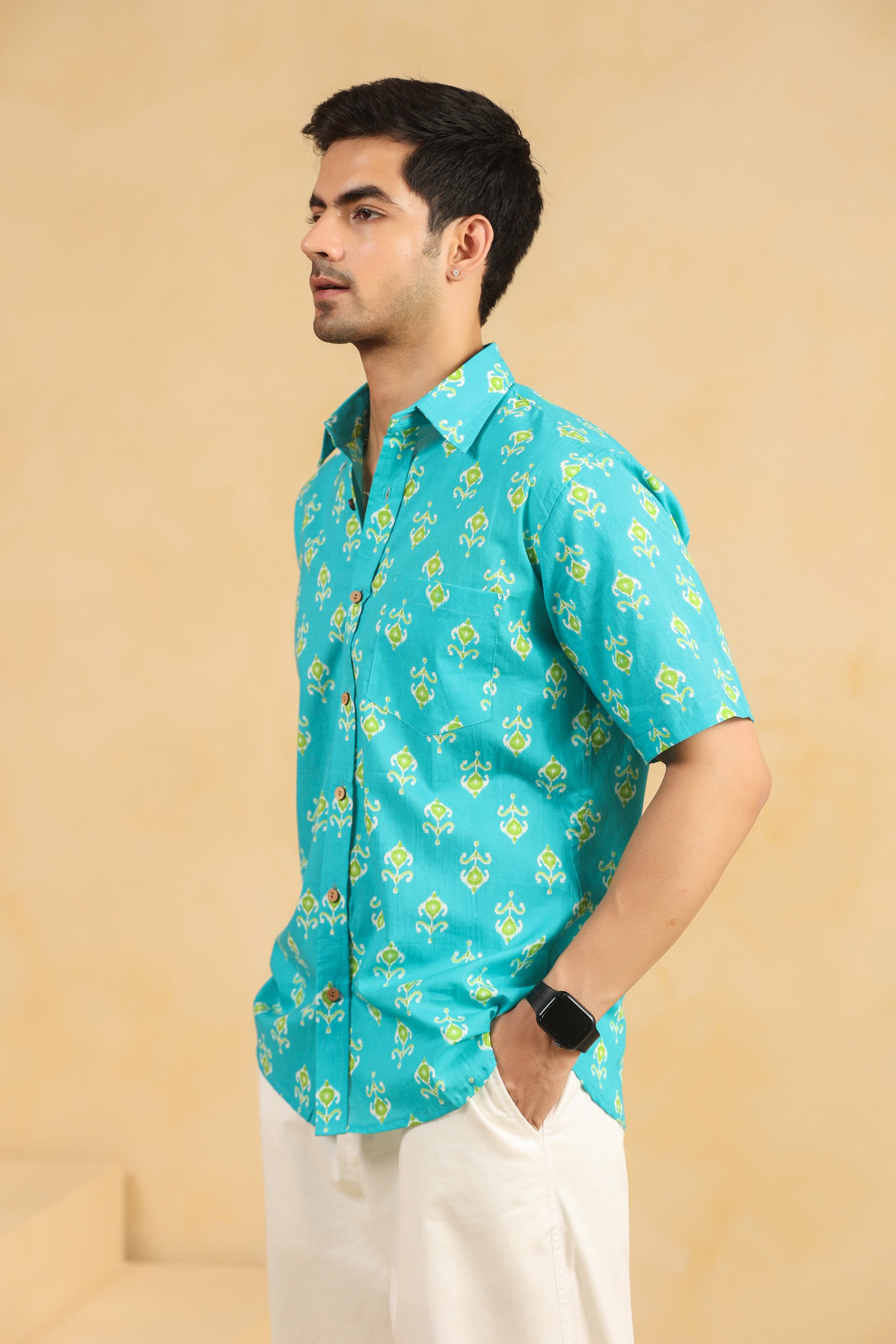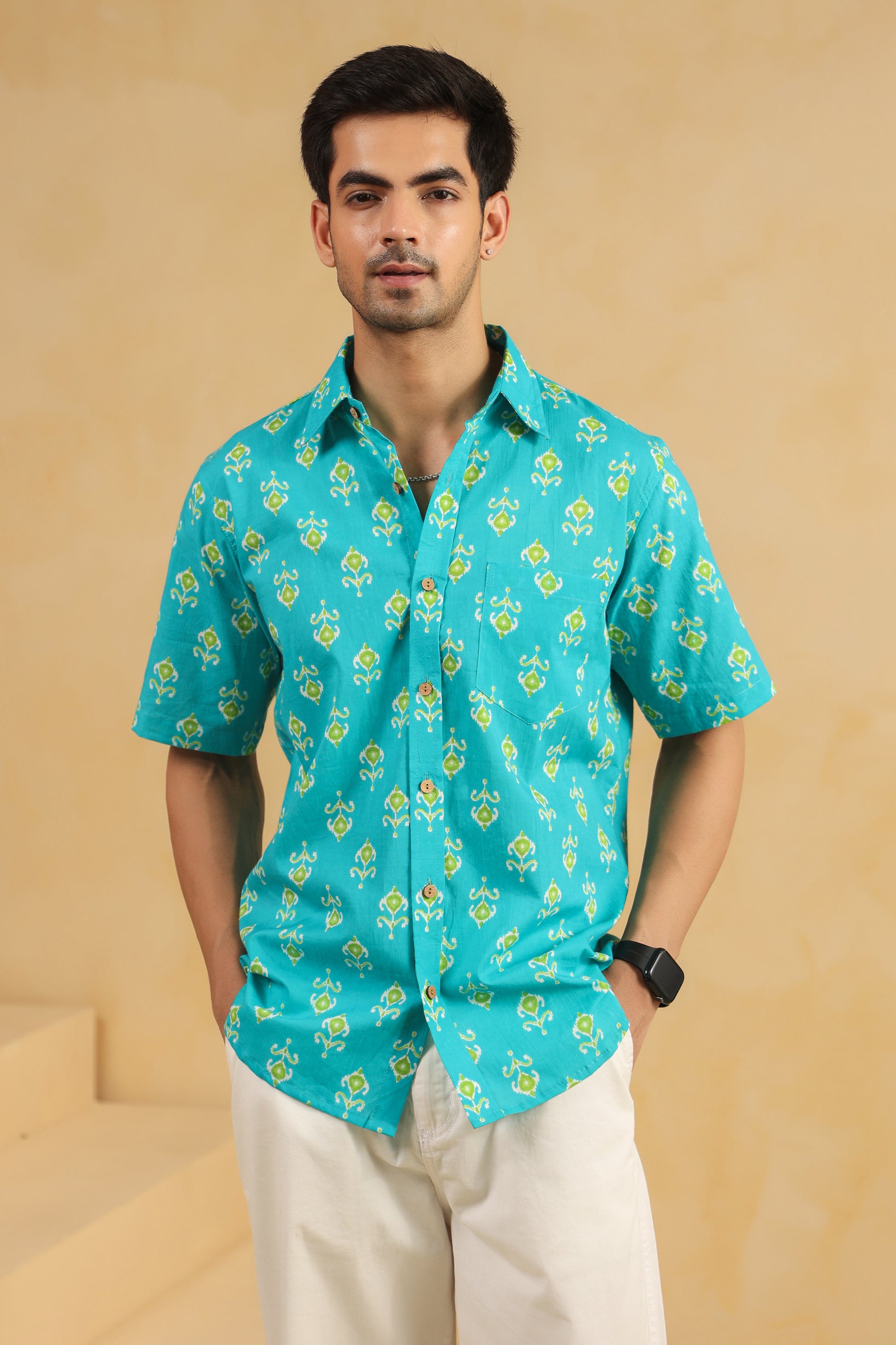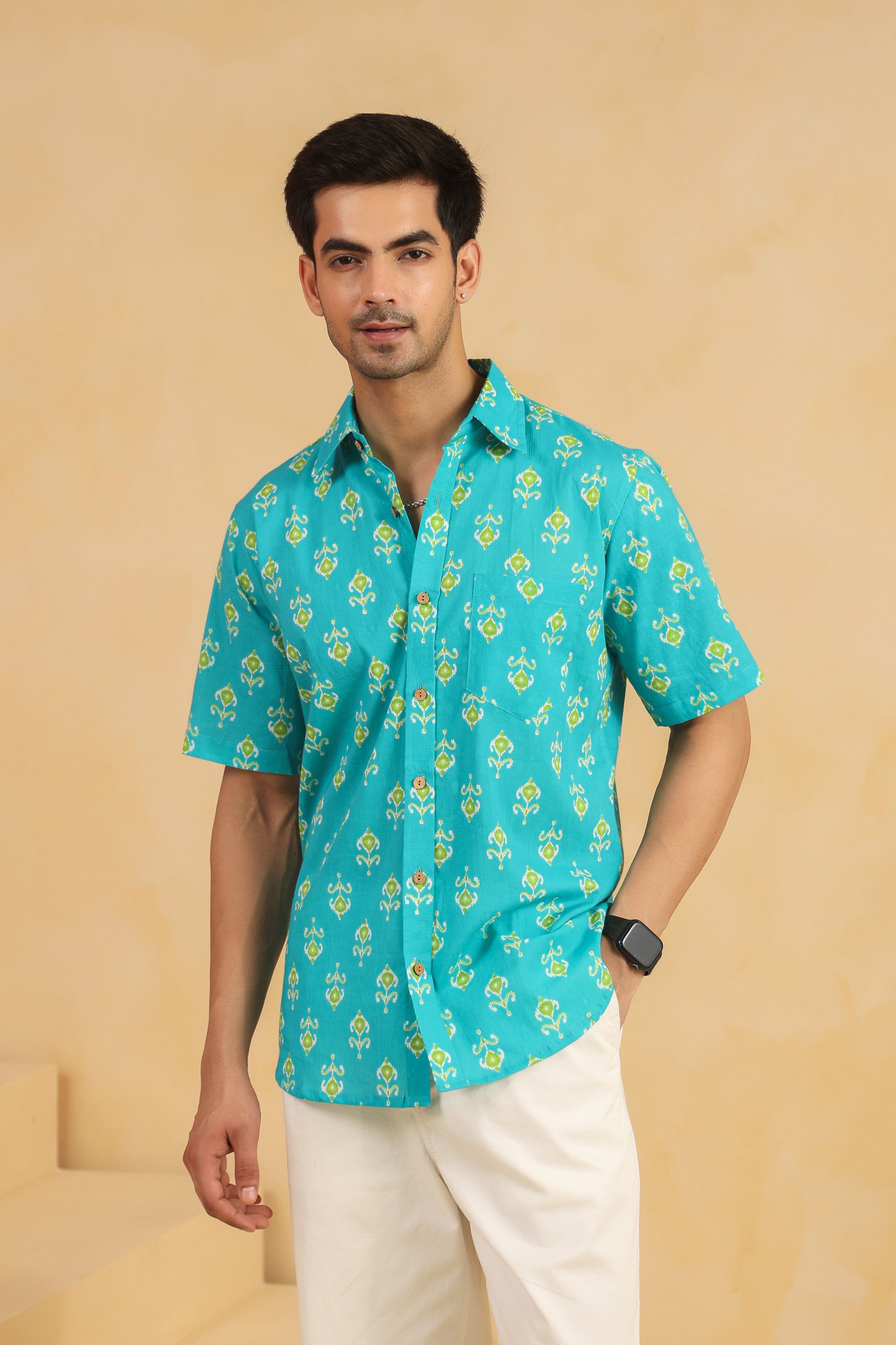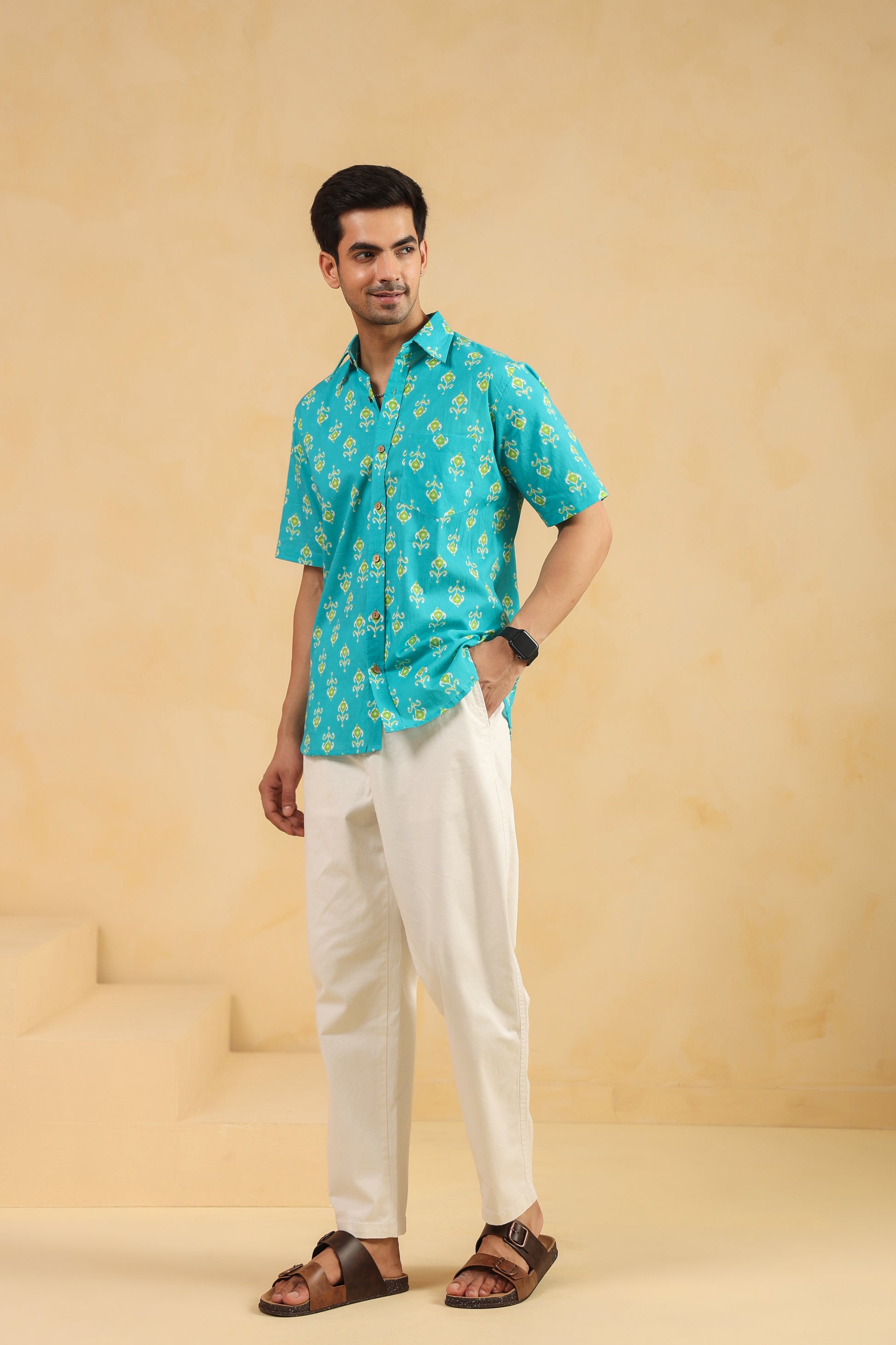 The turquoise cotton feels like a breath of fresh air. Hand-printed with green floral motifs, the pattern flows like ripples across still water. Each stitch is done by hand, subtle yet intentional, adding quiet depth to the piece. Made for the man who values ease and detail.