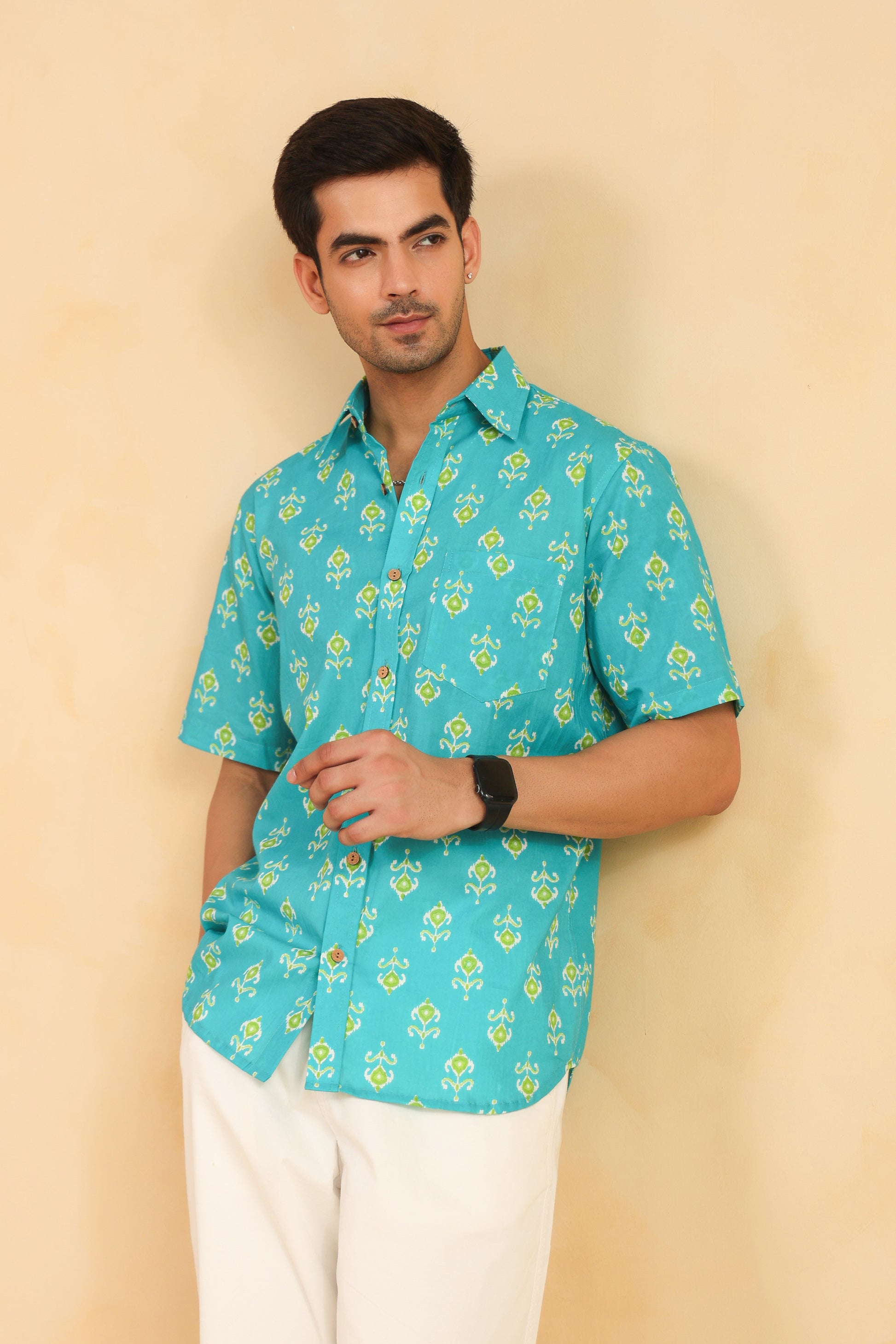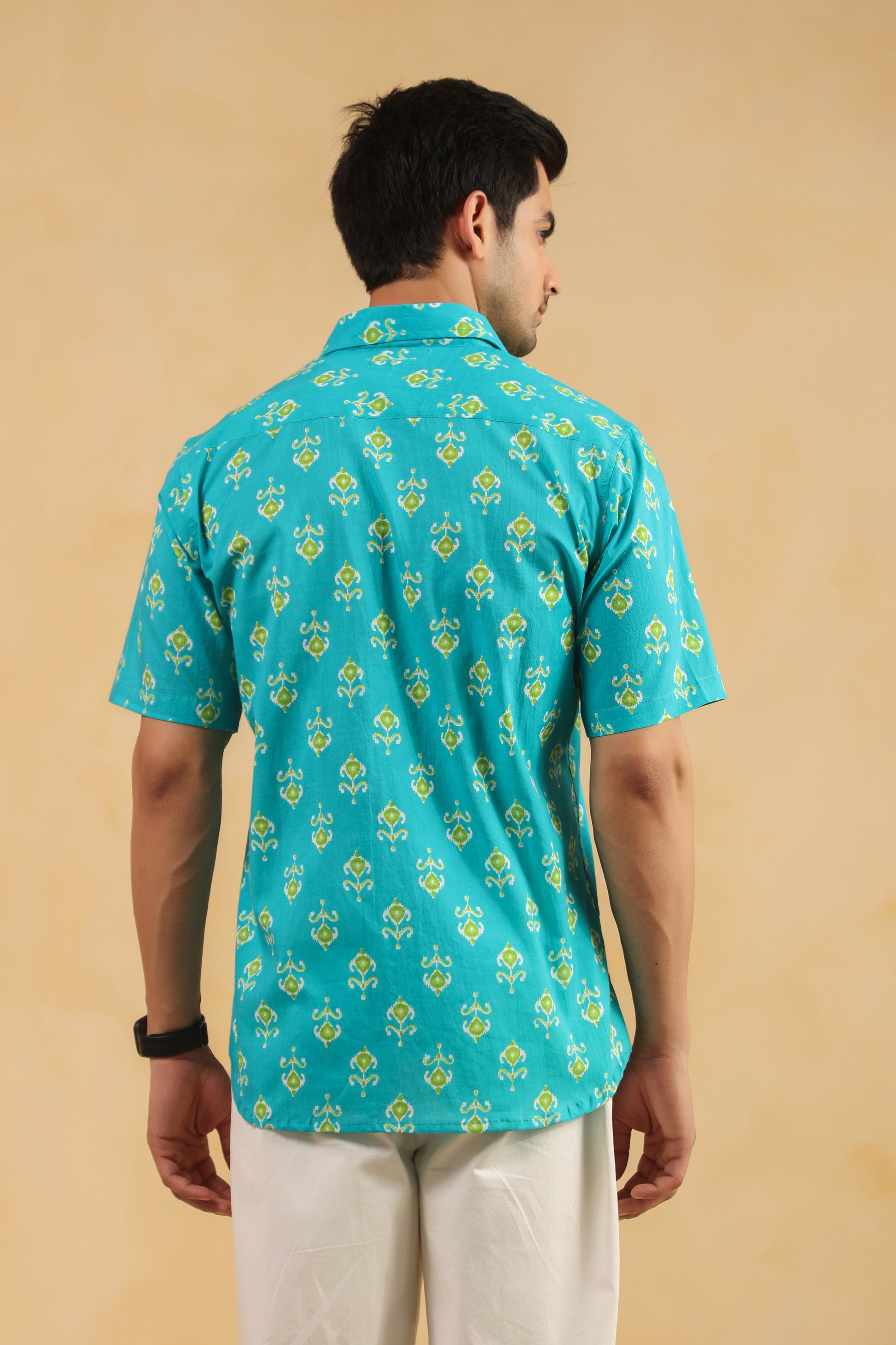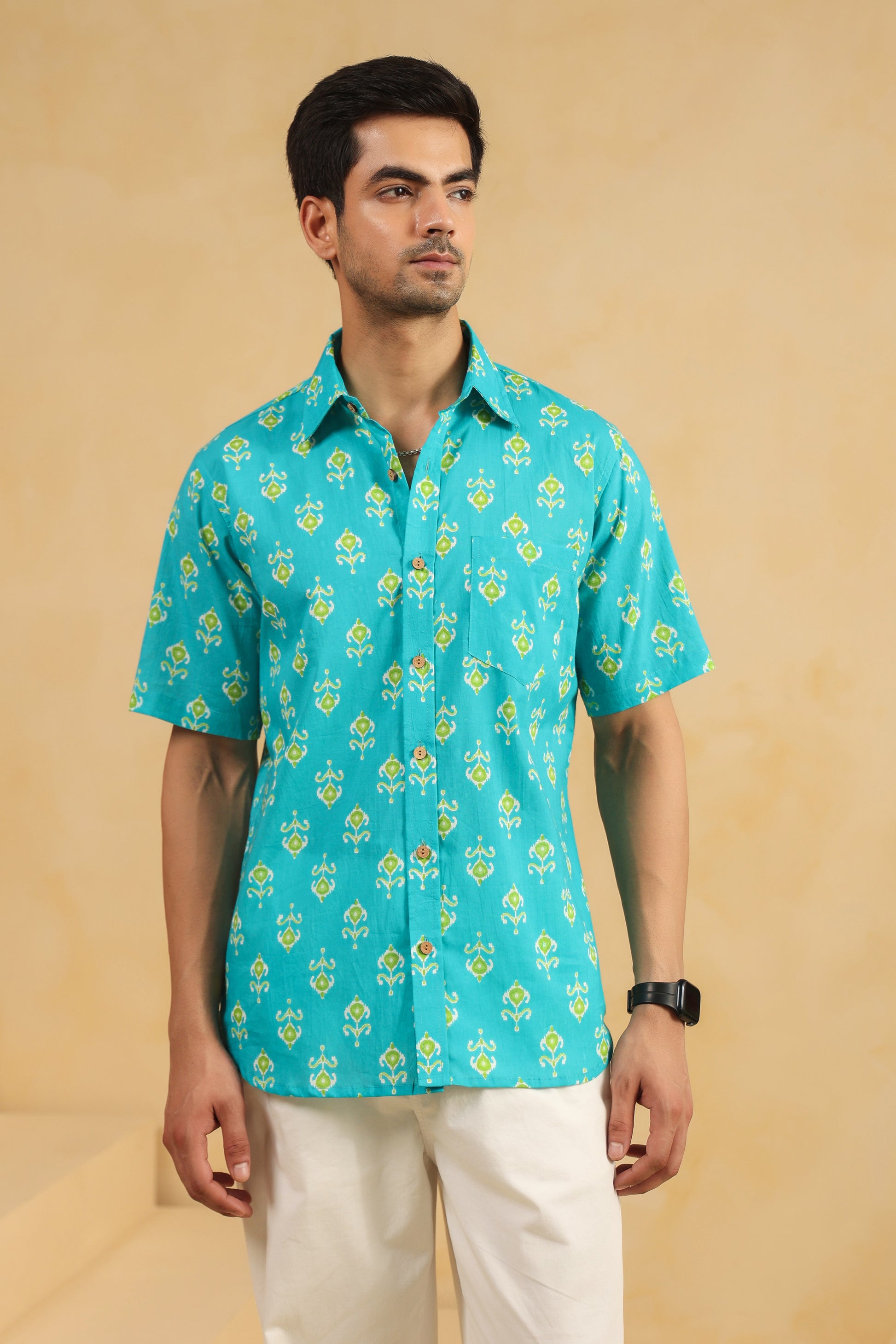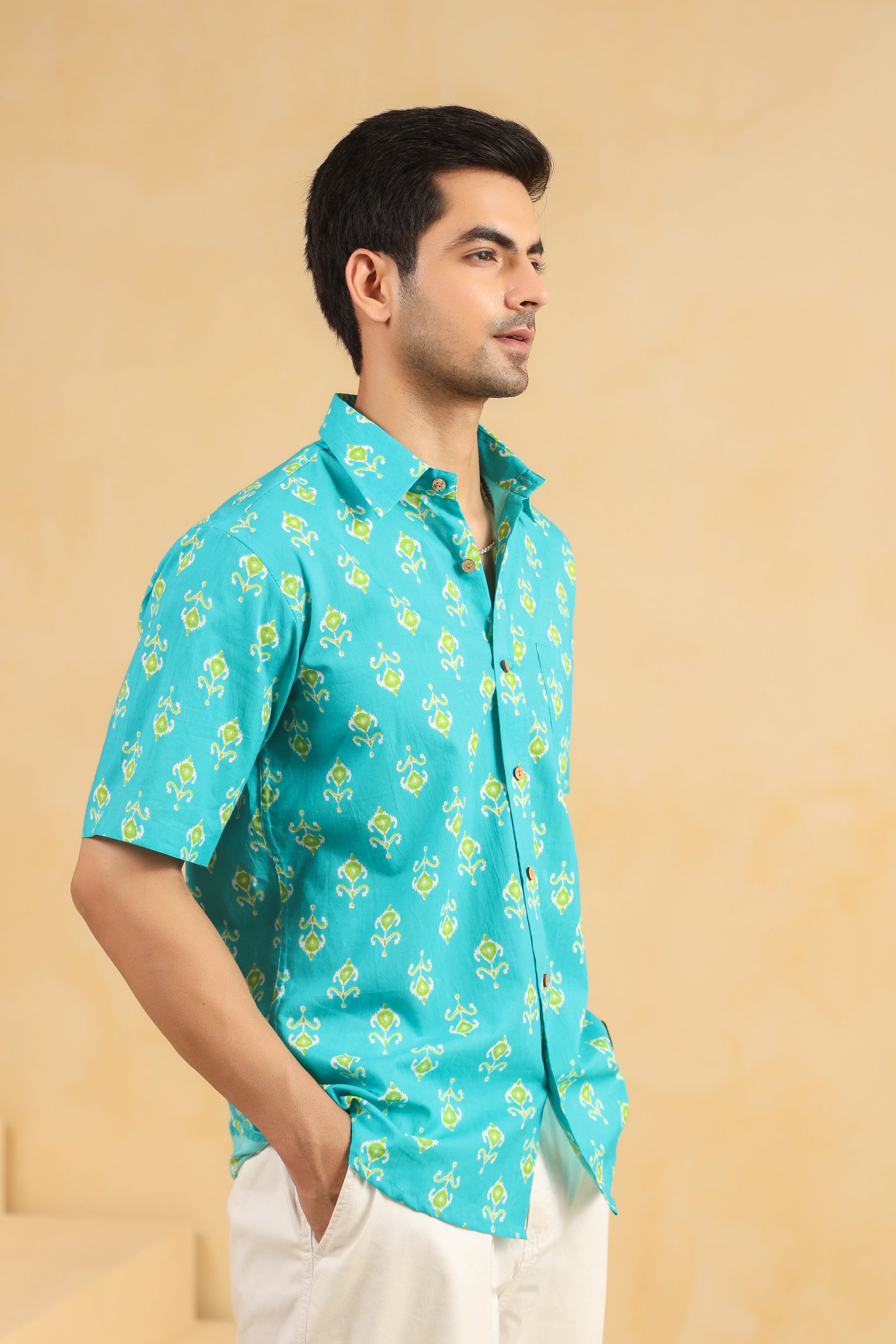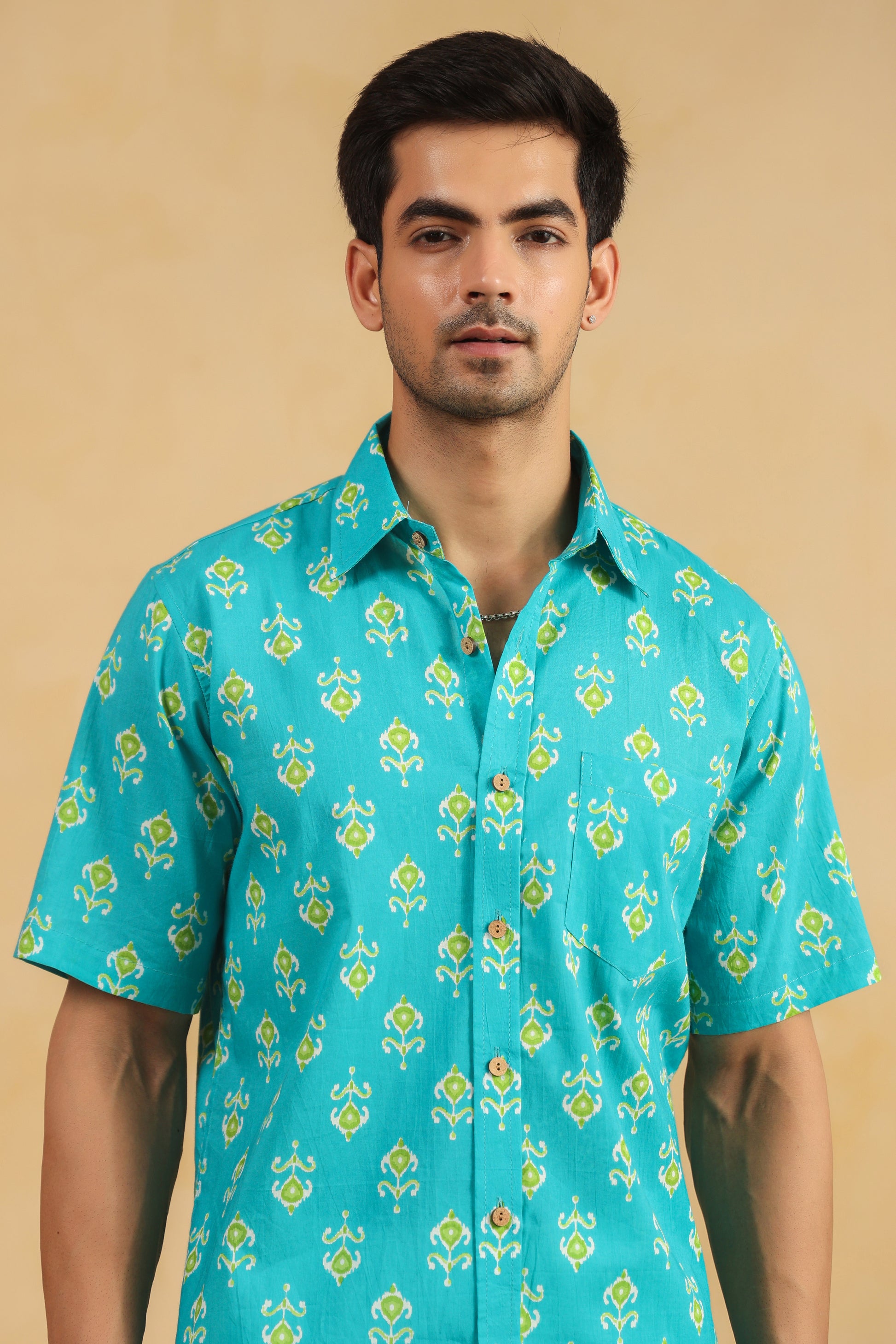 The turquoise cotton feels like a breath of fresh air. Hand-printed with green floral motifs, the pattern flows like ripples across still water. Each stitch is done by hand, subtle yet intentional, adding quiet depth to the piece. Made for the man who values ease and detail.