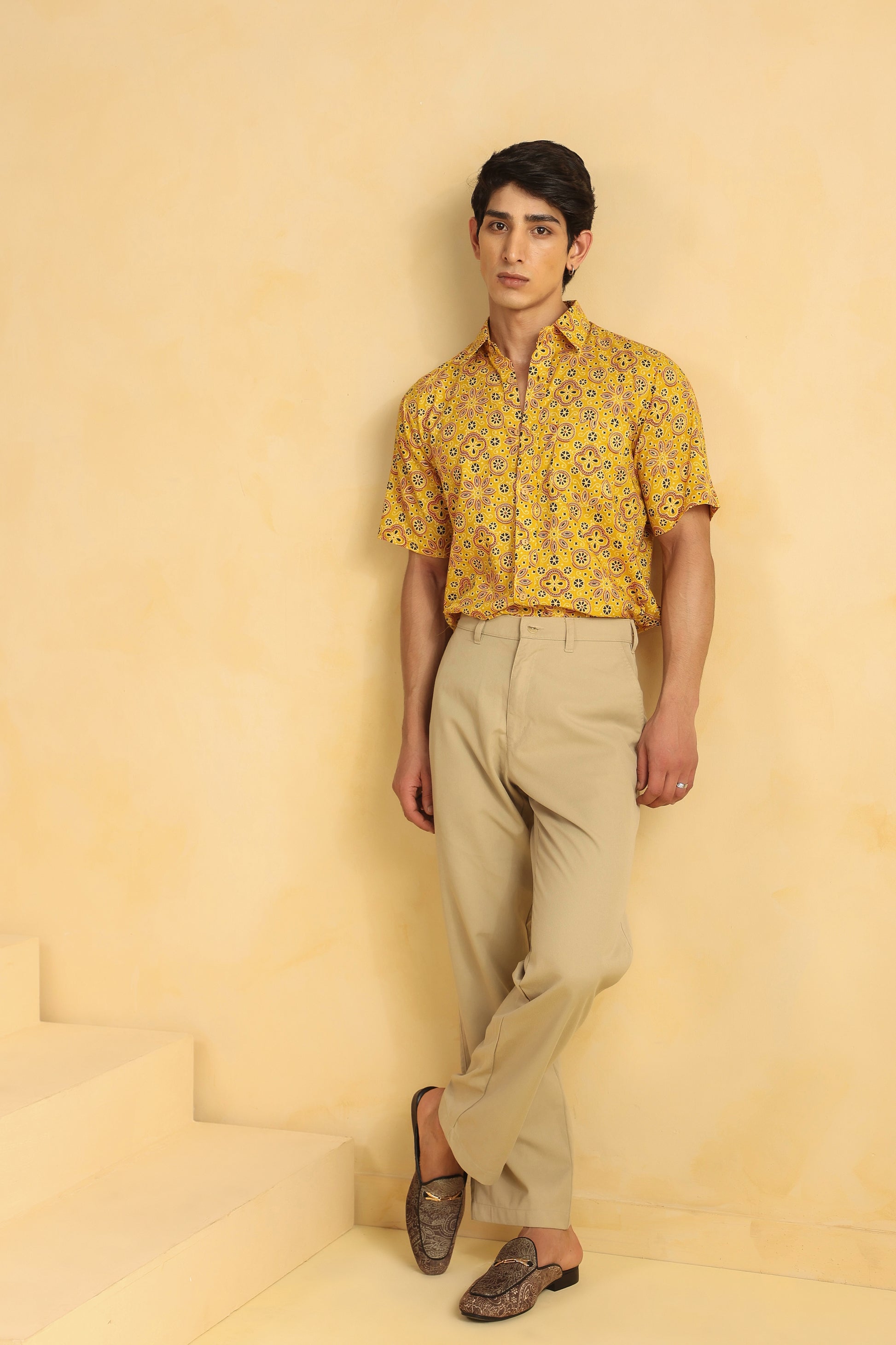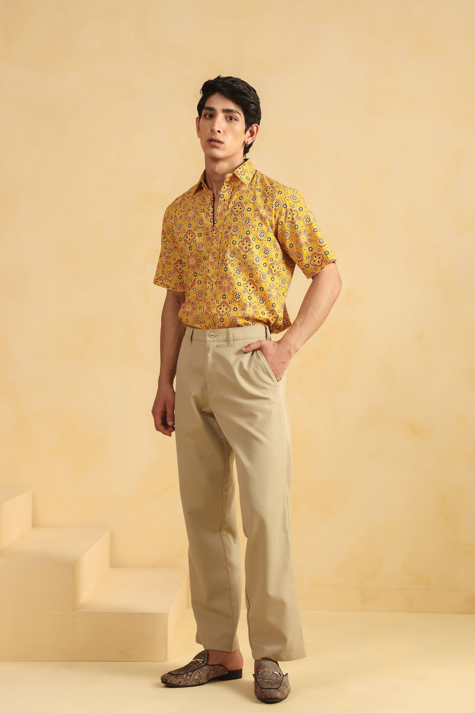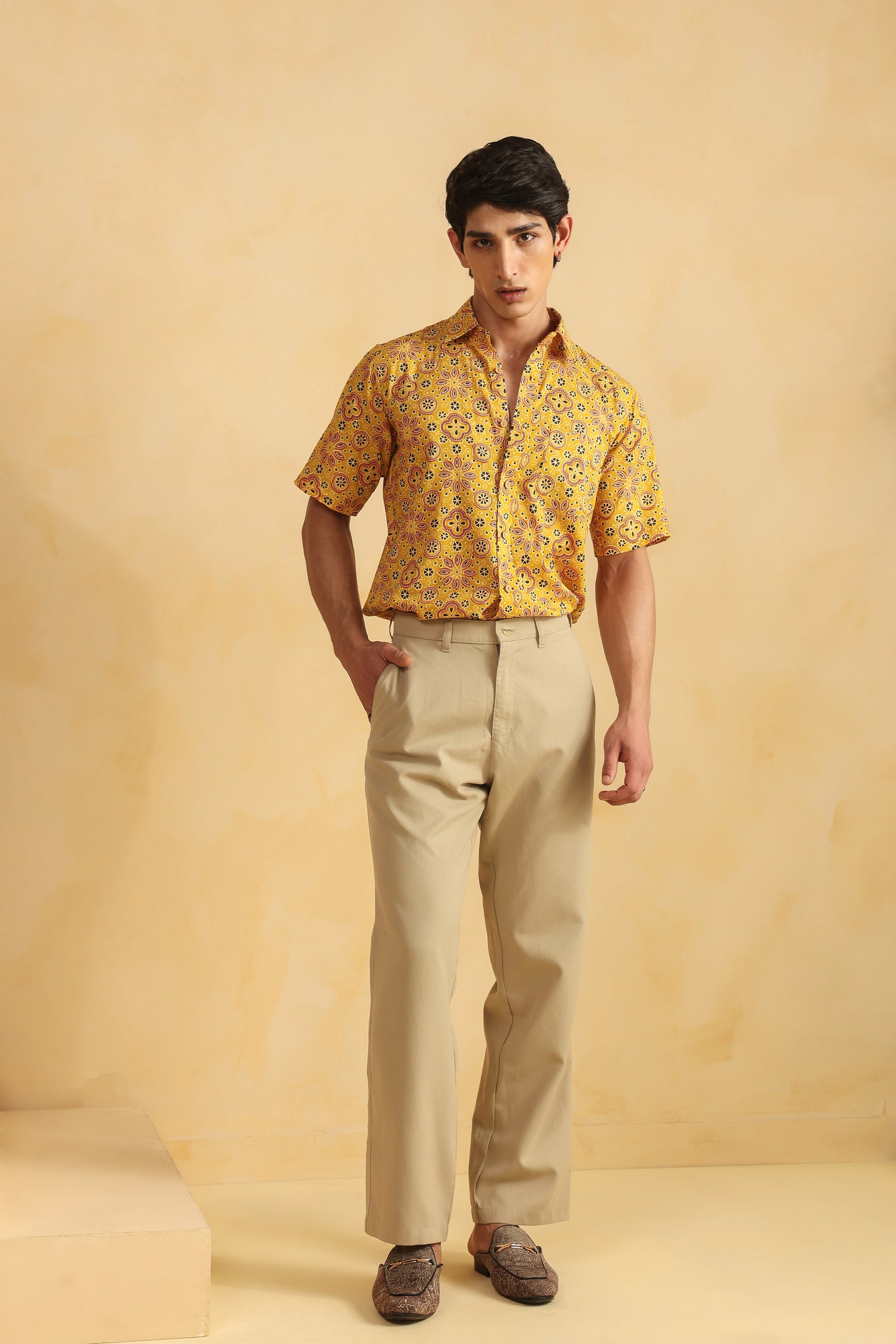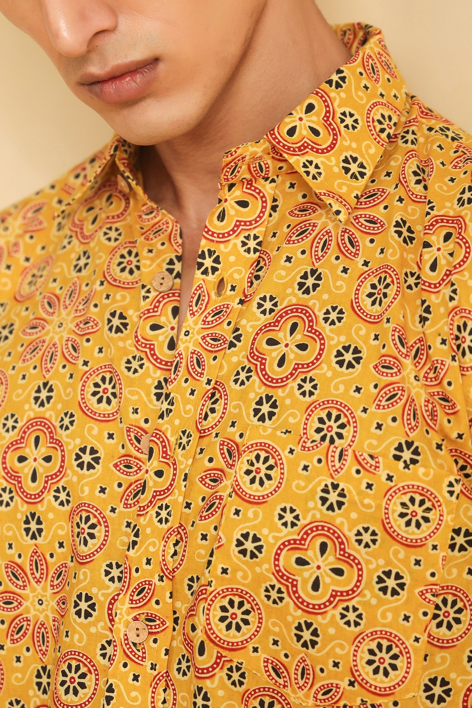 The mustard yellow isn’t just a colour. It carries the warmth of the sun and the richness of soil. The prints are drawn from Ajrakh traditions, crafted to feel timeless yet made for today. There’s harmony in the pattern, detailed but not loud, expressive yet calm. Just like the man who chooses to wear it.