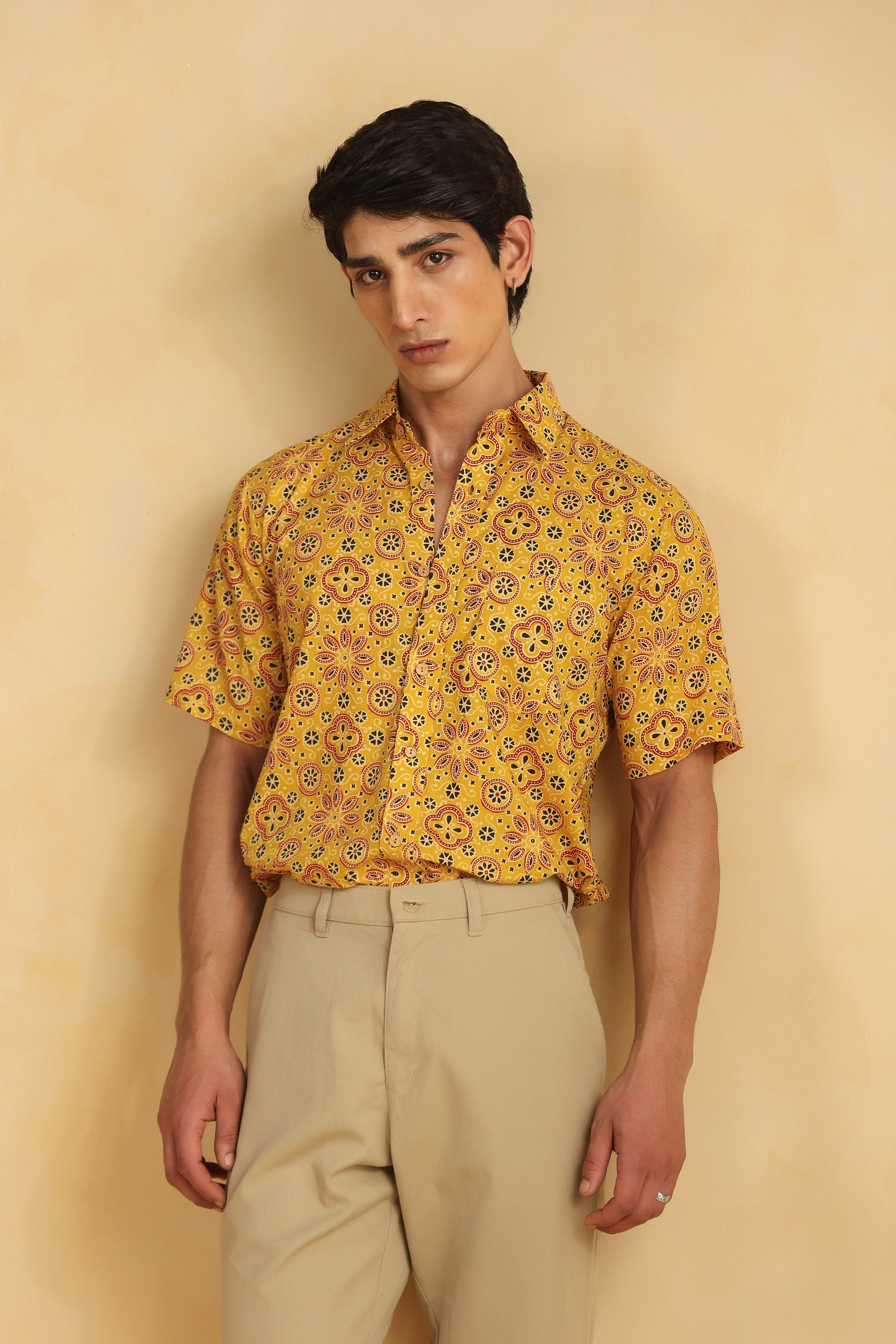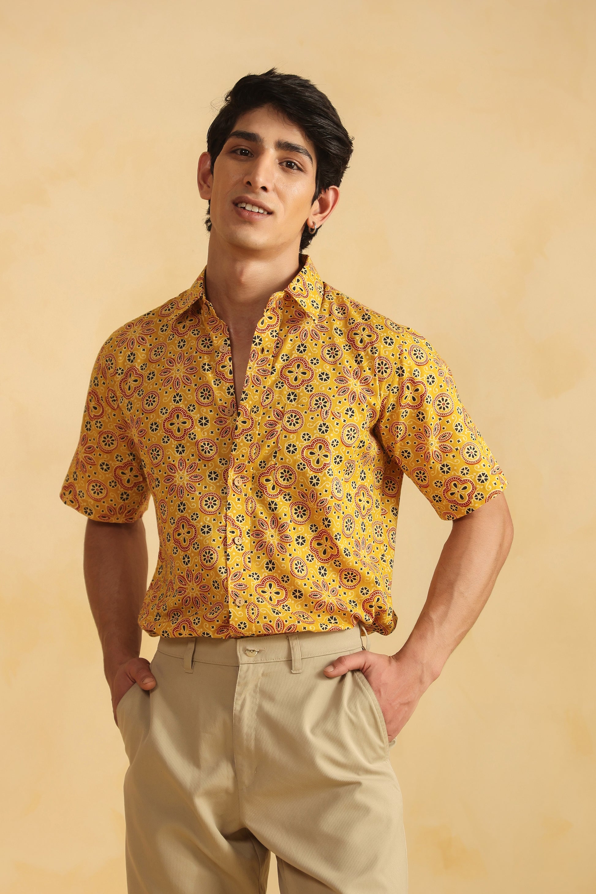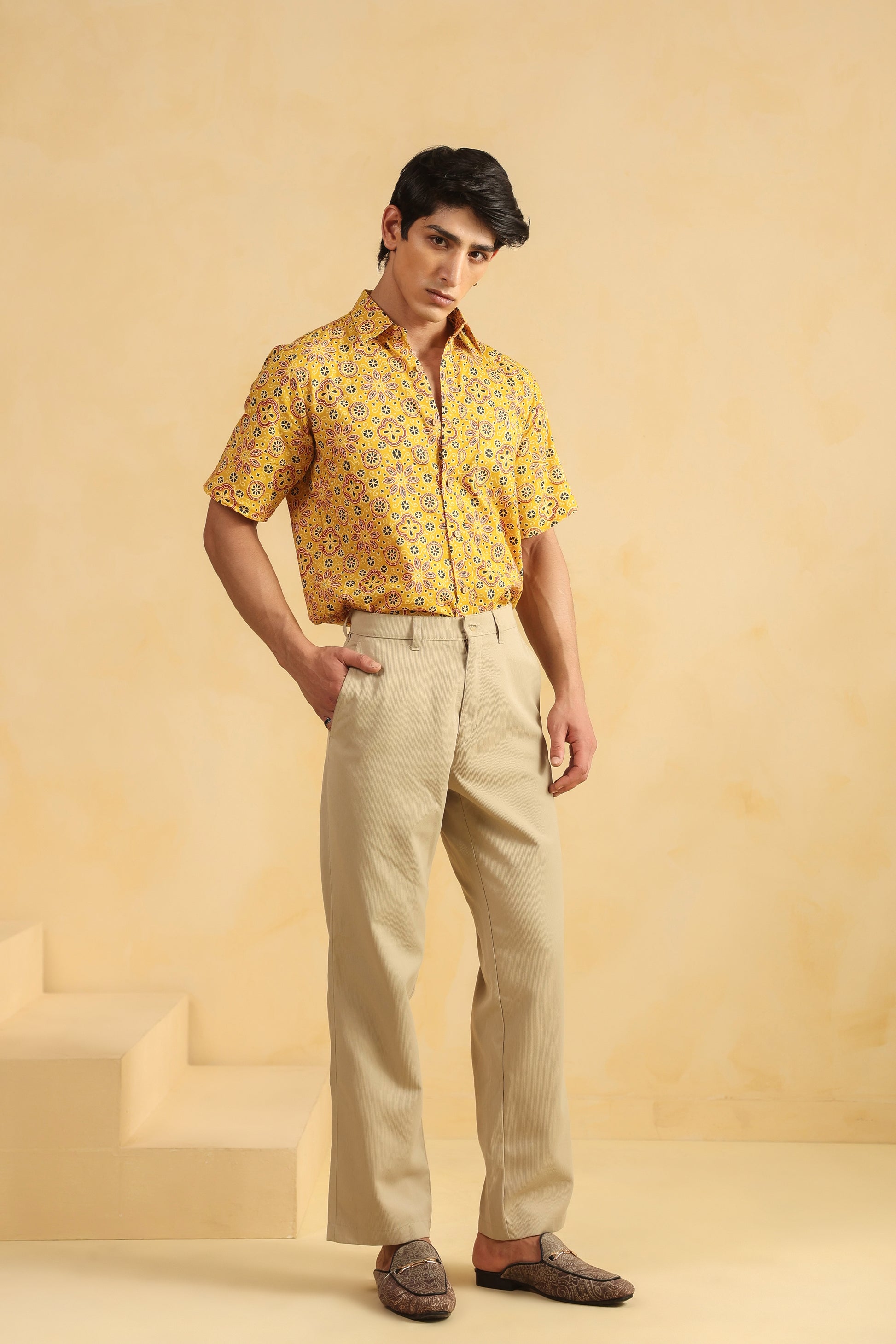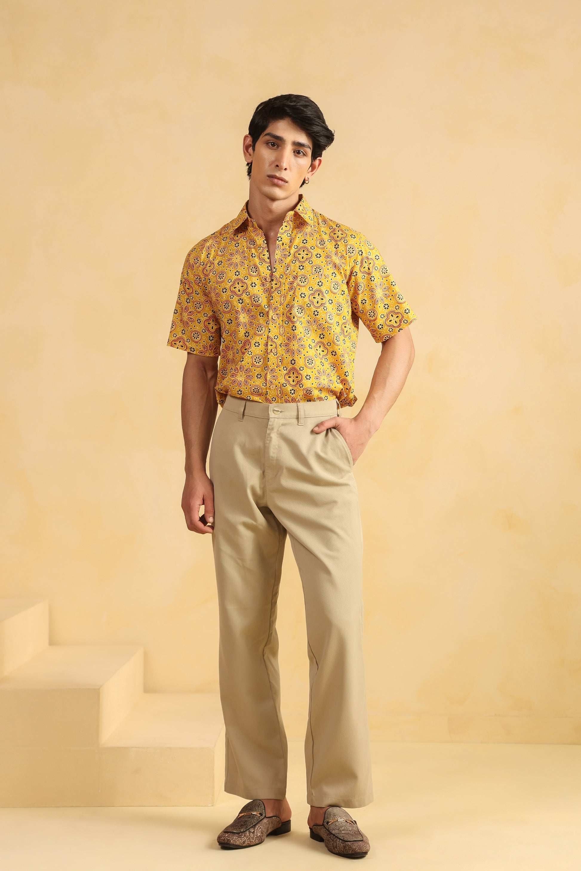 The mustard yellow isn’t just a colour. It carries the warmth of the sun and the richness of soil. The prints are drawn from Ajrakh traditions, crafted to feel timeless yet made for today. There’s harmony in the pattern, detailed but not loud, expressive yet calm. Just like the man who chooses to wear it.