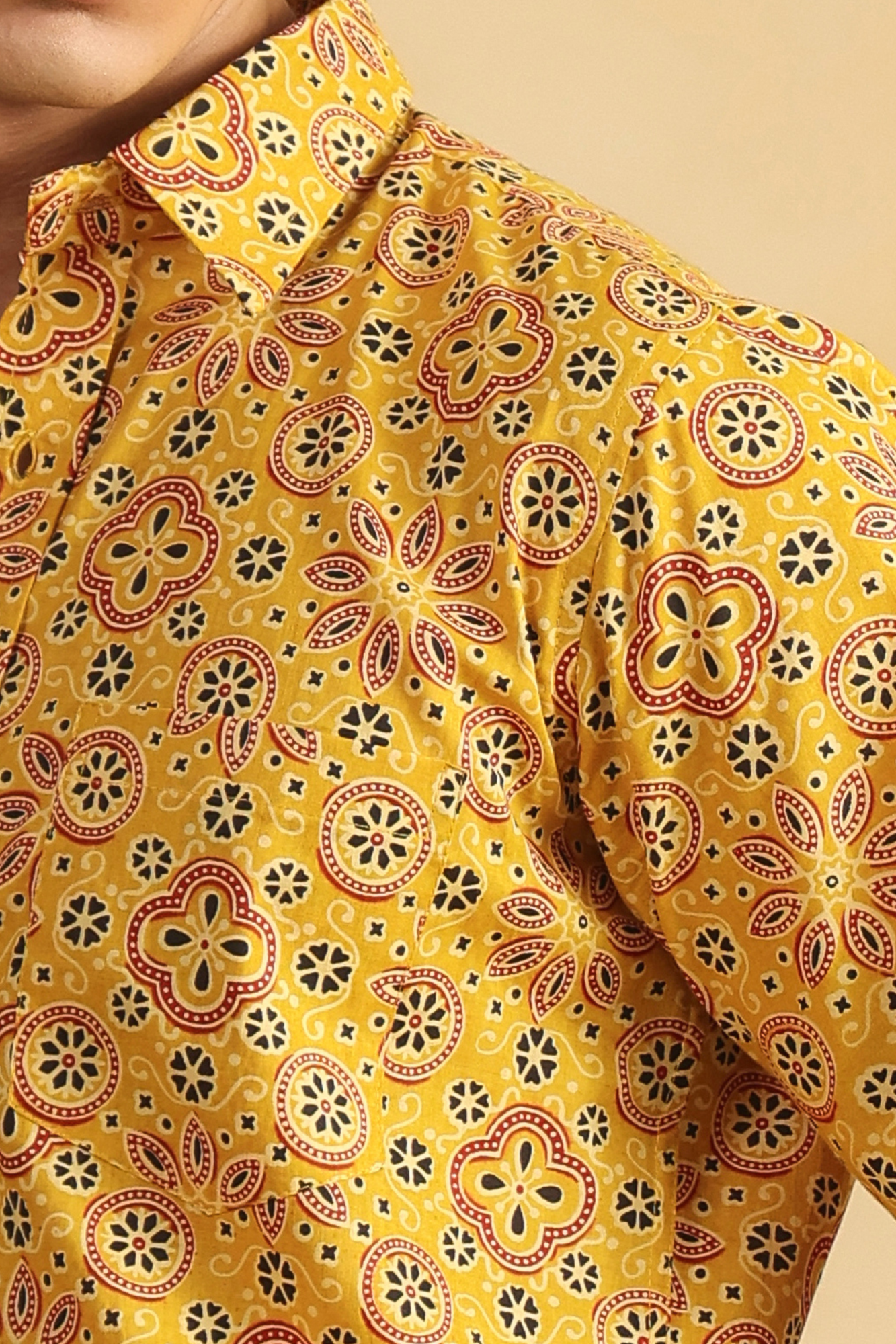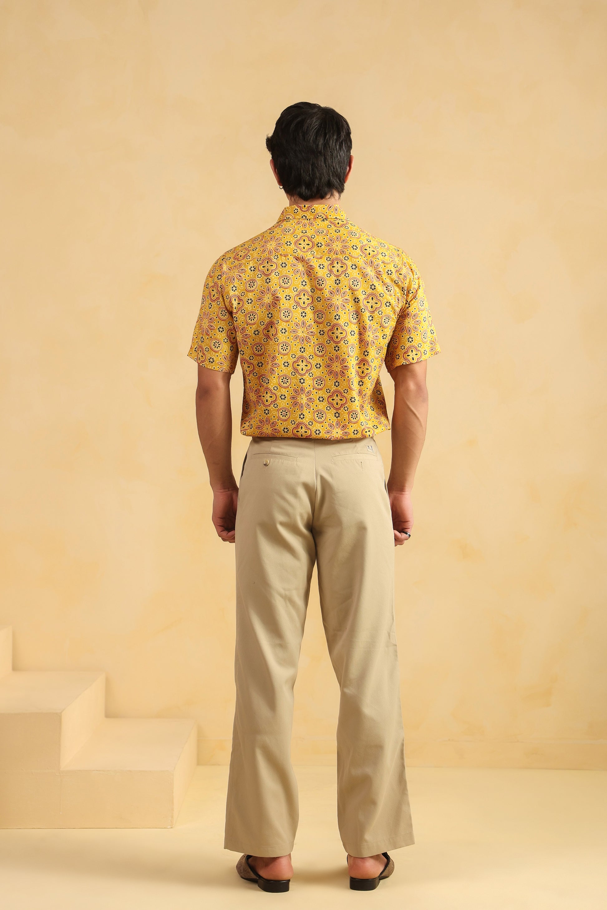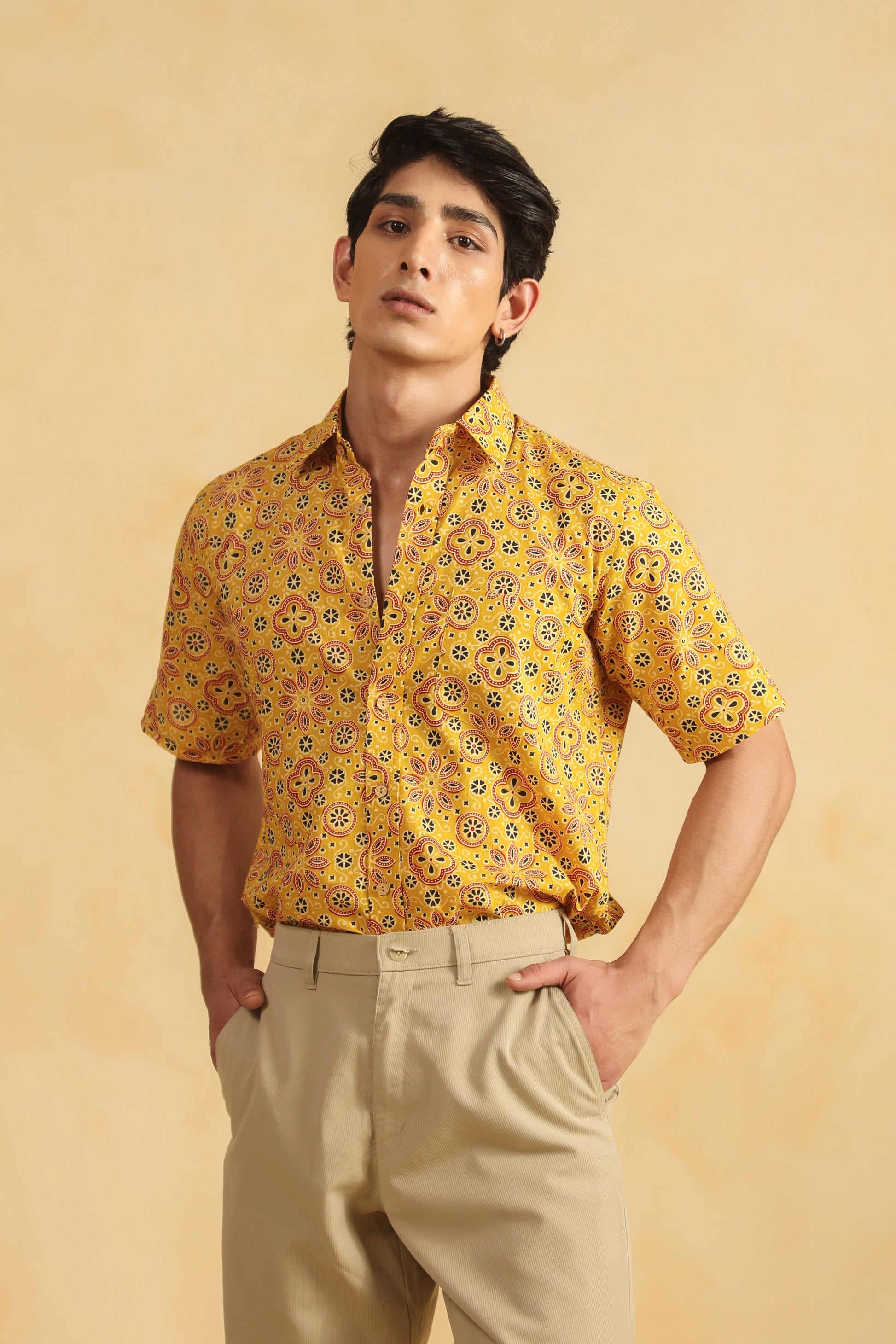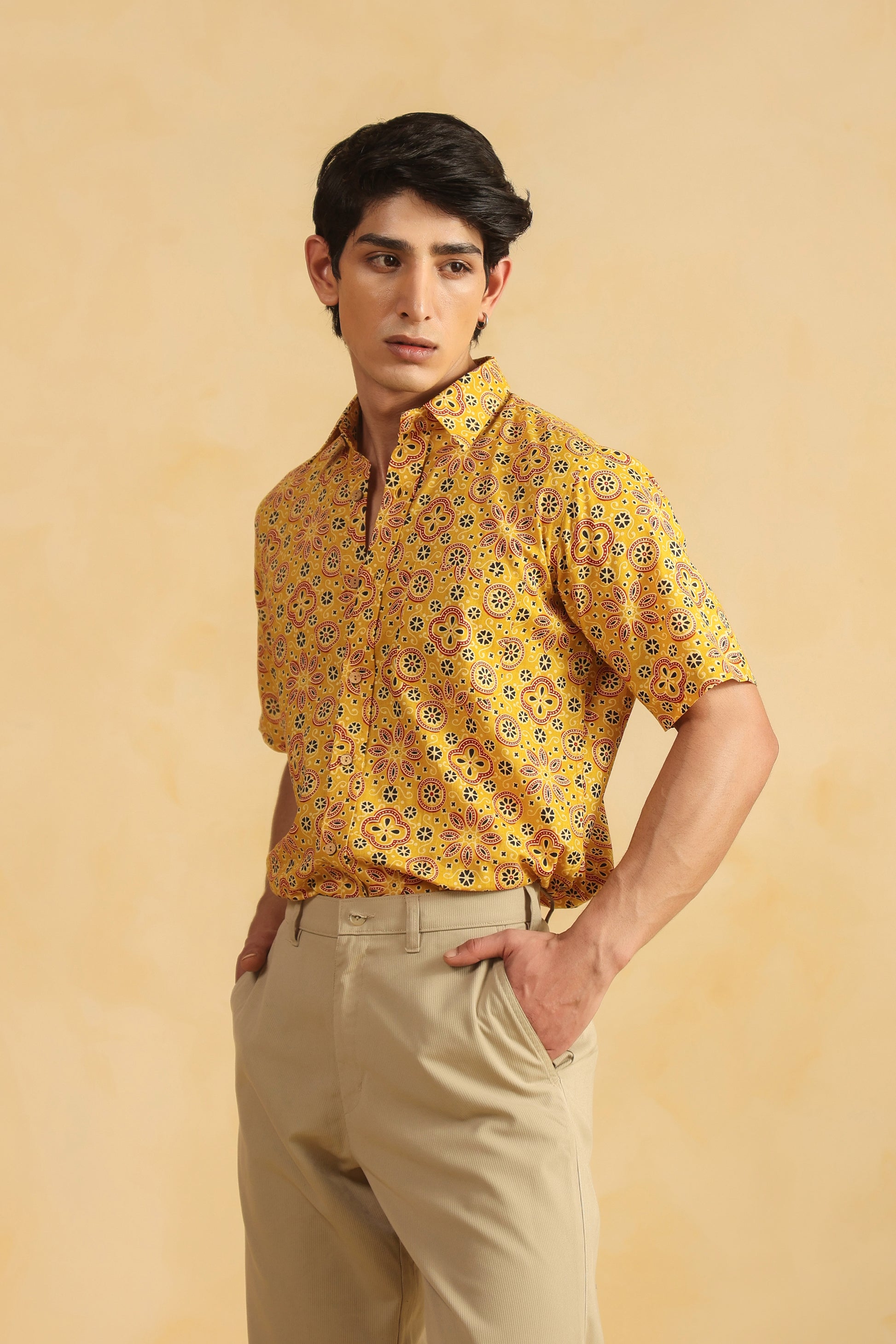 The mustard yellow isn’t just a colour. It carries the warmth of the sun and the richness of soil. The prints are drawn from Ajrakh traditions, crafted to feel timeless yet made for today. There’s harmony in the pattern, detailed but not loud, expressive yet calm. Just like the man who chooses to wear it.